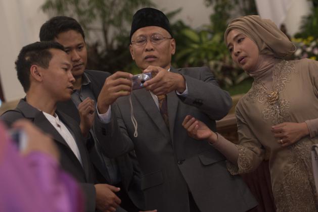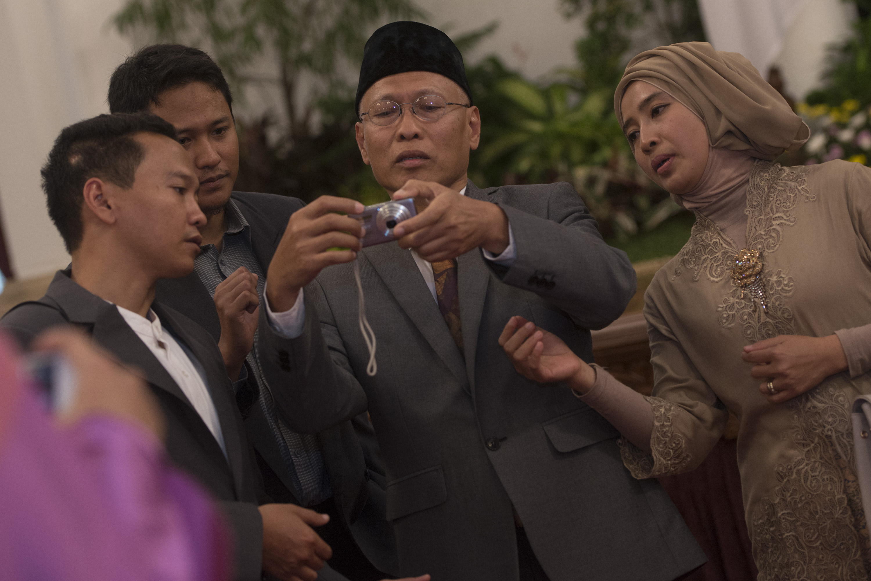 Anggota Komisi Yudisial (KY) Sumartoyo (kedua kanan) mengoperasikan kamera seusai pelantikan anggota KY di Istana Negara, Jakarta, Jumat (18/12). Presiden Joko Widodo resmi melantik lima anggota KY periode 2015-2020 yang sudah ditetapkan melalui sidang paripurna DPR. ANTARA FOTO/Rosa Panggabean/kye/15.