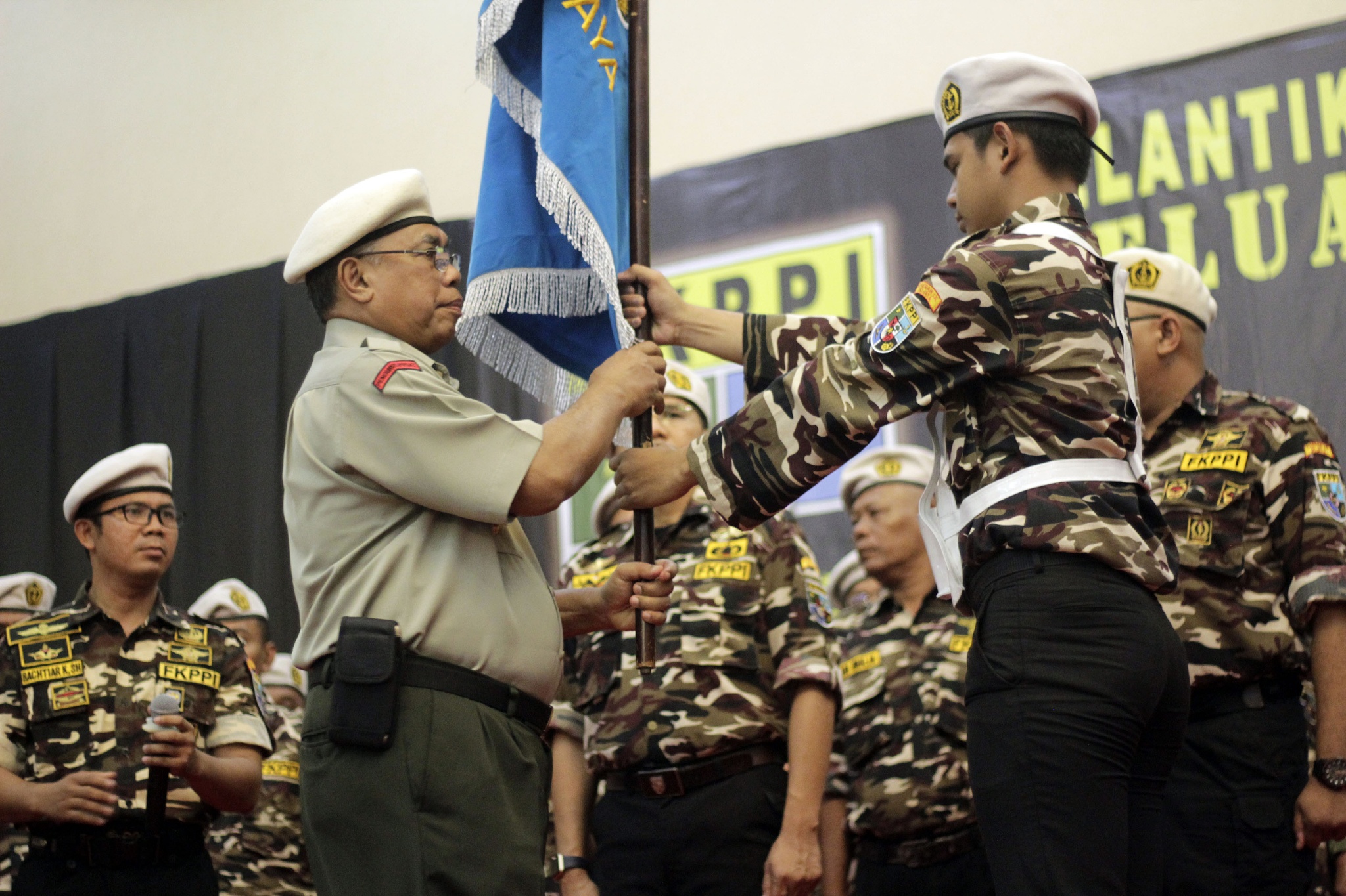 Ketua Umum FKPPI Pontjo Sutowo (kanan) memberikan bendera pataka saat acara Pelantikan dan Pengukuhan Pengurus Daerah IX FKPPI DKI Jaya Masa Bakti 2017-2022 di Jakarta, Jumat (22/9/2017). Forum Komunikasi Putra Putri Purnawirawan dan Putra Putri TNI Polri (FKPPI) DKI Jaya kembali melantik kepengurusan untuk periode masa bakti 2017-2022. Pelantikan tersebut dihadiri Mayjend Purnawirawan Nachrowi Ramli, Prasetyo Edi Marsudi, Adiguna Sutowo dan kader FKPPI. AKTUAL/Tino Oktaviano