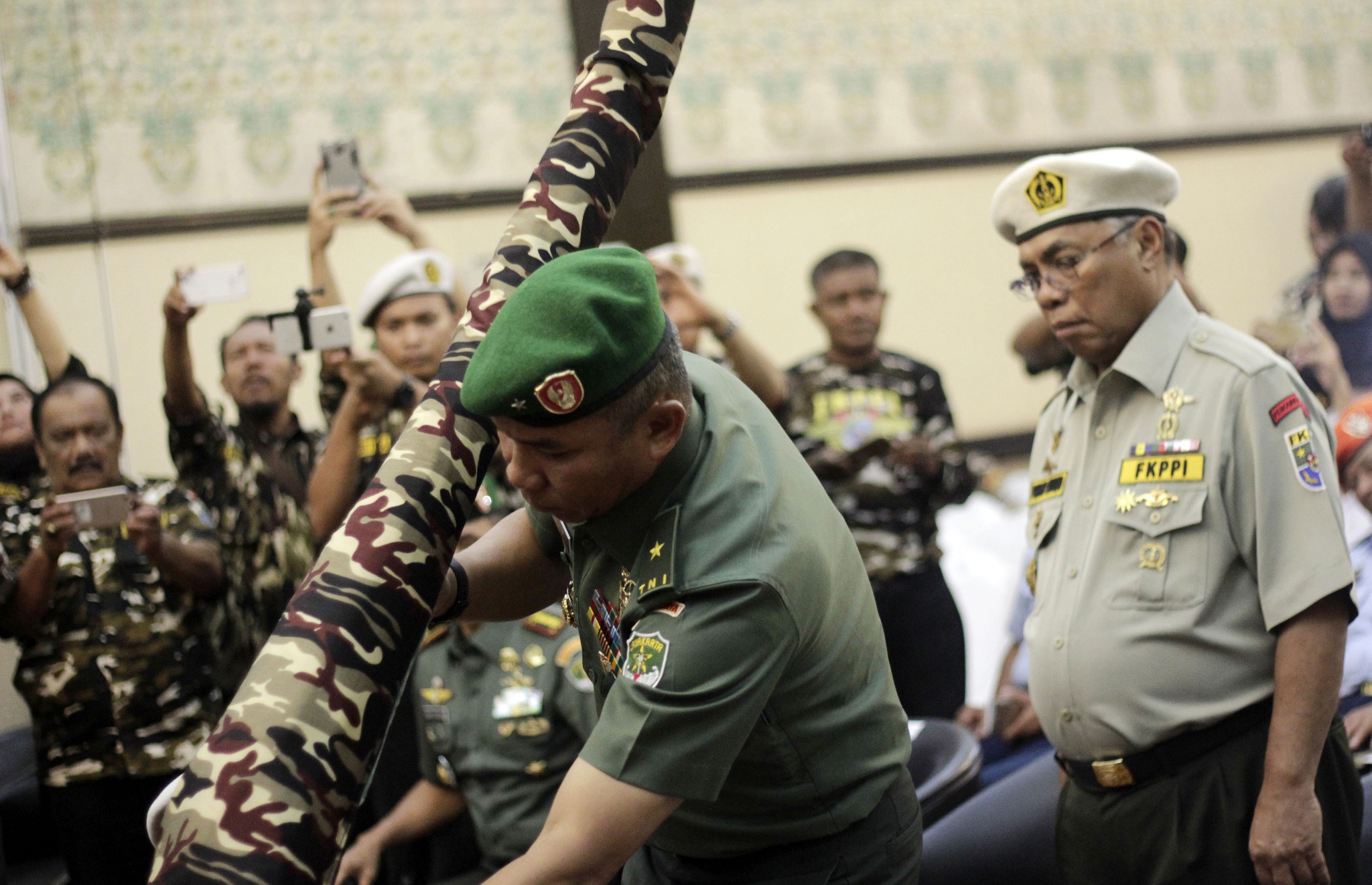 Ketua Umum FKPPI Pontjo Sutowo (kiri) membacakan ikrar saat acara Pelantikan dan Pengukuhan Pengurus Daerah IX FKPPI DKI Jaya Masa Bakti 2017-2022 di Jakarta, Jumat (22/9/2017). Forum Komunikasi Putra Putri Purnawirawan dan Putra Putri TNI Polri (FKPPI) DKI Jaya kembali melantik kepengurusan untuk periode masa bakti 2017-2022. Pelantikan tersebut dihadiri Mayjend Purnawirawan Nachrowi Ramli, Prasetyo Edi Marsudi, Adiguna Sutowo dan kader FKPPI. AKTUAL/Tino Oktaviano