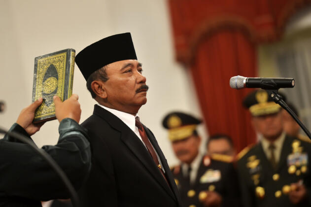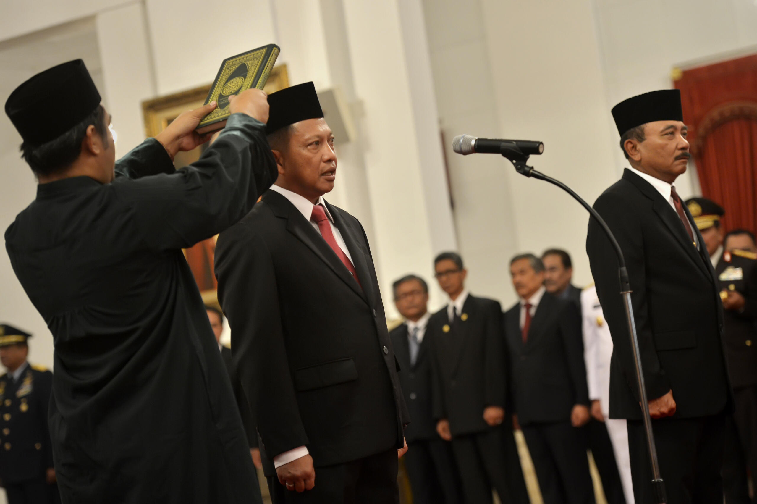Irjen Polisi Tito Karnavian (kiri) mengucapkan sumpah jabatan sebagai Kepala Badan Nasional Penanggulangan Terorisme (BNPT) bersama Laksamana Muda TNI Arie Soedewo (kanan) sebagai Kepala Badan Keamanan Laut (Bakamla) yang dipimpin oleh Presiden Joko Widodo di Istana Negara, Jakarta, Selasa (16/3). Irjen Pol.Tito Karnavian sebelumnya menjabat sebagai Kapolda Metro Jaya, sedangkan Laksamana Muda TNI Arie Soedewo menjabat Asops Kasal sejak 18 Agustus 2015. ANTARA FOTO/Yudhi Mahatma/pd/16