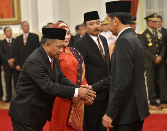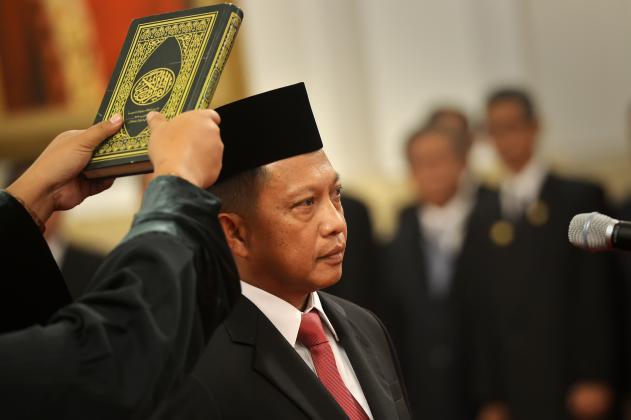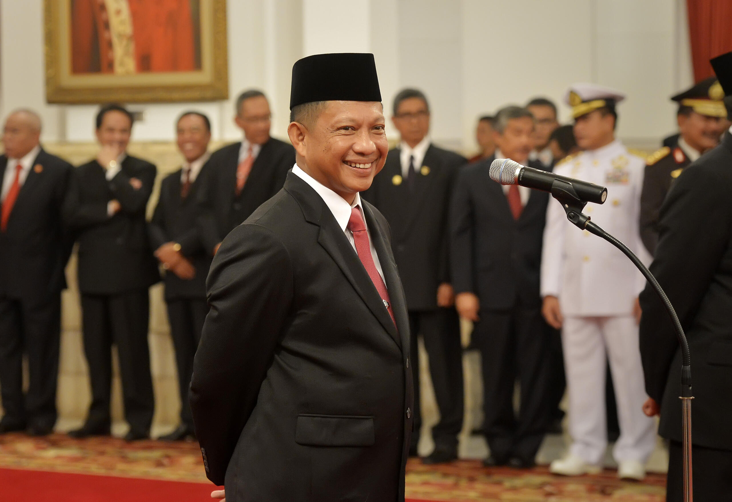 Irjen Polisi Tito Karnavian mengikuti upacara pengucapan sumpah jabatan sebagai Kepala Badan Nasional Penanggulangan Terorisme (BNPT) yang dipimpin oleh Presiden Joko Widodo di Istana Negara, Jakarta, Selasa (16/3). Irjen Pol.Tito Karnavian sebelumnya menjabat Kapolda Metro Jaya. ANTARA FOTO/Yudhi Mahatma/pd/16