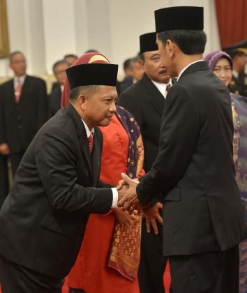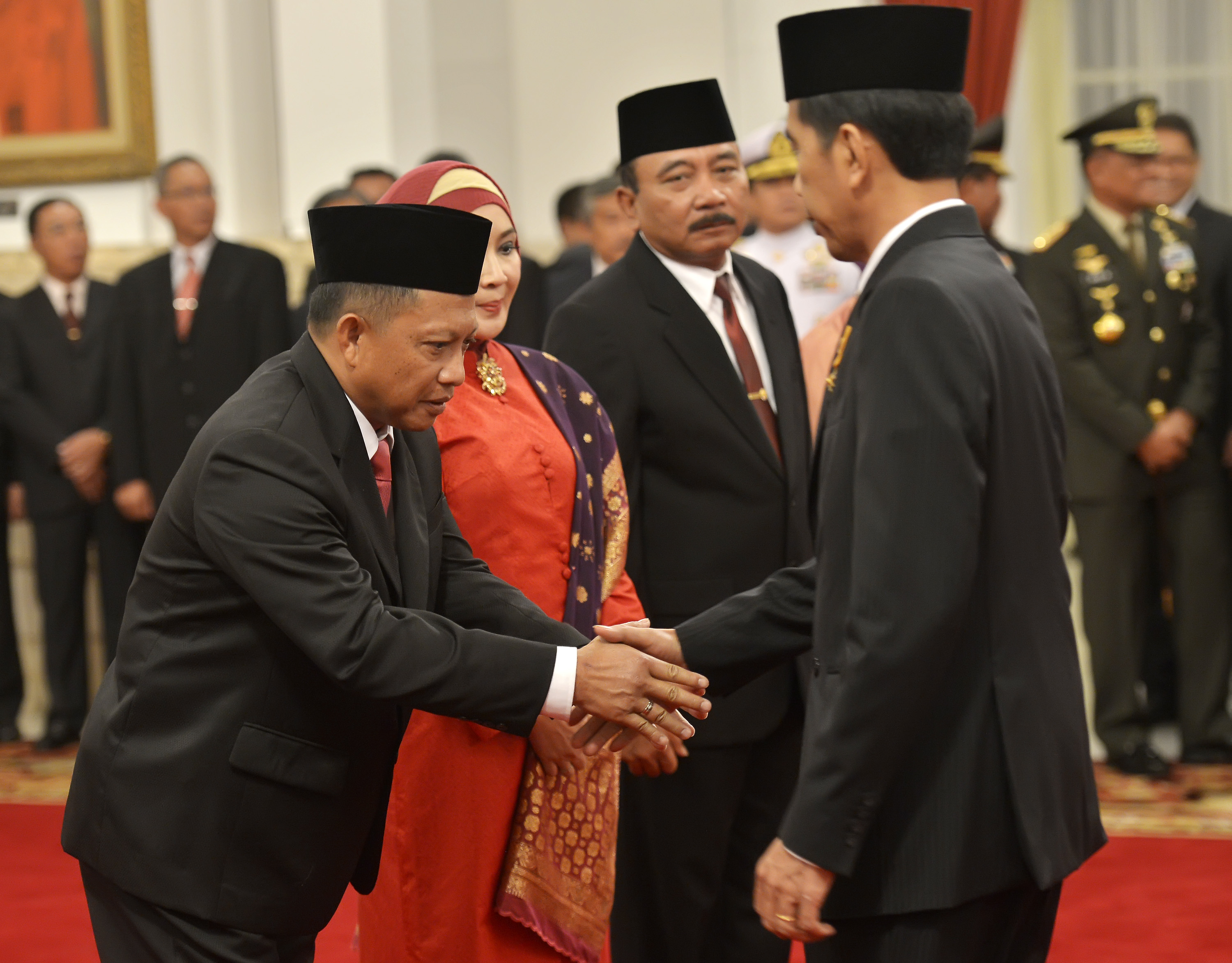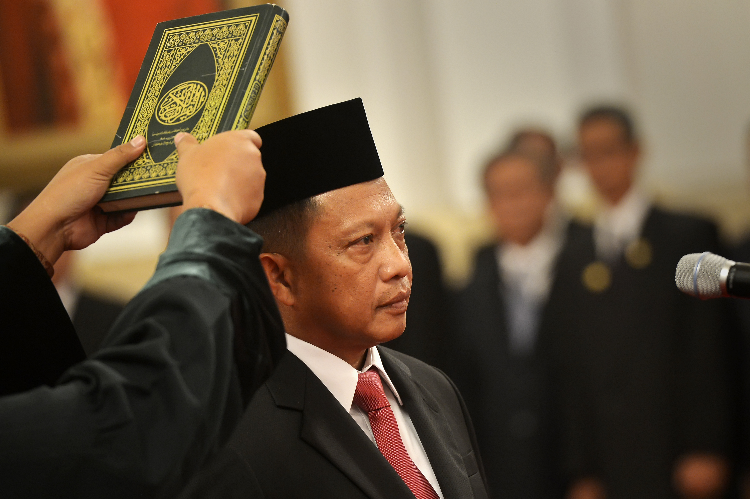 Irjen Polisi Tito Karnavian mengucapkan sumpah jabatan sebagai Kepala Badan Nasional Penanggulangan Terorisme (BNPT) yang dipimpin oleh Presiden Joko Widodo di Istana Negara, Jakarta, Selasa (16/3). Irjen Pol.Tito Karnavian sebelumnya menjabat sebagai Kapolda Metro Jaya. ANTARA FOTO/Yudhi Mahatma/pd/16