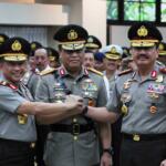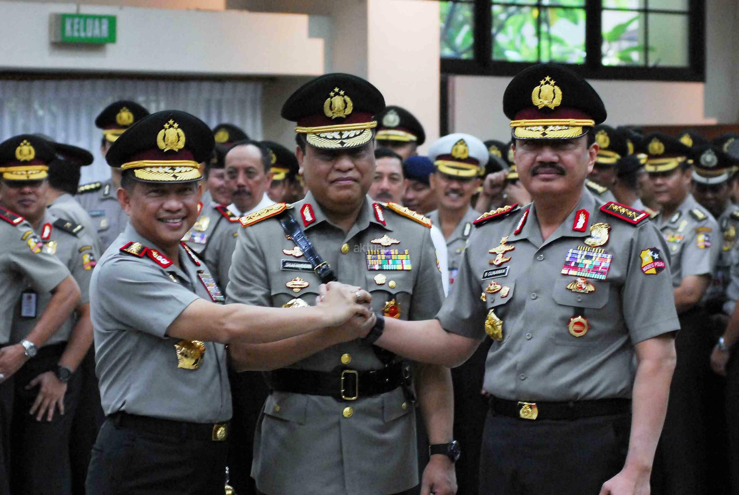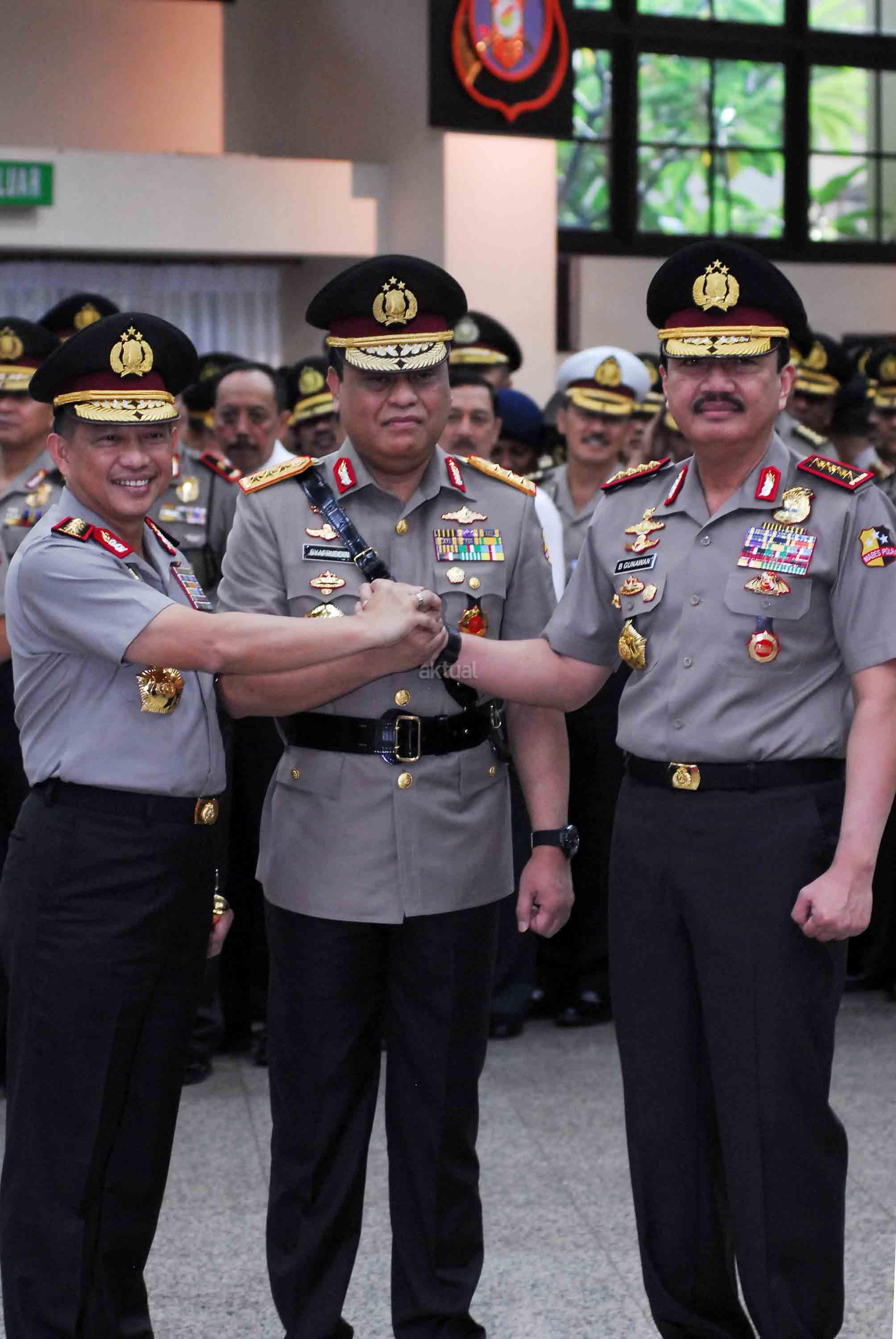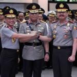 Kapolri Jenderal Pol. Tito Karnavian (kiri) berjabat tangan dengan Kepala BIN Jenderal Pol. Budi Gunawan (kanan) dan Wakil Kapolri Komjen Pol. Syafruddin (tengah) usai Pelantikan Wakil Kapolri di Mabes Polri, Jakarta, Sabtu (10/9). Komjen Pol. Syafruddin dilantik menjadi Wakil Kapolri menggantikan Jenderal Pol. Budi Gunawan yang ditunjuk Presiden Joko Widodo menjadi Kepala BIN. AKTUAL/TINO OKTAVIANO