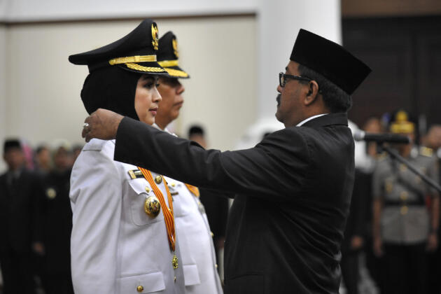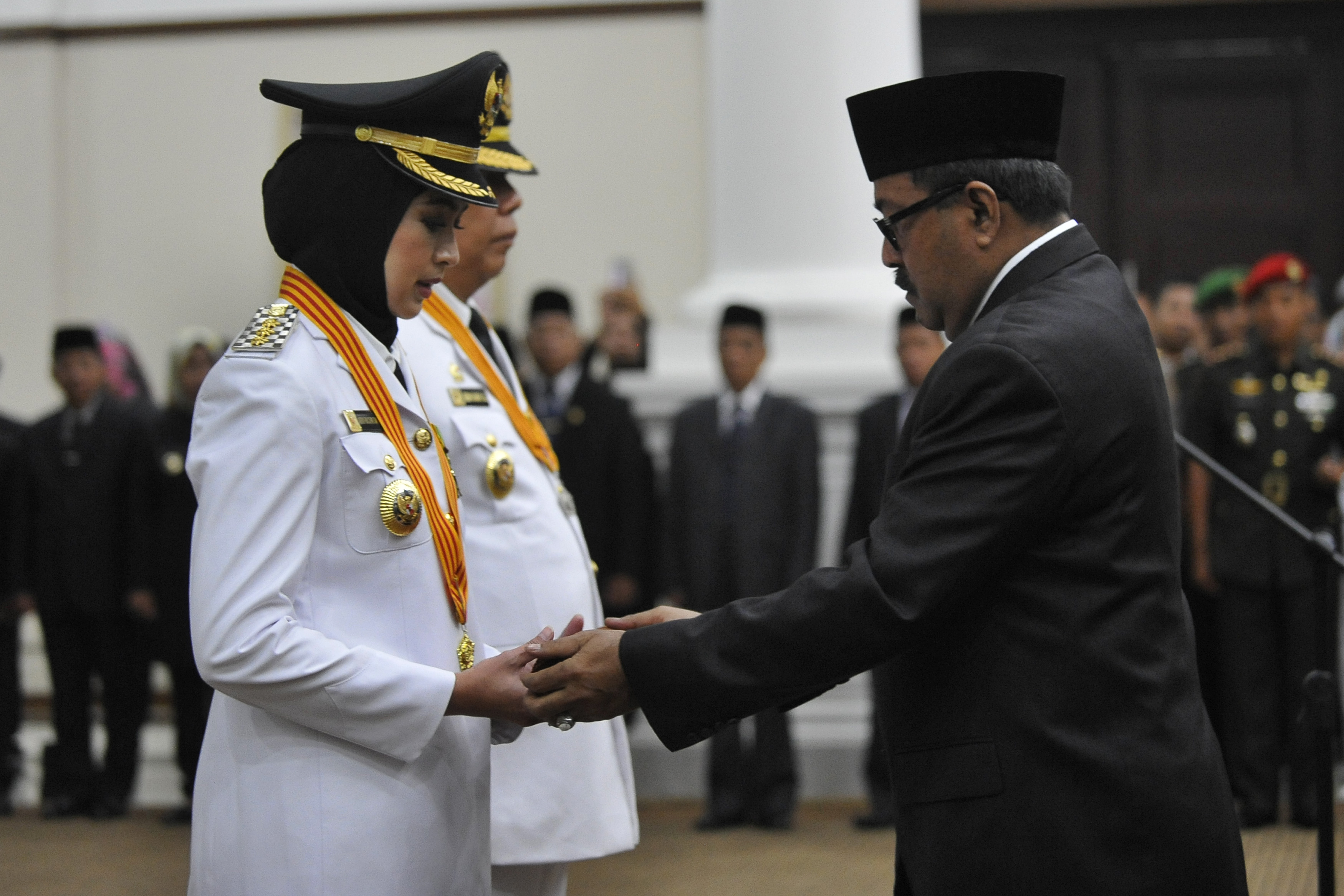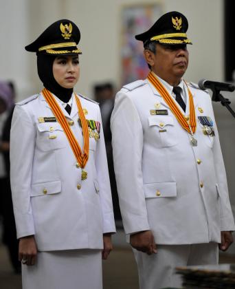 Gubernur Banten Rano Karno (kanan) memasang tanda jabatan di pundak Wali Kota Tangerang Selatan terpilih Airin Rachmi Diany (kiri) pada Upacara Pelantikan Wali Kota dan Wakil Wali Kota Tangsel periode 2016-2021 di Serang, Banten, Rabu (20/4). Pasangan Airin Rachmi Diany - Benyamin Davnie yang meraih 305.322 suara dilantik setelah mengalahkan dua pasangan calon lain yaitu Ikhsan-Claudia (meraih 164.732 suara) dan pasangan Arsid-Elvier Ariadiannie (42.074 suara). ANTARA FOTO/Asep Fathulrahman/foc/16.