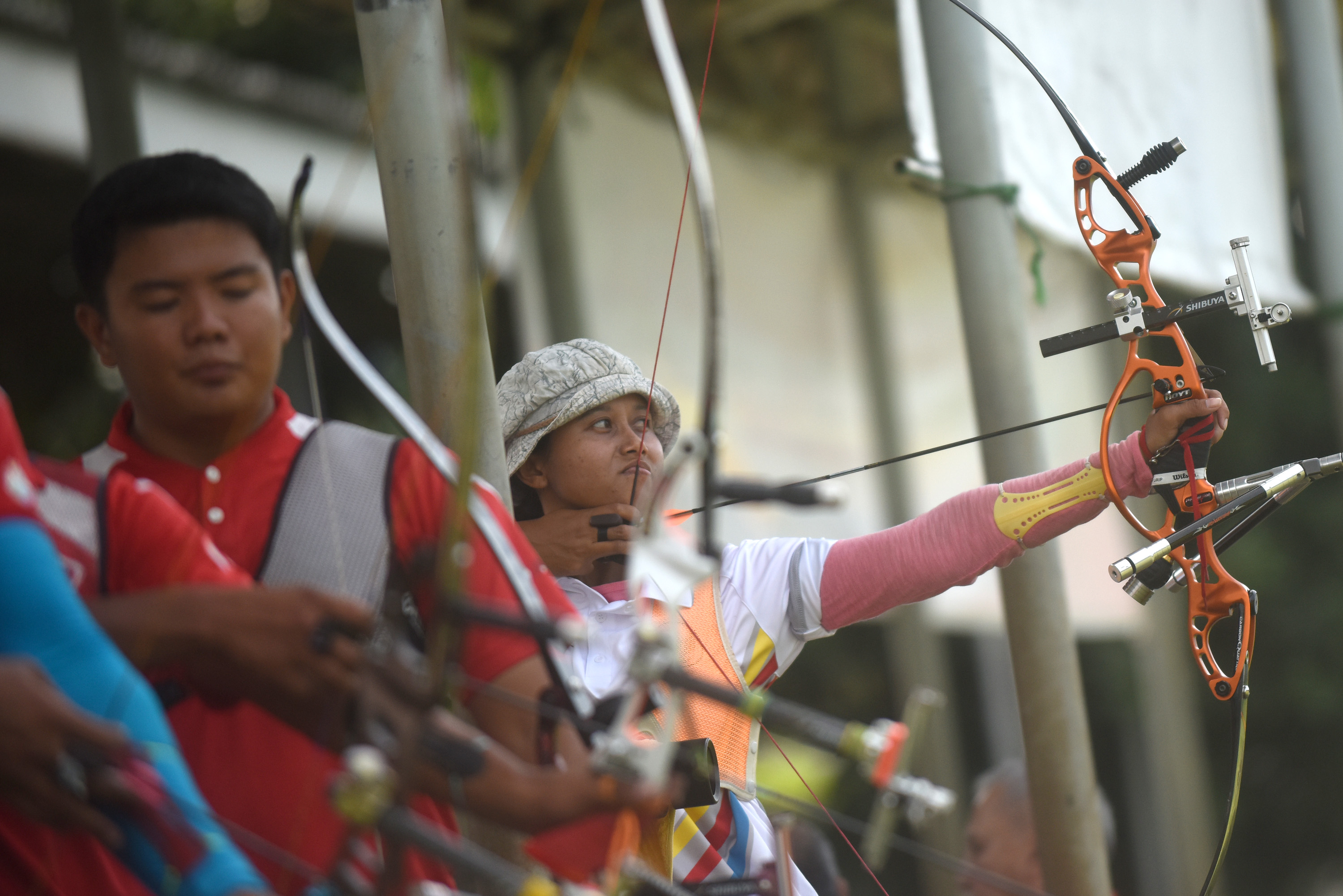 Atlet panahan (kiri ke kanan) Riau Ega Salsabila, Hendra Purnama, Muhammad Hanif Wijaya dan Ika Yuliana Rochmawati mengikuti pemusatan latihan jelang Olimpiade Rio, Brasil di Senayan, Jakarta, Senin (25/7). Sebanyak empat atlet panahan akan bertanding pada nomor perorangan putri dan Tim Recurve Putra pada Olimpiade Rio mendatang. ANTARA FOTO/Wahyu Putro A/foc/16.