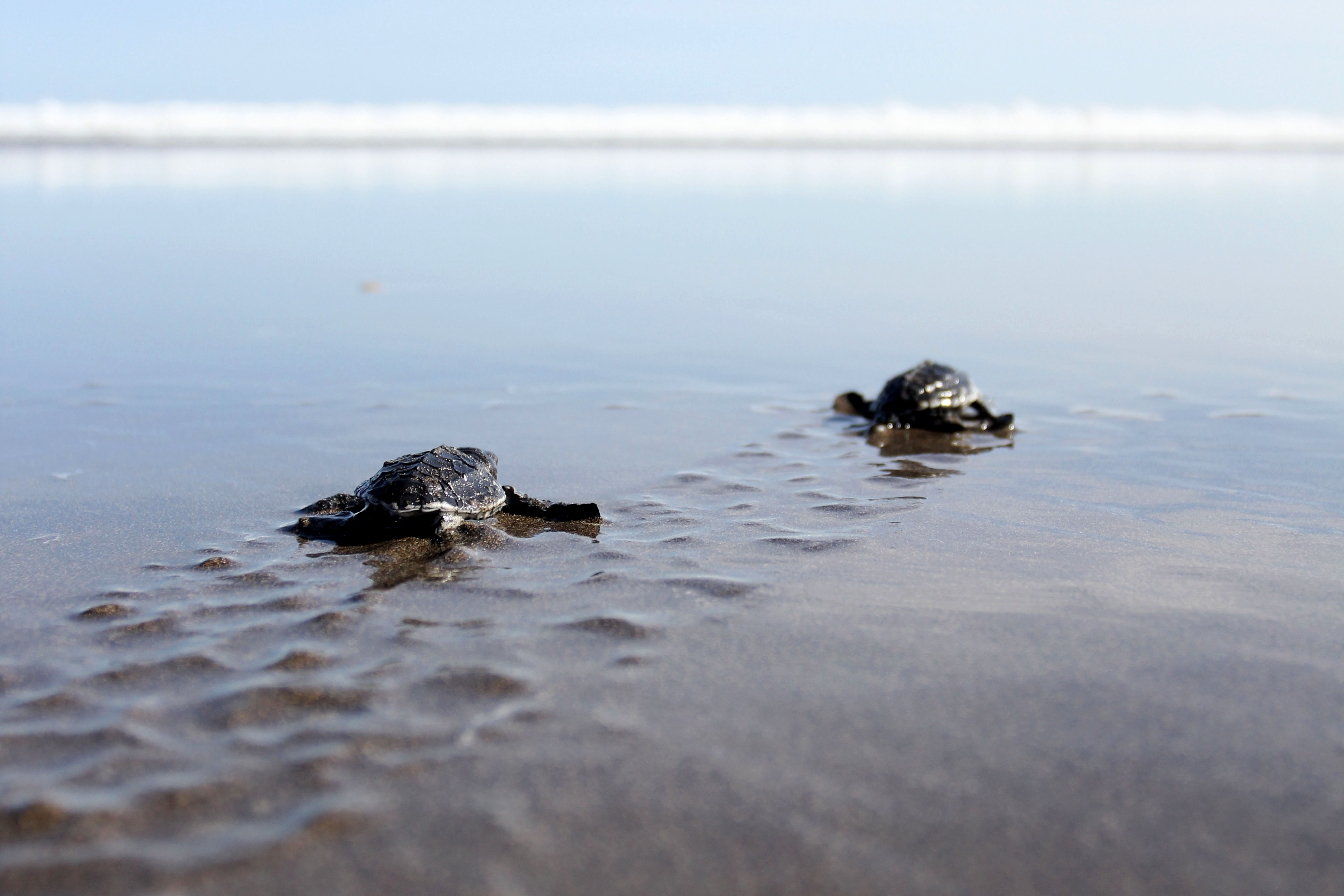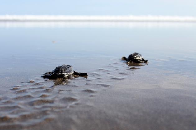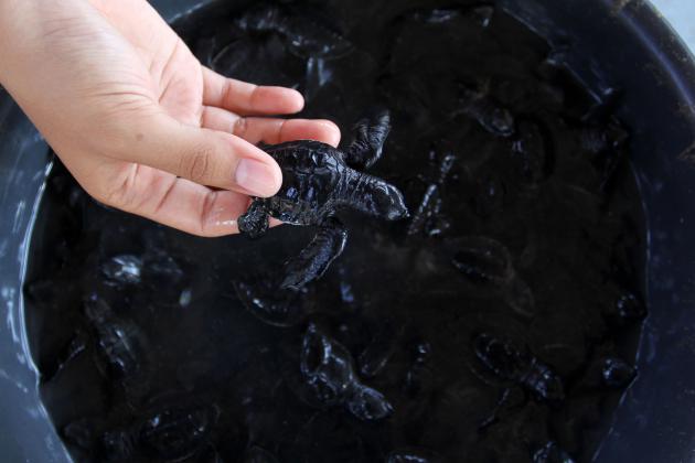 Dua ekor tukik hasil penangkaran dilepaskan wisatawan di Pantai Ngagelan, Taman Nasional Alas Purwo, Banyuwangi, Jawa Timur, Minggu (22/5). Pelepasliaran anak penyu tersebut guna melestarikan keanekaragaman hayati di kawasan taman nasional seluas 43.420 hektar yang terletak di ujung Banyuwangi yang langsung berhadapan dengan laut dan di seberangnya adalah Pulau Bali itu. ANTARA FOTO/ Budi Candra Setya/aww/16.