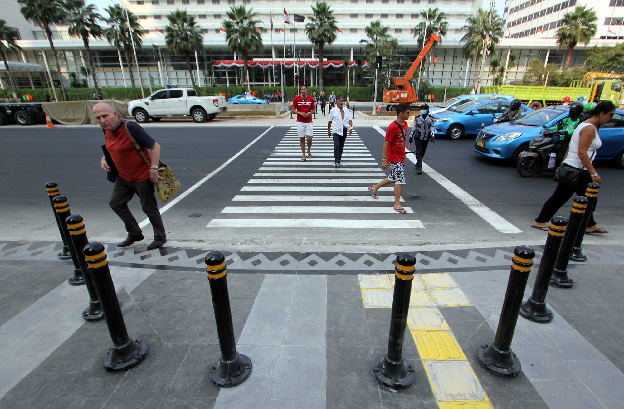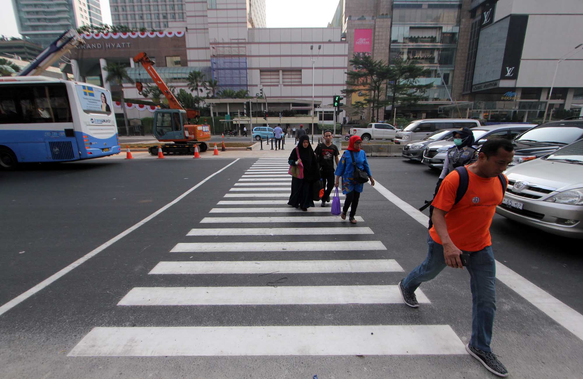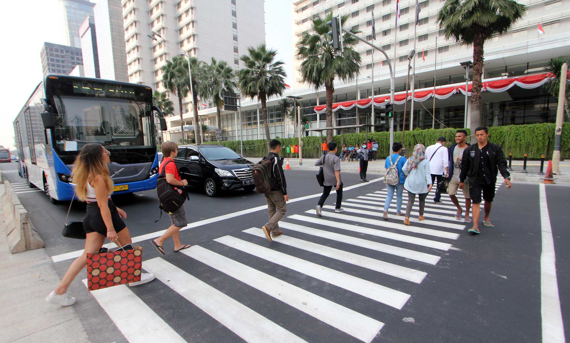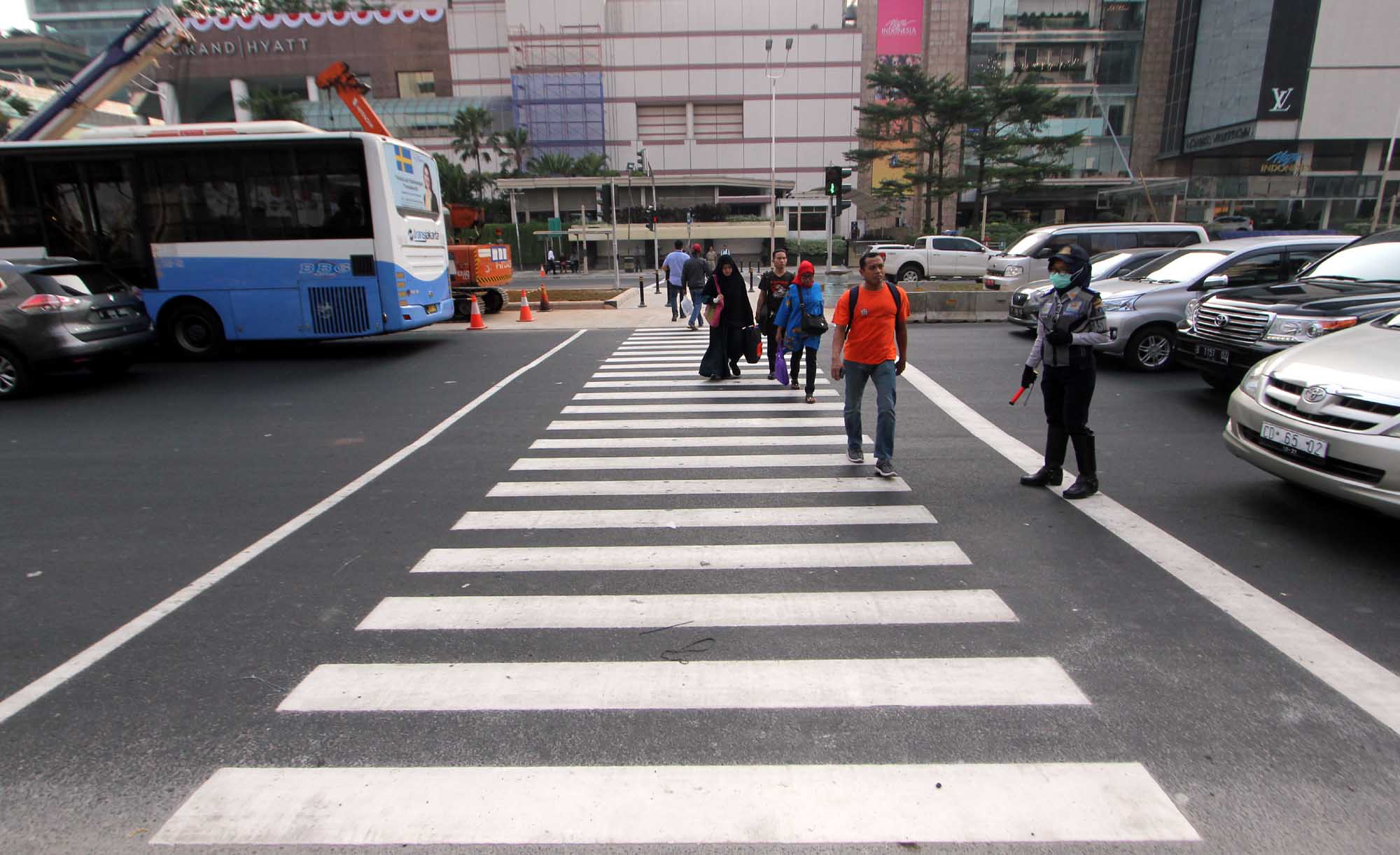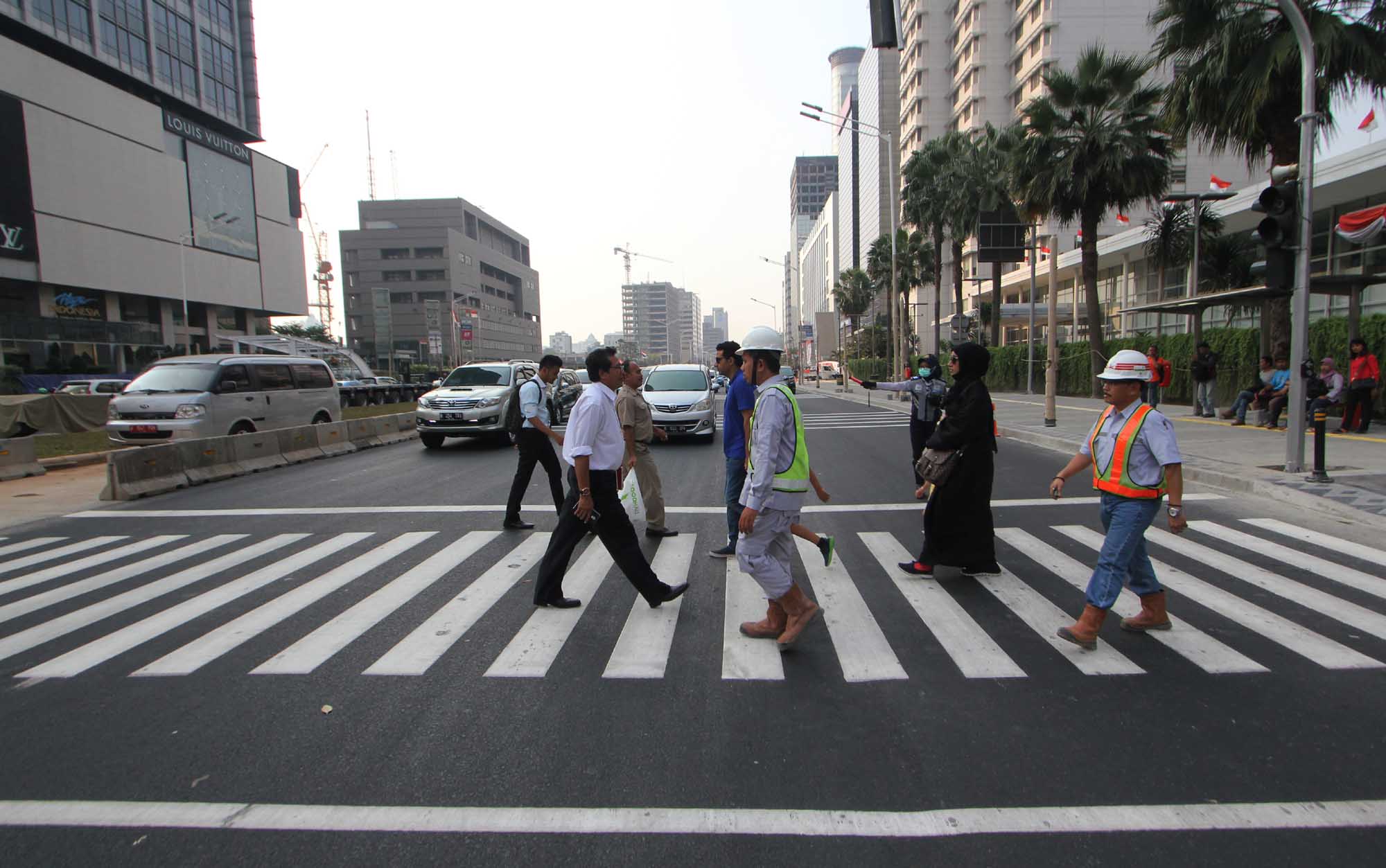 Pejalan kaki melintasi Pelican Crossing untuk menyebrang di Bundaran HI, Jakarta, Senin (30/7). Pelican Crossing tersebut difungsikan sebagai pengganti Jembatan Penyebrangan Orang (JPO) secara sementara, nantinya dilokasi tersebut akan dibangun penyebrangan bawah tanah. AKTUAL/Tino Oktaviano
