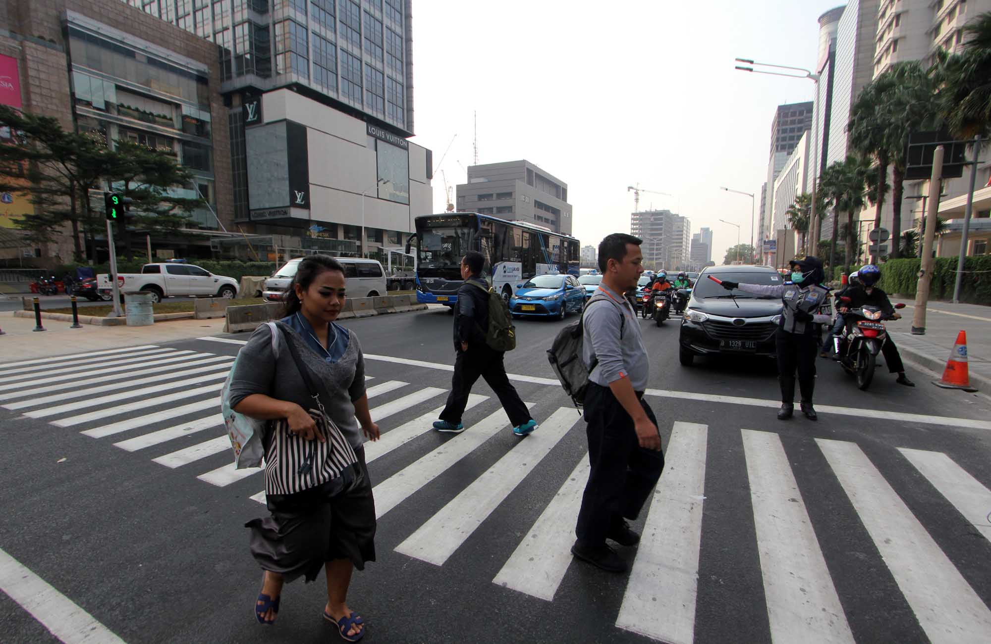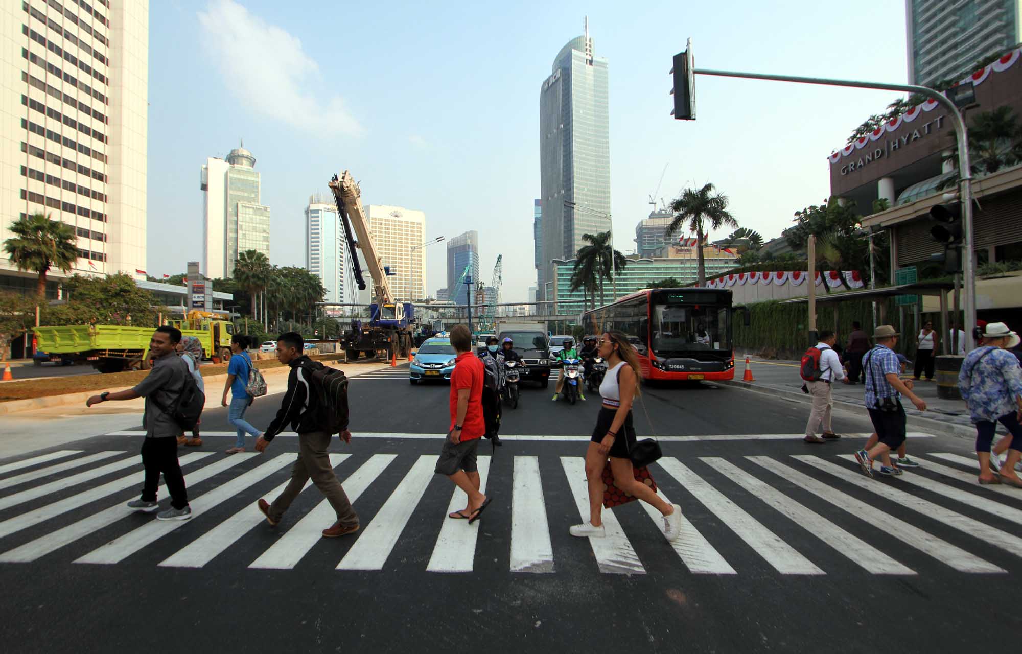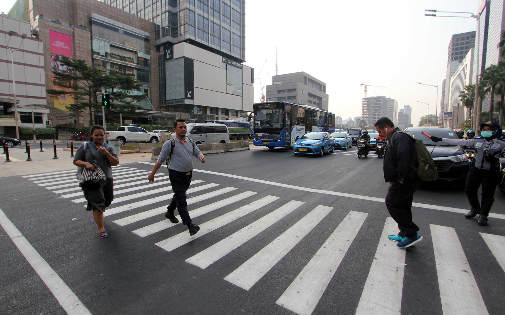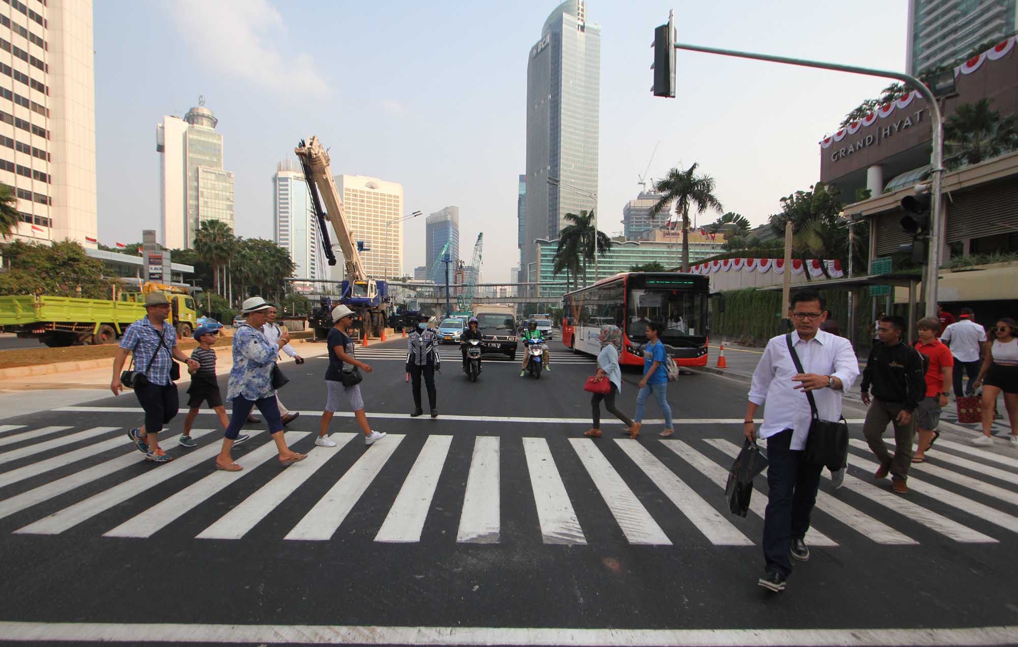 Pejalan kaki melintasi Pelican Crossing untuk menyebrang di Bundaran HI, Jakarta, Senin (30/7). Pelican Crossing tersebut difungsikan sebagai pengganti Jembatan Penyebrangan Orang (JPO) secara sementara, nantinya dilokasi tersebut akan dibangun penyebrangan bawah tanah. AKTUAL/Tino Oktaviano