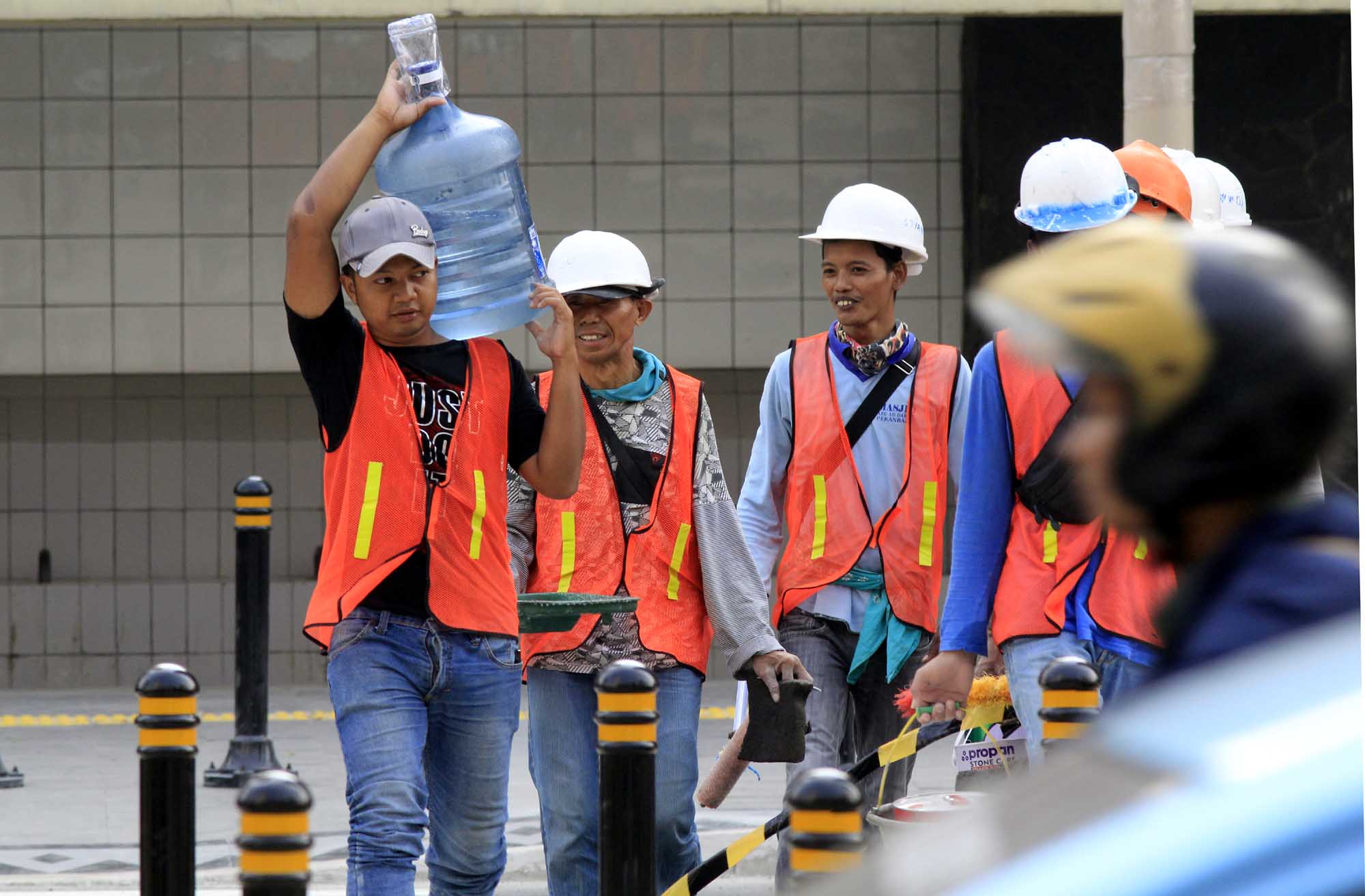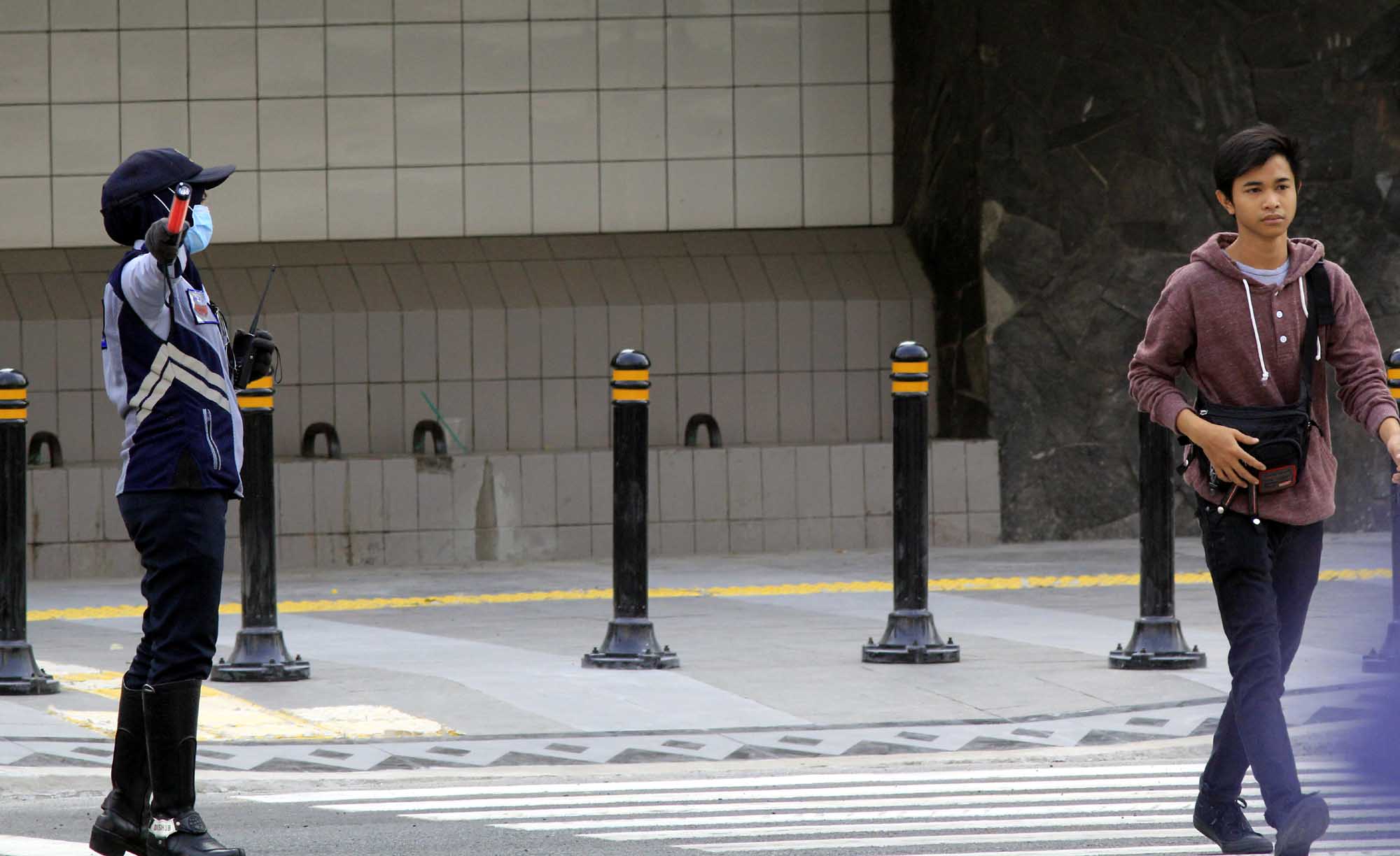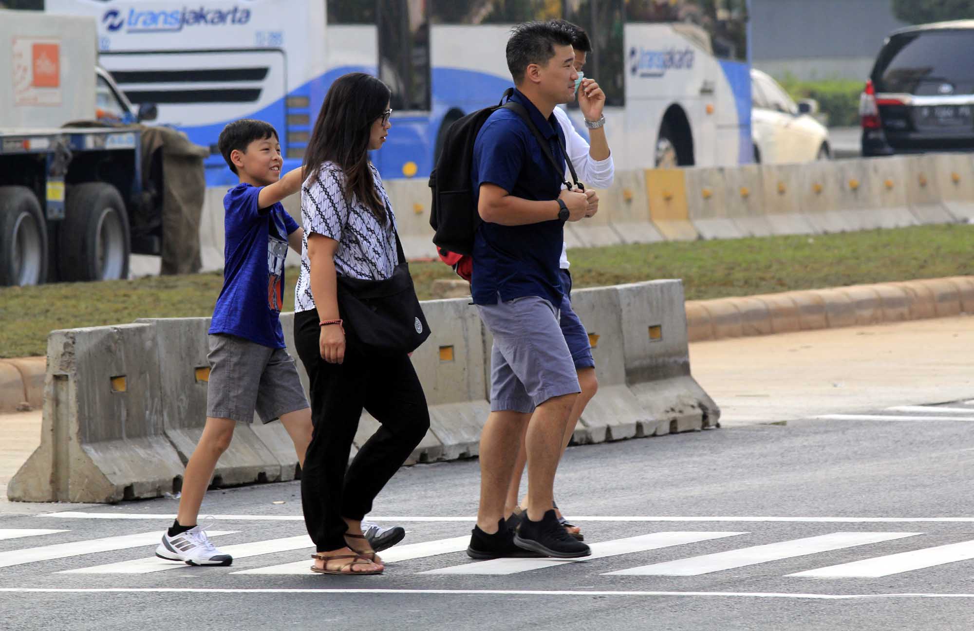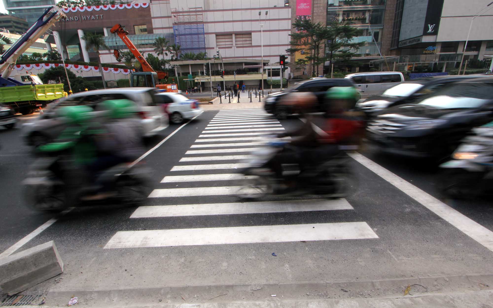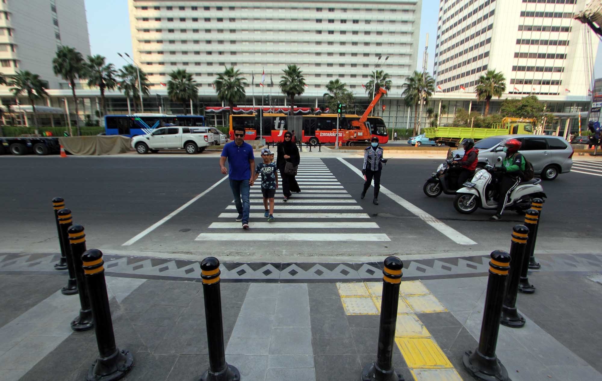 Pejalan kaki melintasi Pelican Crossing untuk menyebrang di Bundaran HI, Jakarta, Senin (30/7). Pelican Crossing tersebut difungsikan sebagai pengganti Jembatan Penyebrangan Orang (JPO) secara sementara, nantinya dilokasi tersebut akan dibangun penyebrangan bawah tanah. AKTUAL/Tino Oktaviano