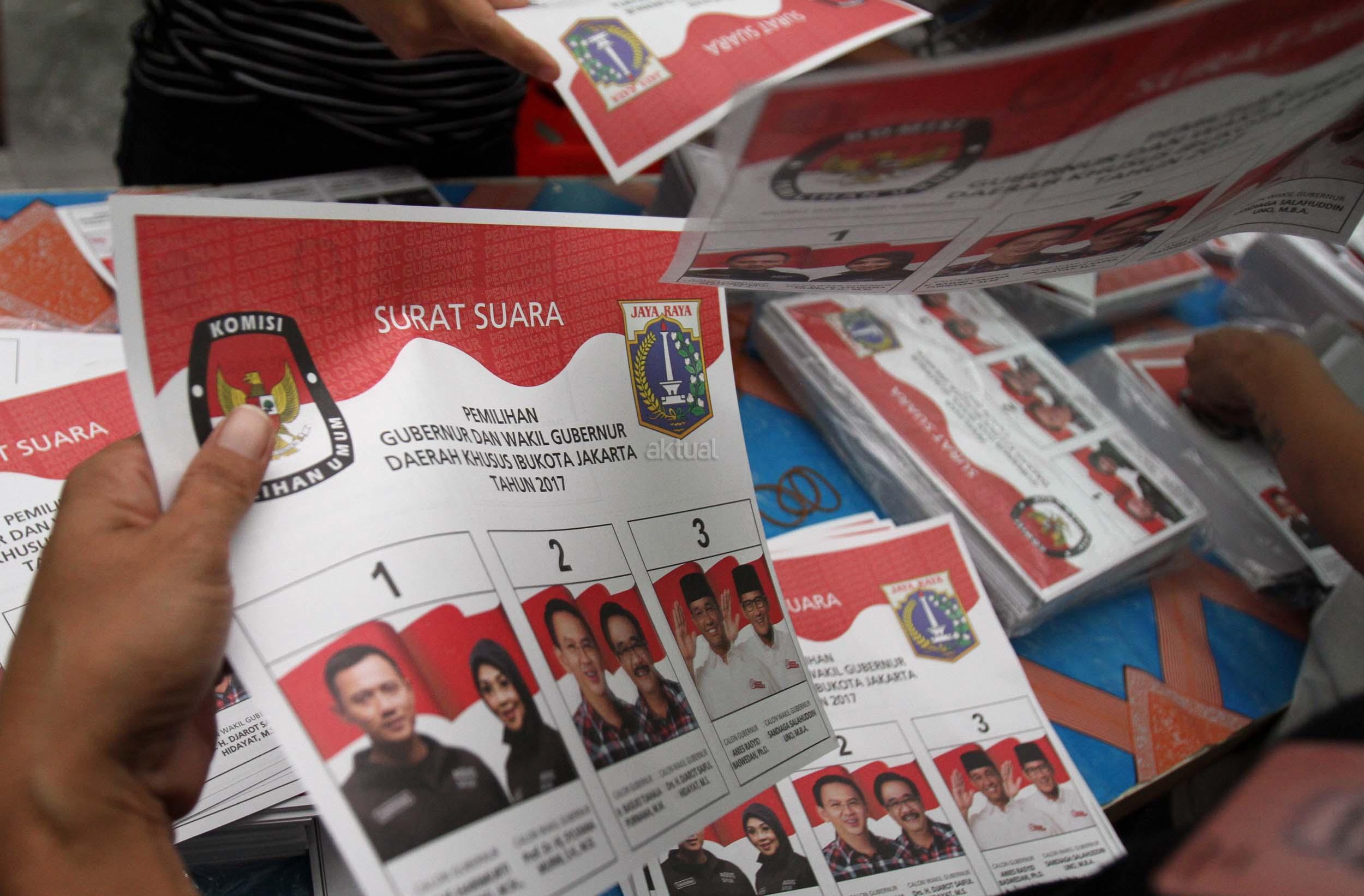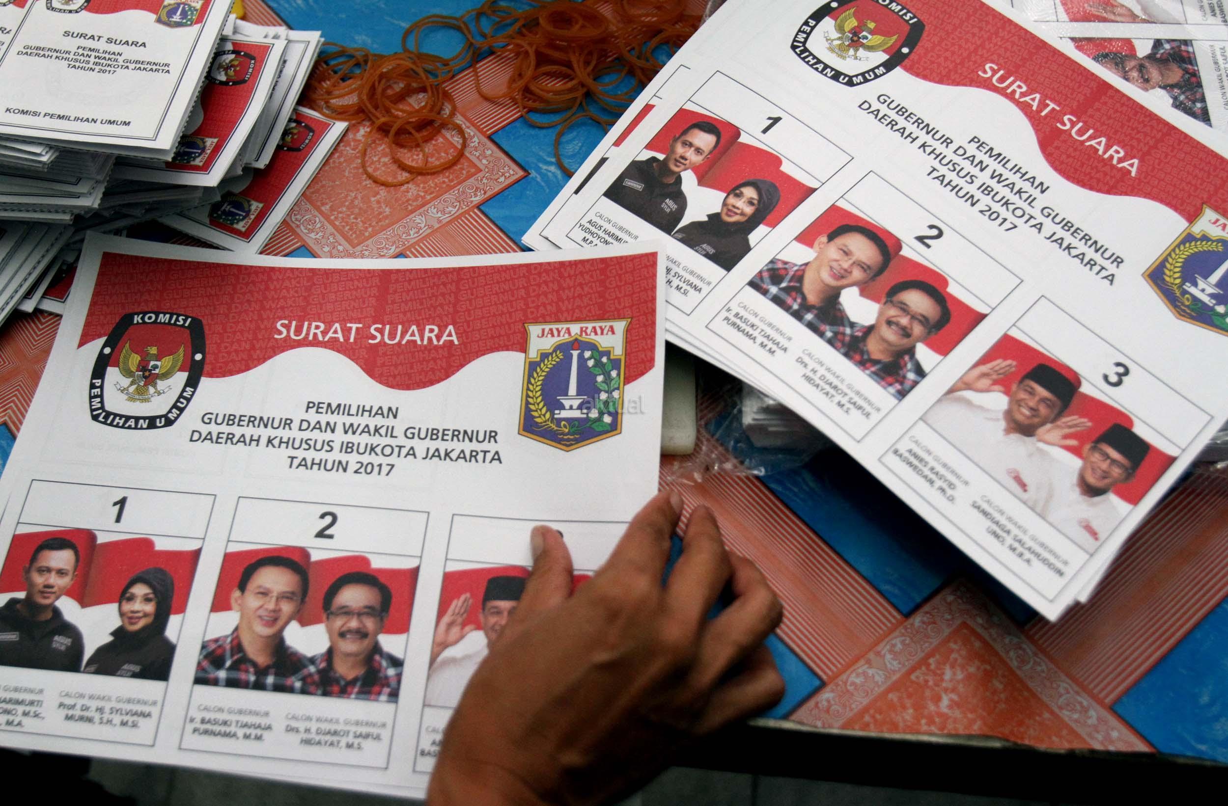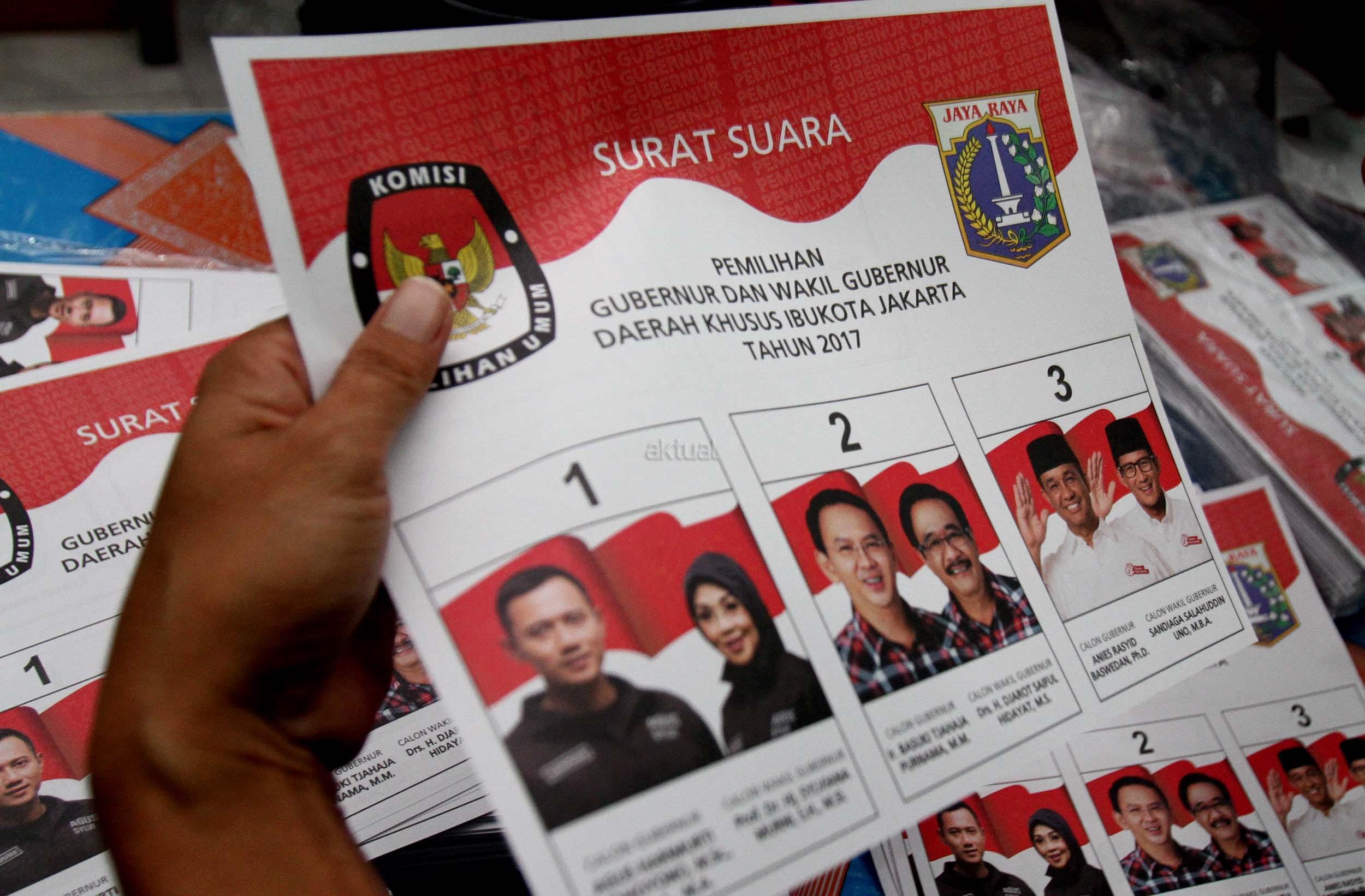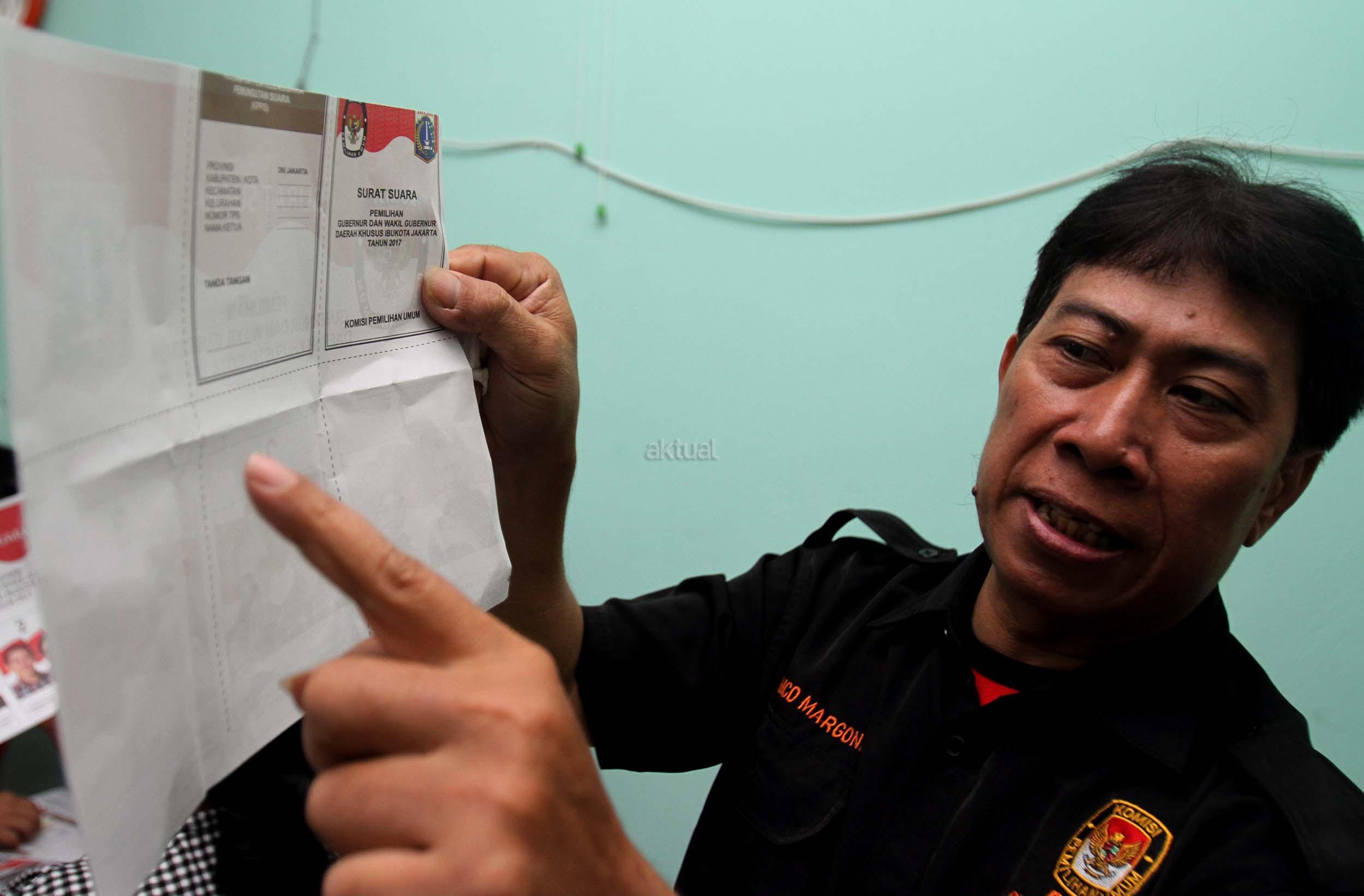 Petugas KPU DKI Jakarta menunjukan salah satu kertas suara Pilkada DKI Jakarta di gudang Logistik KPU DKI Jakarta, Selasa (24/1/2017). Surat suara Pilkada DKI Jakarta diproduksi di Makassar, Sulawesi Selatan dan dikirim melalui kapal laut. AKTUAL/Munzir