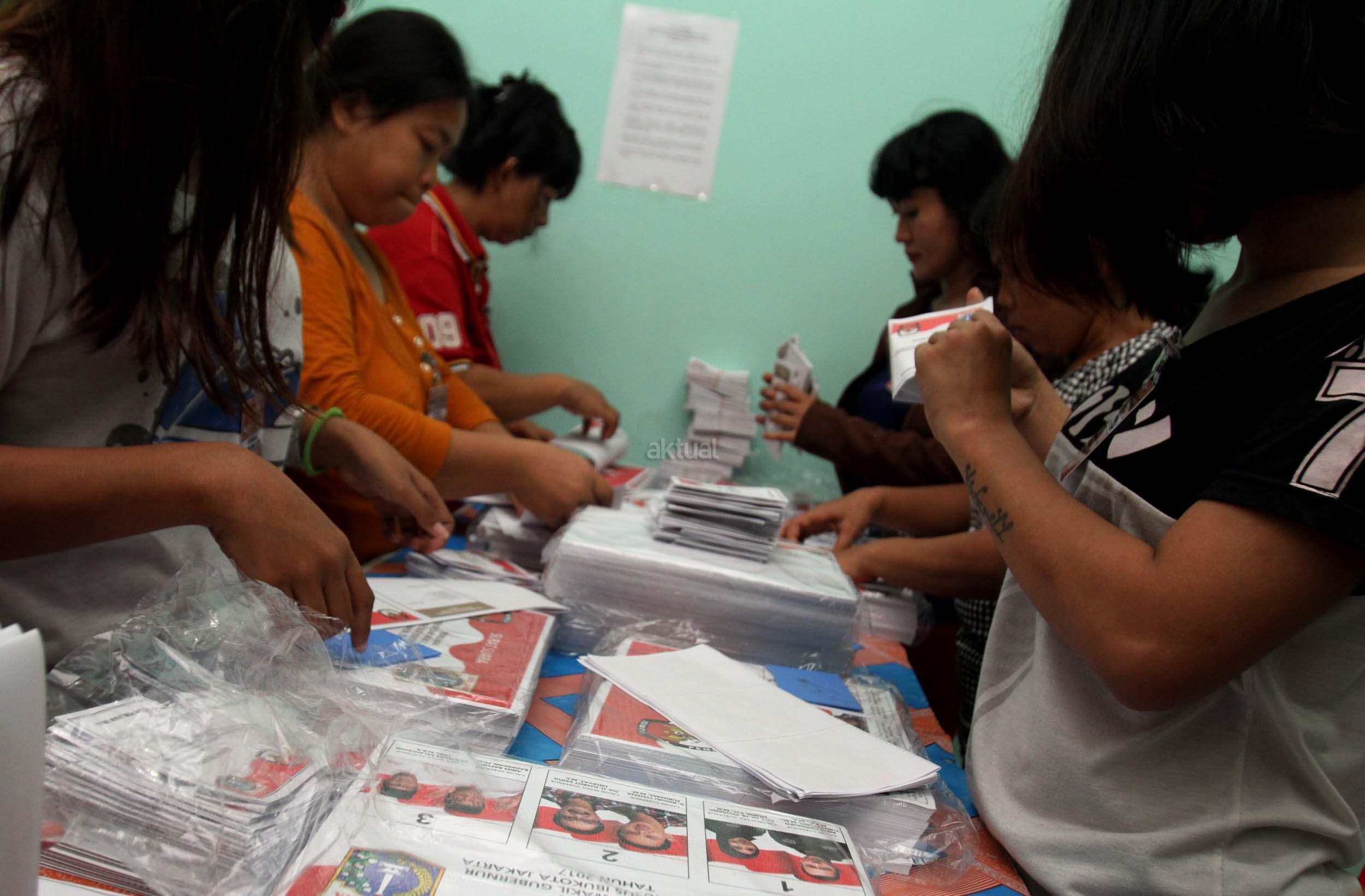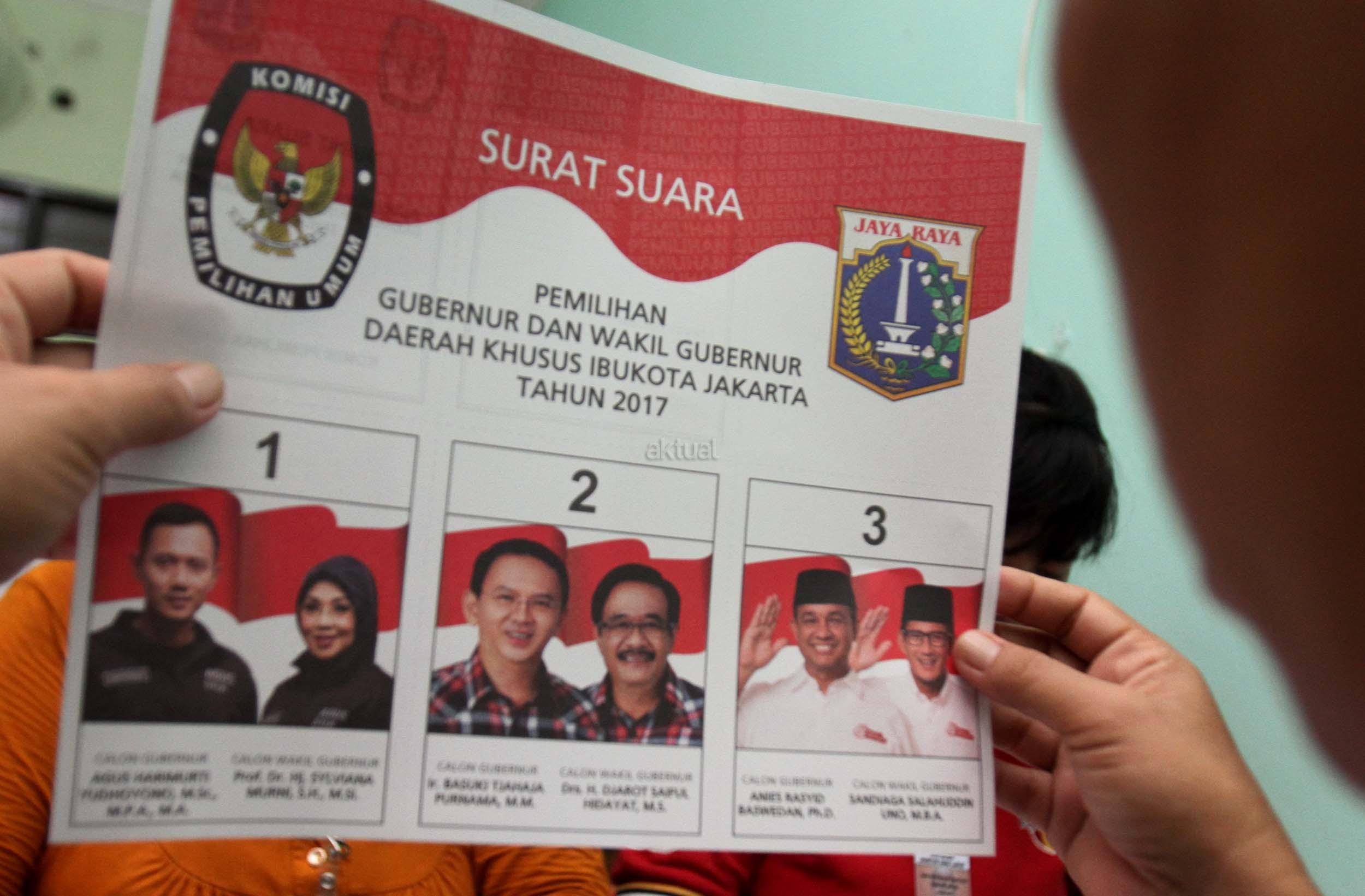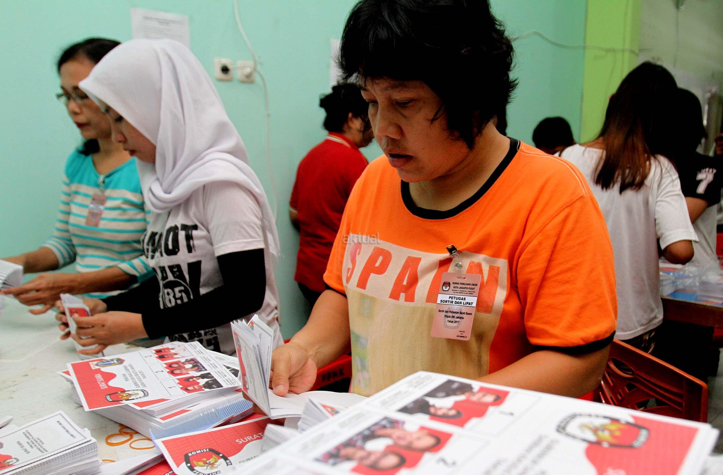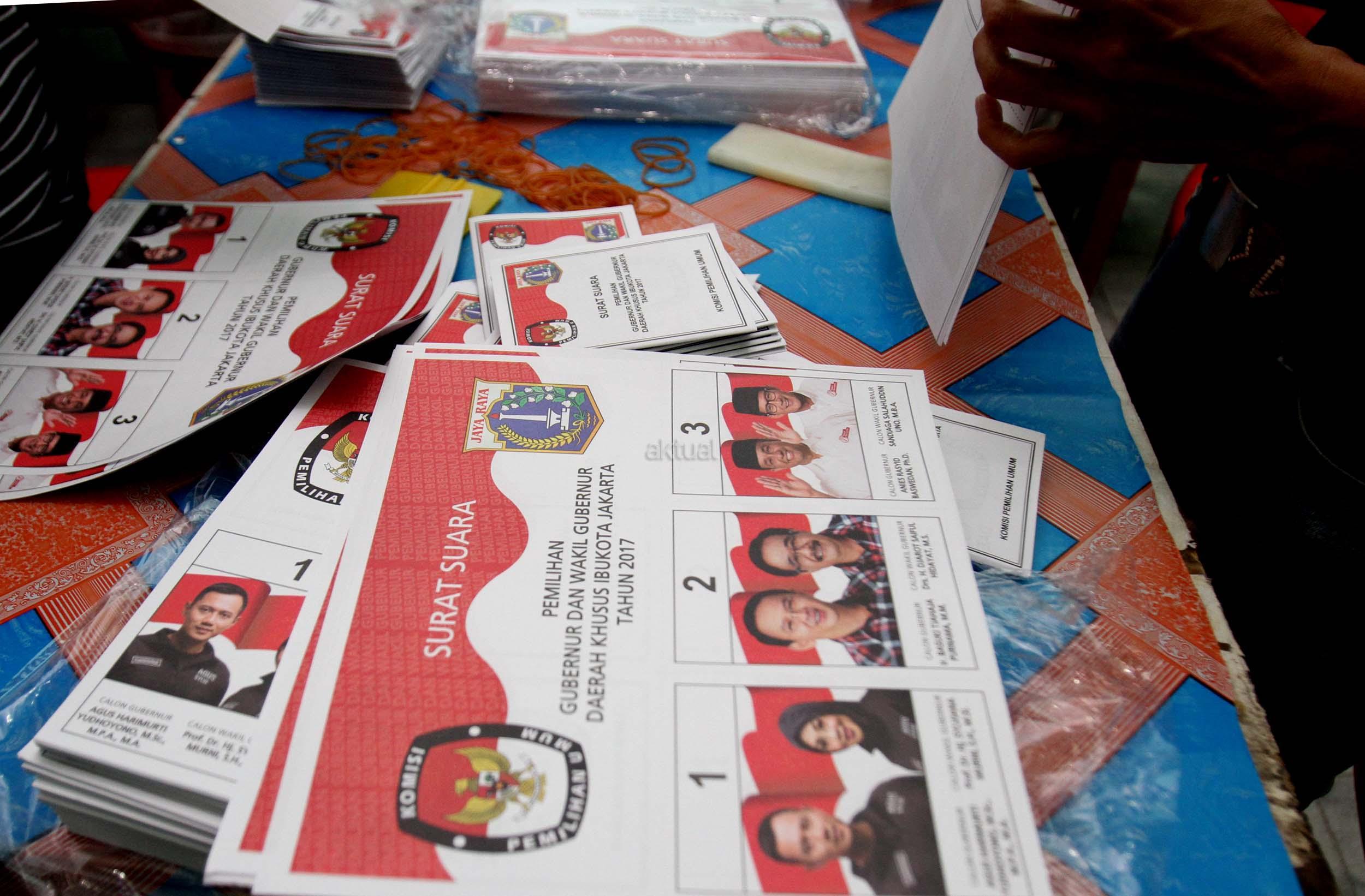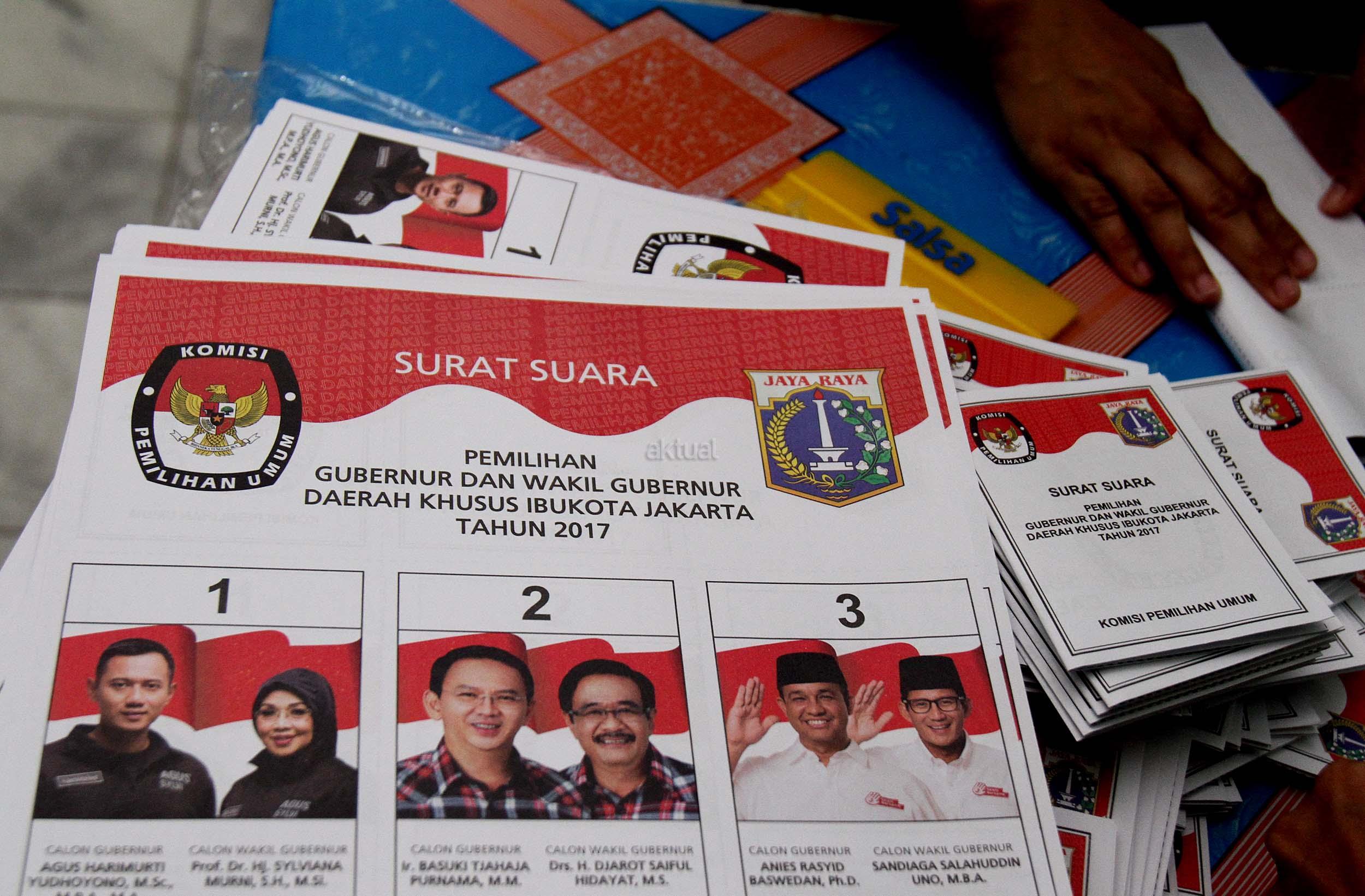 Petugas KPU DKI Jakarta menunjukan salah satu kertas suara Pilkada DKI Jakarta di gudang Logistik KPU DKI Jakarta, Selasa (24/1/2017). Surat suara Pilkada DKI Jakarta diproduksi di Makassar, Sulawesi Selatan dan dikirim melalui kapal laut. AKTUAL/Munzir