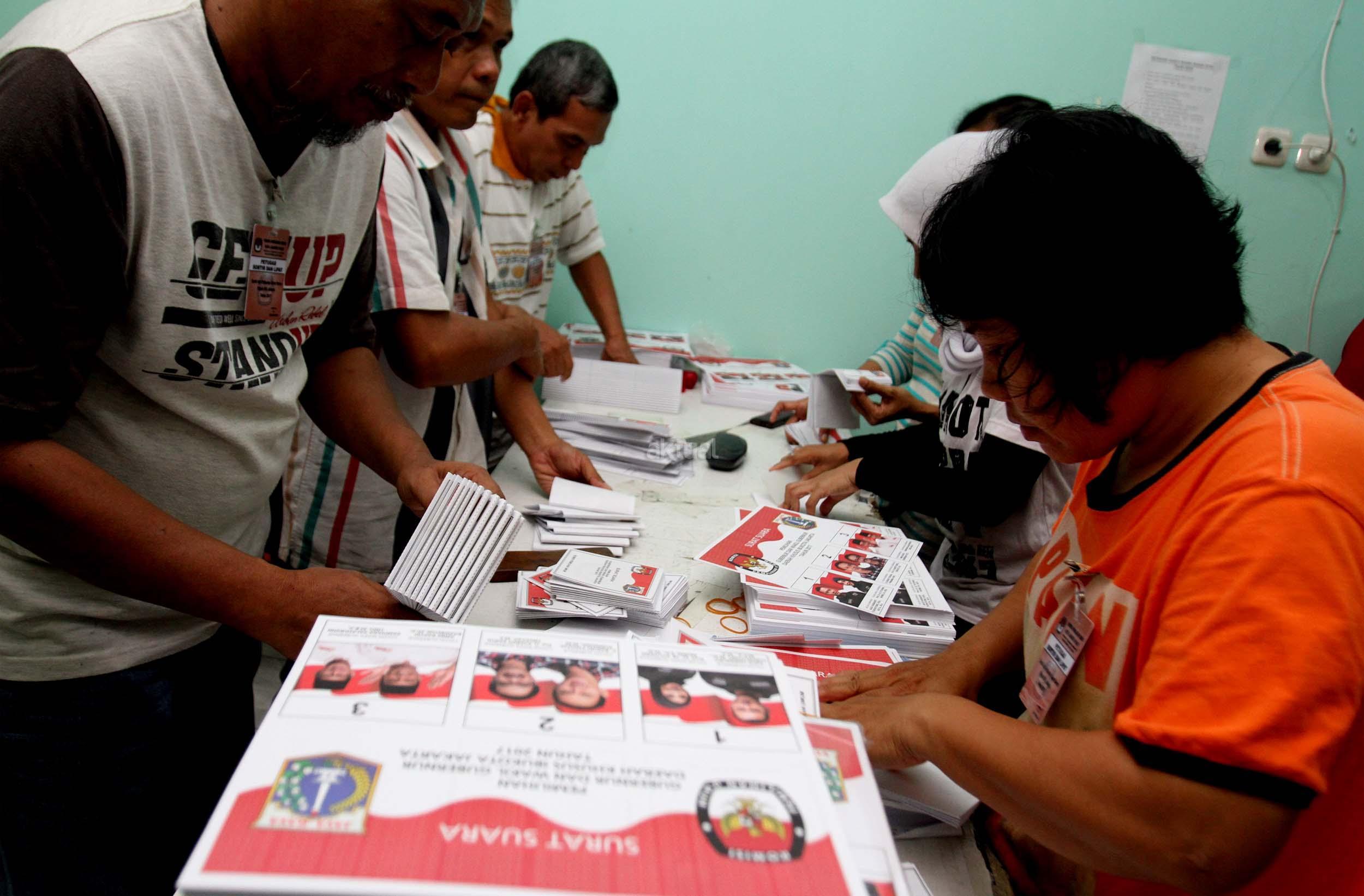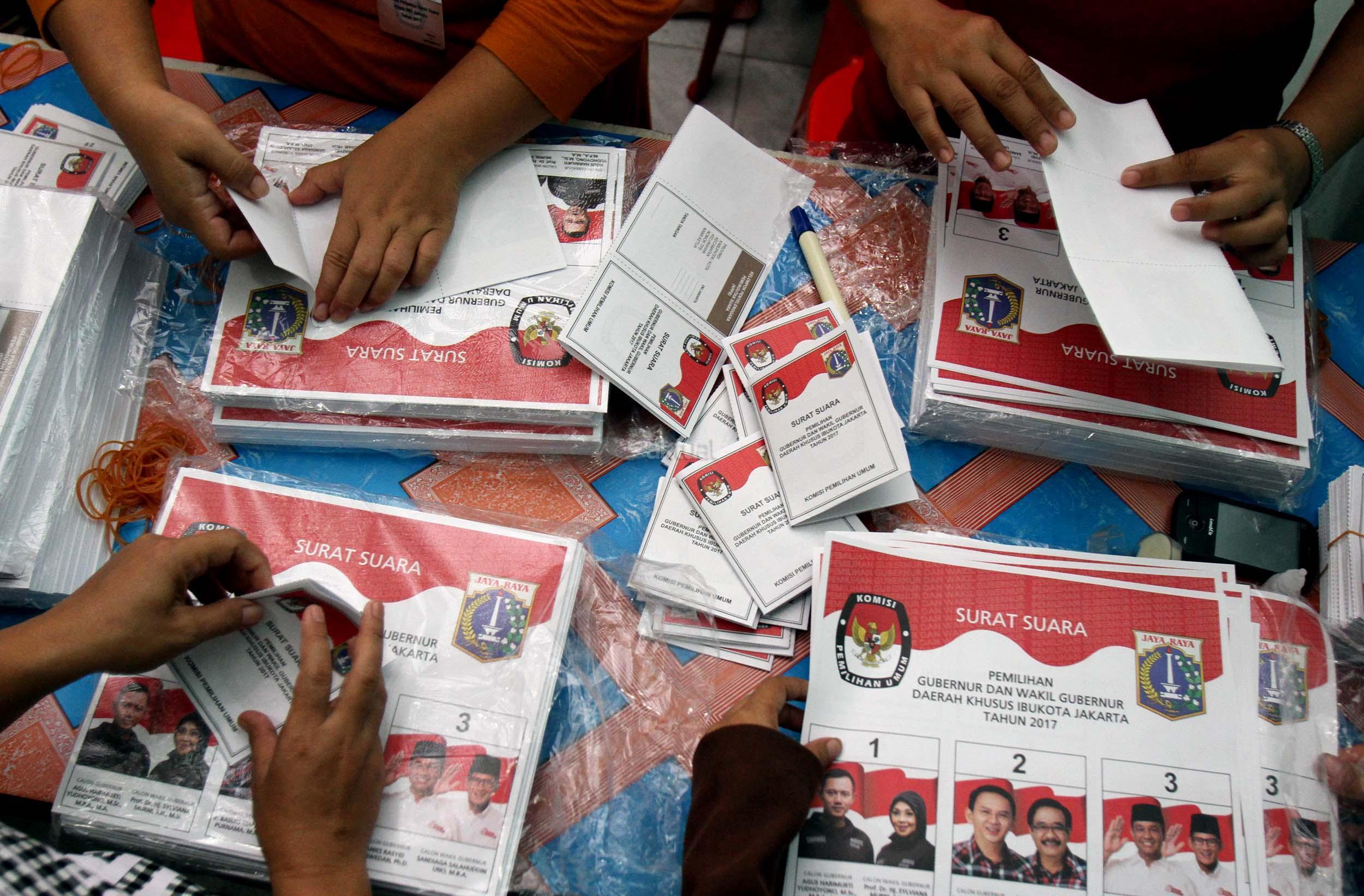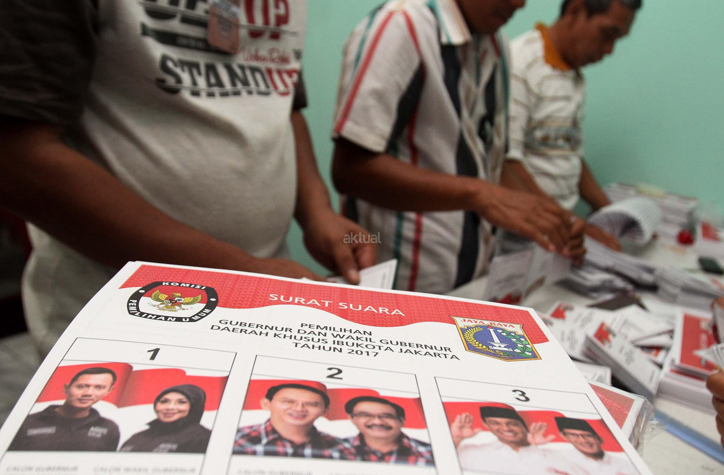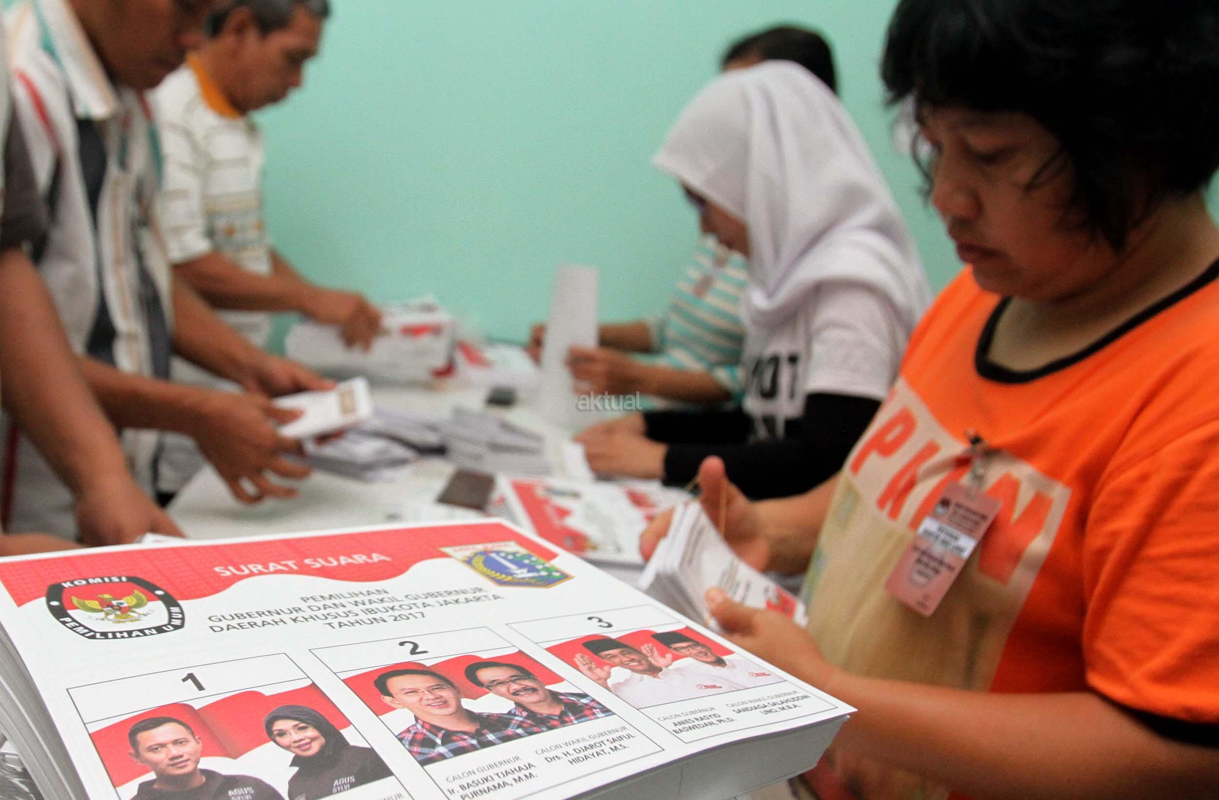 Petugas KPU DKI Jakarta menunjukan salah satu kertas suara Pilkada DKI Jakarta di gudang Logistik KPU DKI Jakarta, Selasa (24/1/2017). Surat suara Pilkada DKI Jakarta diproduksi di Makassar, Sulawesi Selatan dan dikirim melalui kapal laut. AKTUAL/Munzir