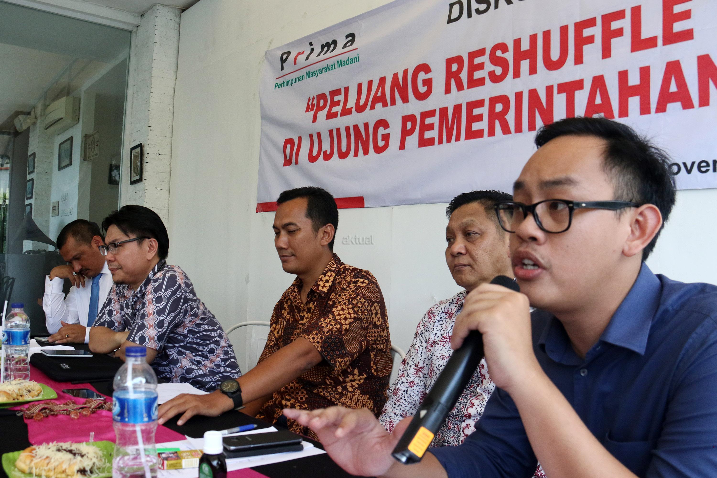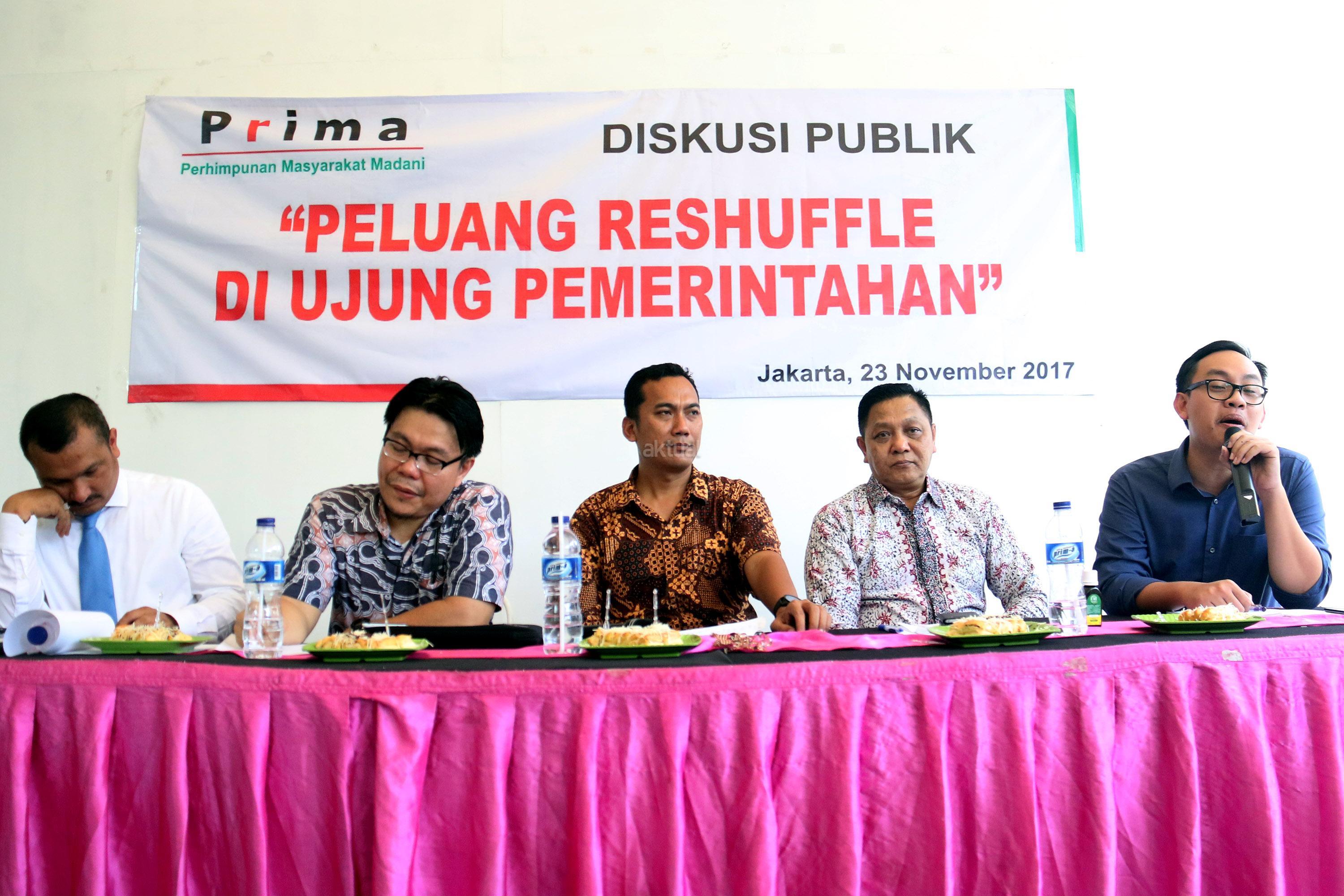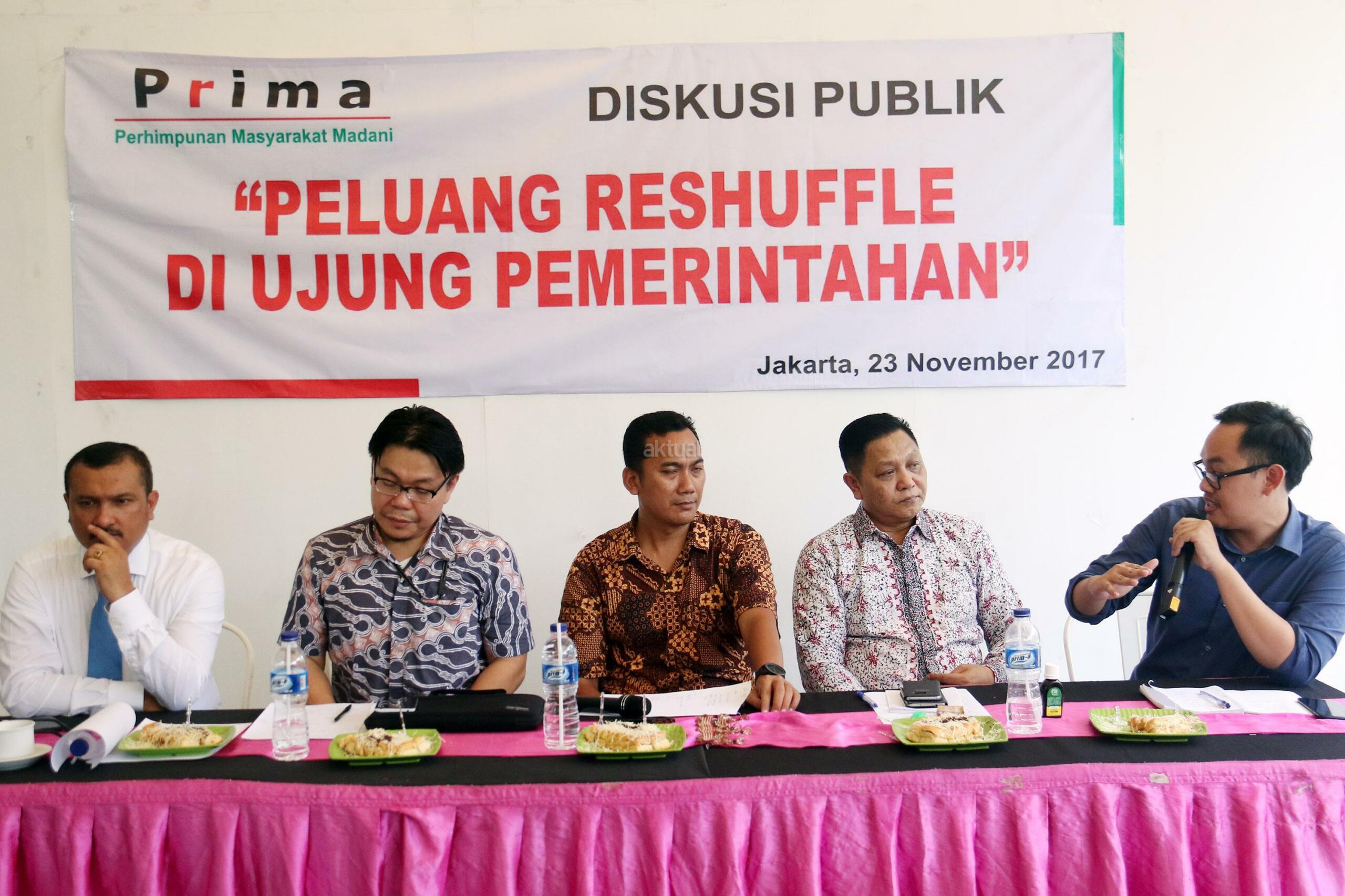 Kiri-kanan ; Jubir Partai Demokrat Ferdinand Hutahean, Kantor Staf Kepresidenan Wandy Tuturoong, Ketua Presidium PRIMA Sya’roni, Pengamat Politik GIB Adhie Massardi, Pengamat Ekonomi INDEF Bhima Yudhistira Adhinegara saat menjadi pembicara diskusi Reshuffle Pemerintahan Jokowi/JK di Jakarta, Kamis (23/11/2017). Diskusi yang diselenggarakan oleh Perhimpunan Masyarakat Madani (PRIMA) dalam tema ” Peluang Reshuffle Di Ujung Pemerintahan”. AKTUAL/Munzir