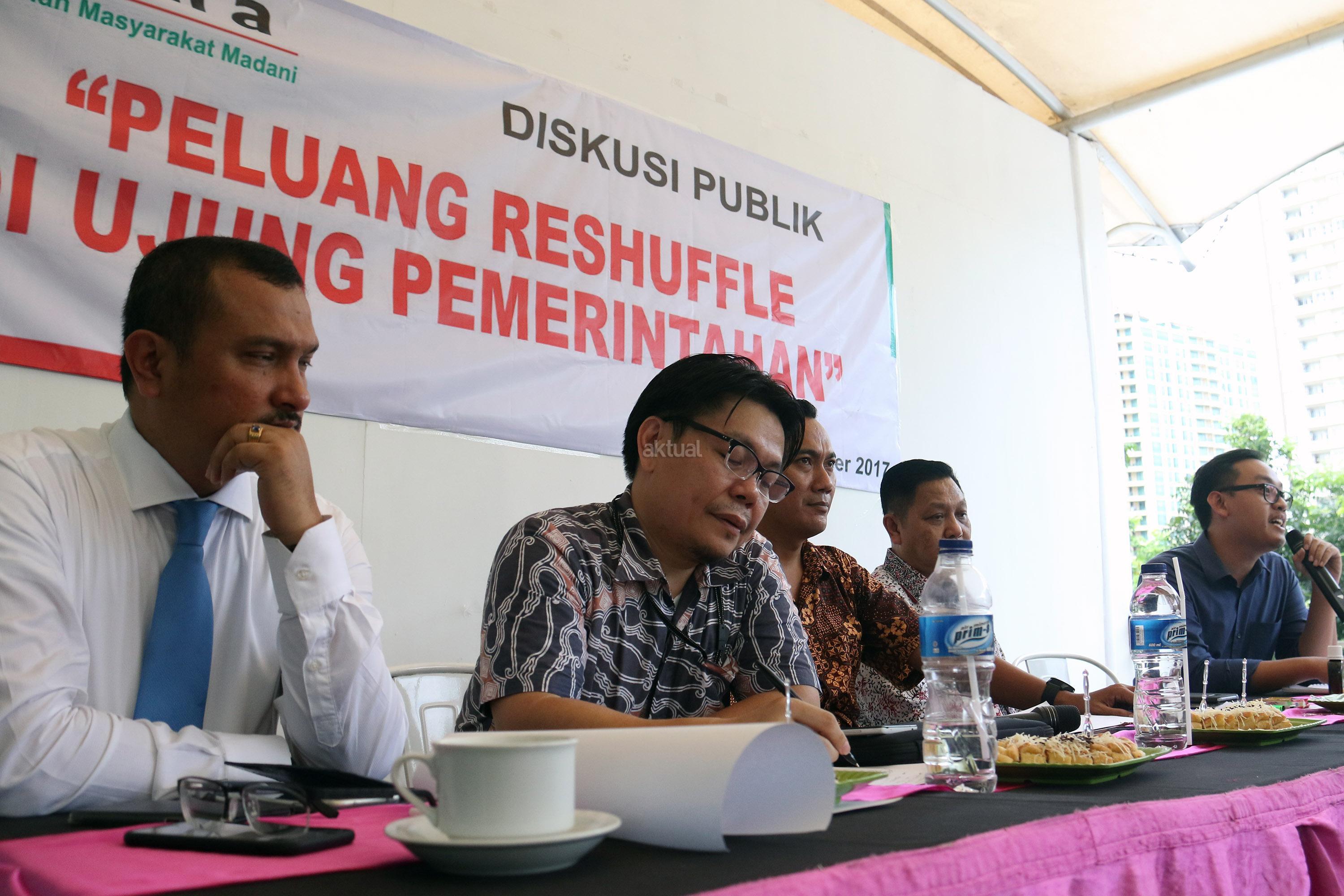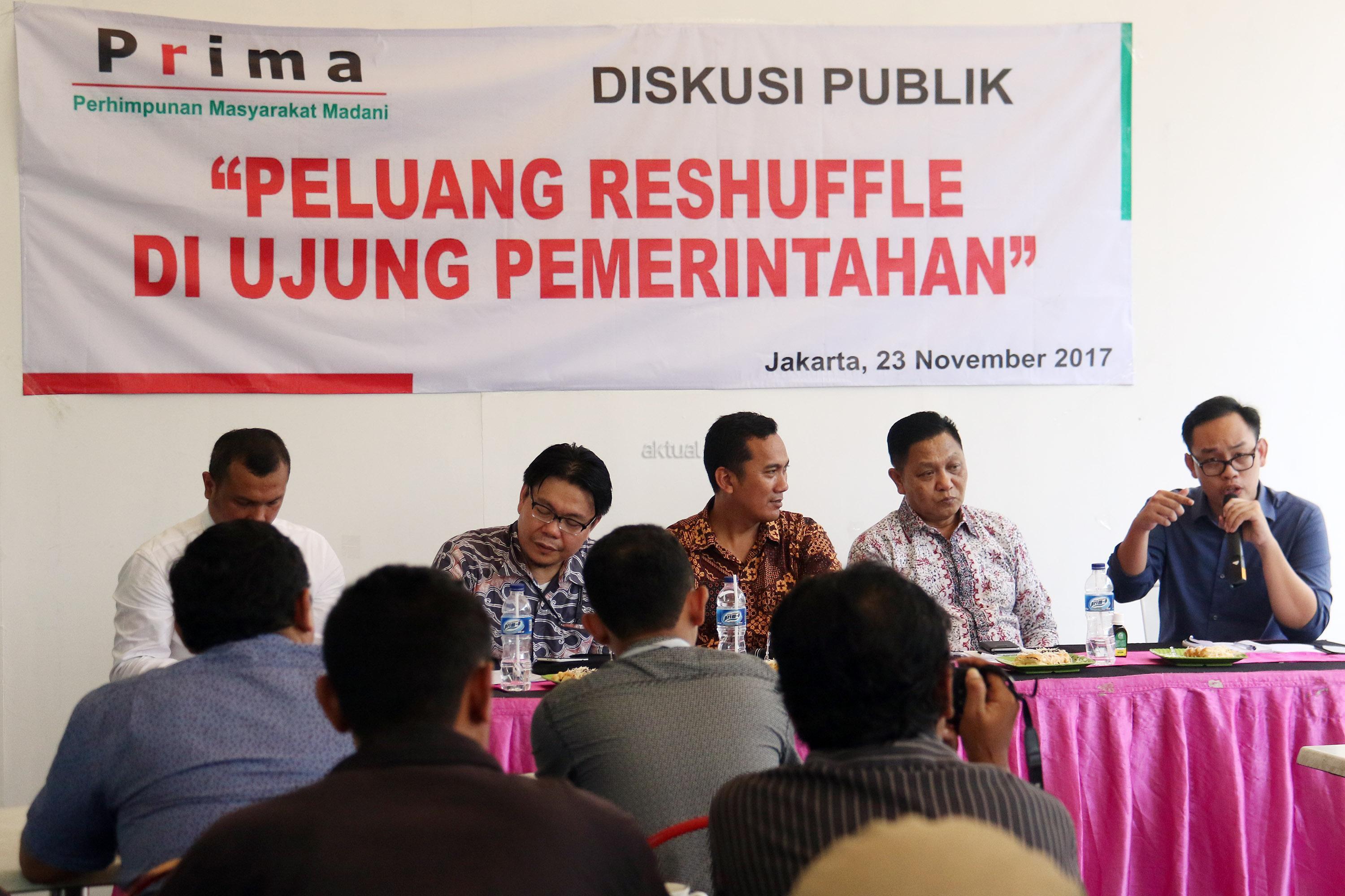 Kiri-kanan ; Jubir Partai Demokrat Ferdinand Hutahean, Kantor Staf Kepresidenan Wandy Tuturoong, Ketua Presidium PRIMA Sya'roni, Pengamat Politik GIB Adhie Massardi, Pengamat Ekonomi INDEF Bhima Yudhistira Adhinegara saat menjadi pembicara diskusi Reshuffle Pemerintahan Jokowi/JK di Jakarta, Kamis (23/11/2017). Diskusi yang diselenggarakan oleh Perhimpunan Masyarakat Madani (PRIMA) dalam tema " Peluang Reshuffle Di Ujung Pemerintahan". AKTUAL/Munzir