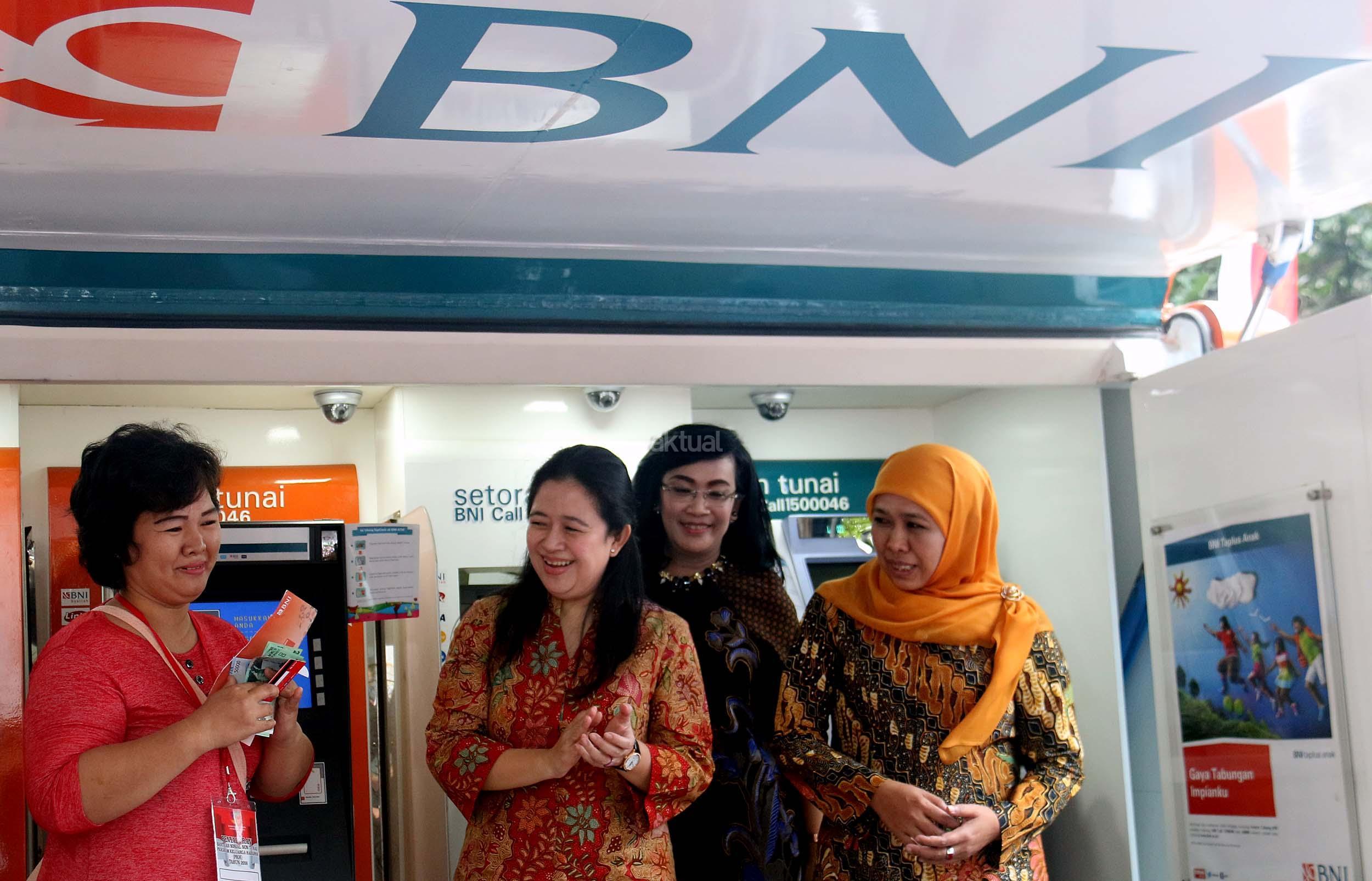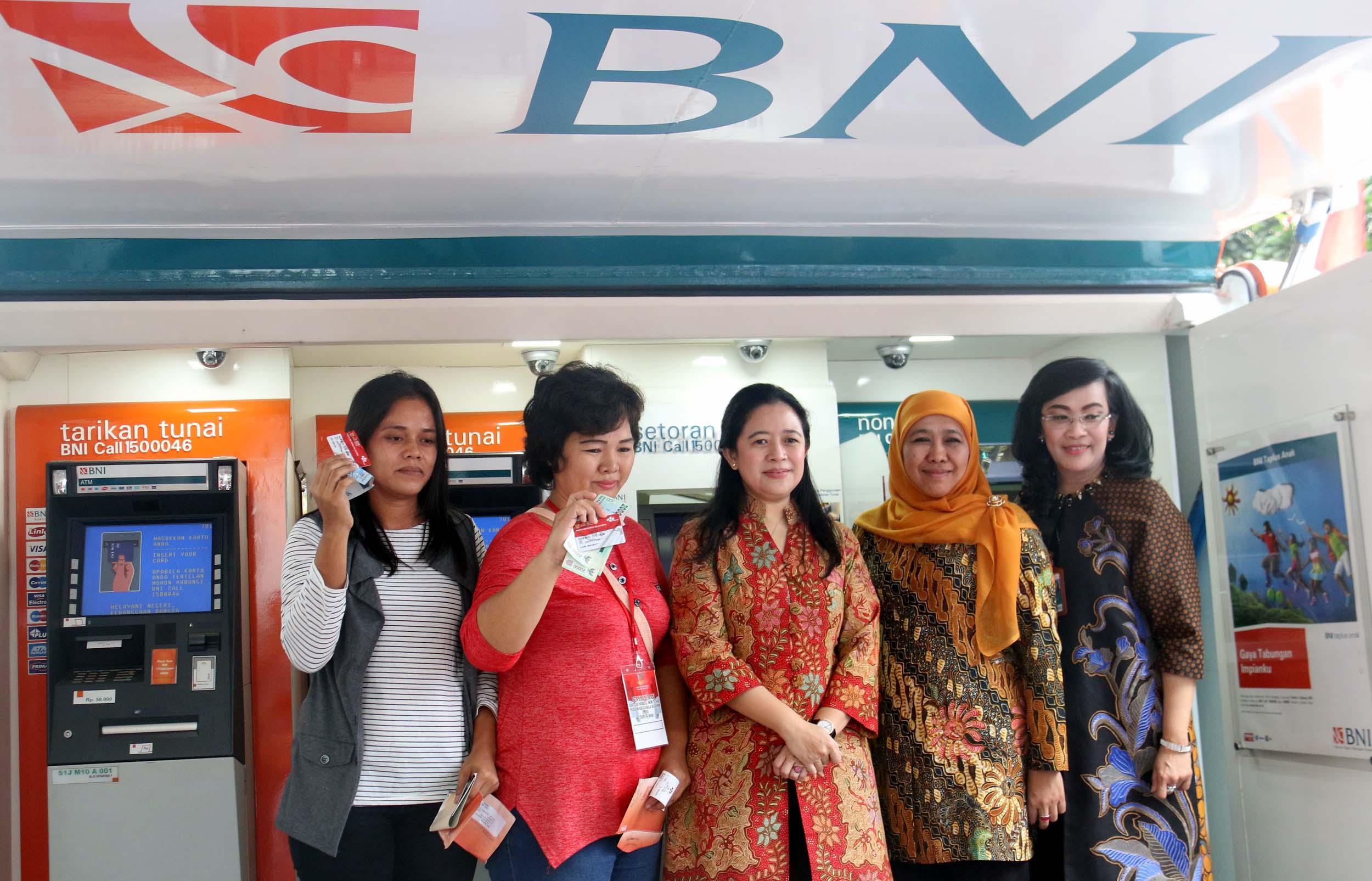 Menko PMK Puan Maharani (kedua kiri) bersama Menteri Sosial Khofifah Indar Parawansa (ketiga kiri) dan Direktur Hubungan Kelembagaan & Transaksional Perbankan BNI Adi Sulistyowati (kanan) berbincang dengan warga penerima Program Keluarga Harapan (PKH) usai peluncuran Penyaluran Bantuan Sosial Non Tunai PKH tahun 2016 di Jakarta, Kamis (17/11/2016). Program tersebut bertujuan untuk mengajak penerima Program Keluarga Harapan (PKH) agar mulai belajar menabung. AKTUAL/Munzir