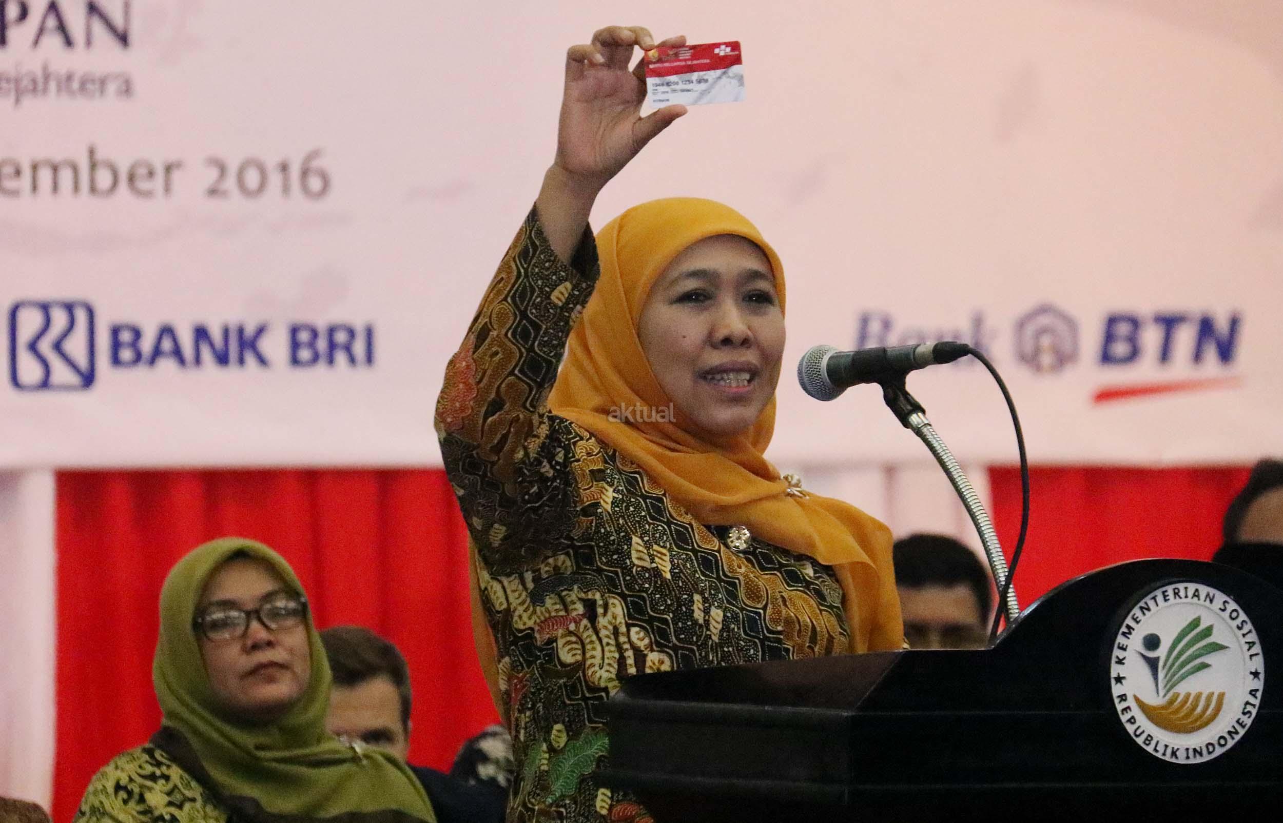 Menteri Sosial, Khofifah Indar Parawansa memberikan penjelasan saat menghadiri acara penyaluran bantuan sosial non-tunai kepada 1.000 penerima manfaat Program Keluarga Harapan (PKH) tahun 2016 di Kantor Kementerian Sosial, Jakarta, Kamis (17/11/2016). Penyaluran bantuan sosial non-tunai diprioritaskan untuk wilayah perkotaan dengan memanfaatkan E-Warong KUBE-PKH dan agen Bank Himpunan Bank Milik Negara atau HIMBARA (BNI, BTN, Mandiri dan BRI). AKTUAL/Munzir