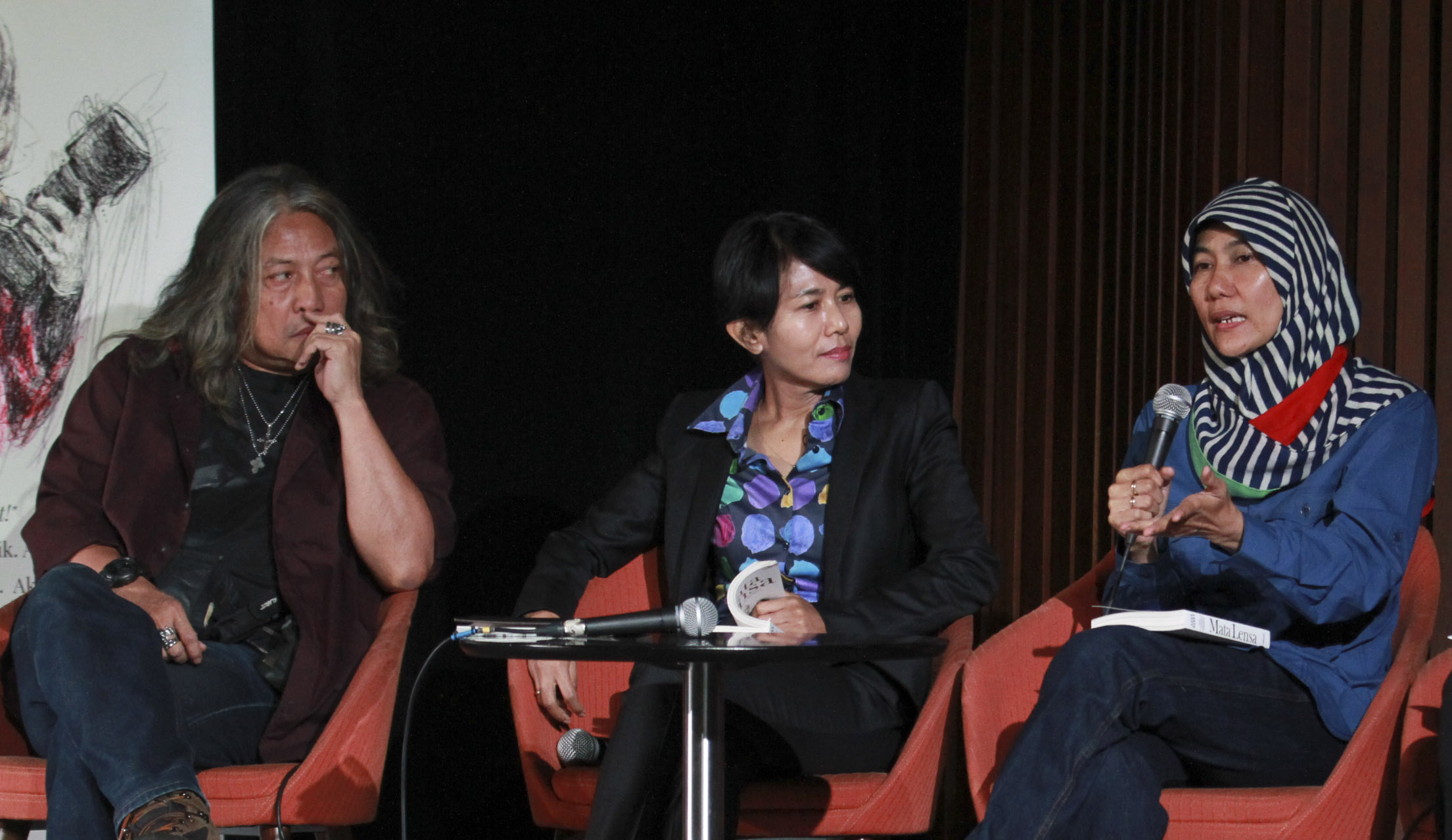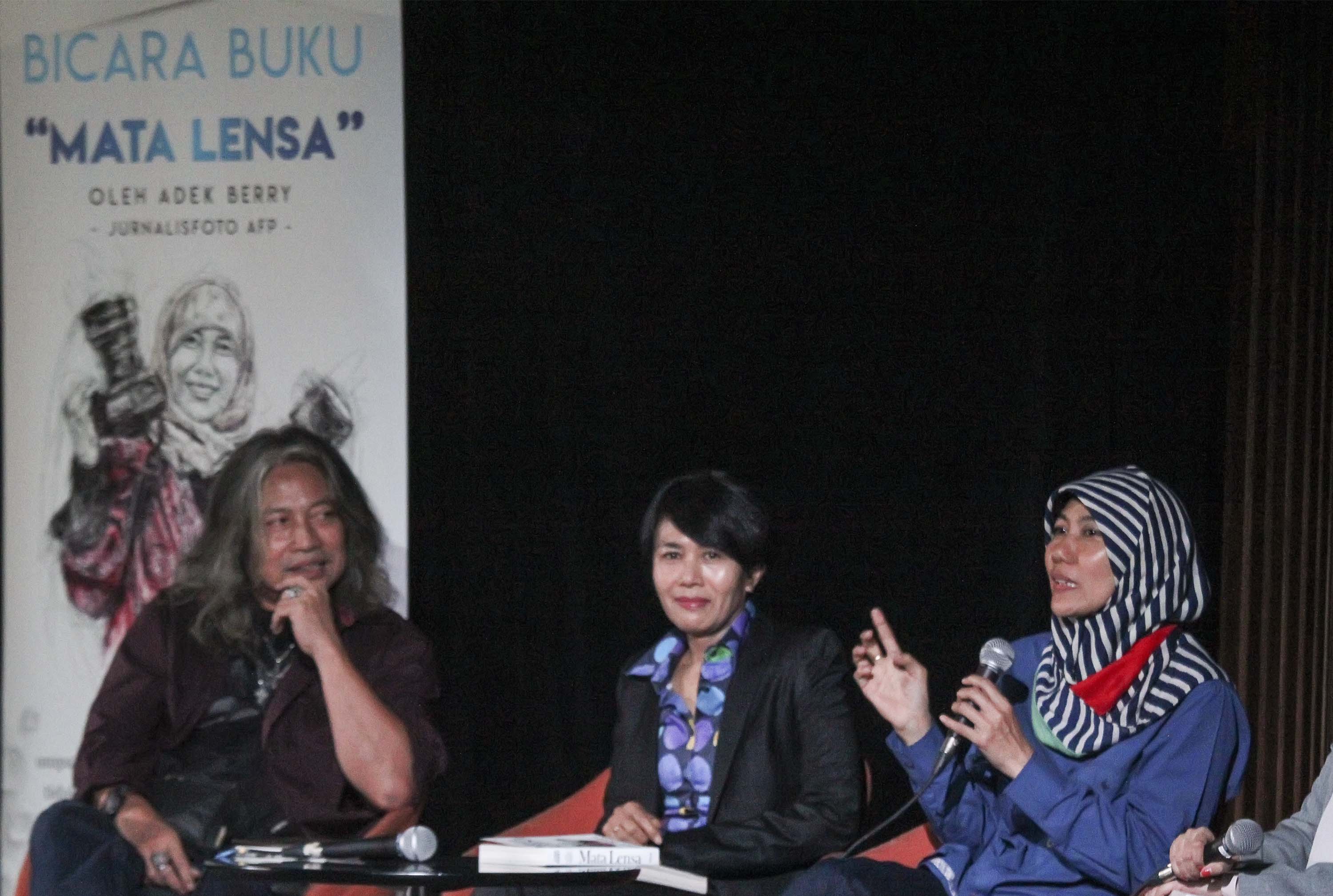 Jurnalis Foto Kantor Berita Prancis (AFP) Adek Berry (kanan) menjadi pembicara bersama dua panelis Jurnalis Foto Senior dan Kurator Galeri Foto Jurnalistik Antara Oscar Motuloh (kiri) dan Jurnalis Televisi Senior Desi Anwar (tengah) pada acara Peluncuran dan Bicara Buku “Mata Lensa” di Auditorium Pusat Kebudayaan Prancis, Jakarta, Rabu (29/11). Buku “Mata Lensa” karya Adek Berry tersebut bercerita tentang kisah-kisah unik & menarik di balik liputan dirinya sebagai seorang jurnalis foto perempuan selama 25 tahun ini berkecimpung dalam dunia foto jurnalistik baik nasional maupun internasional. AKTUAL/POOL-Kurniawan Masud