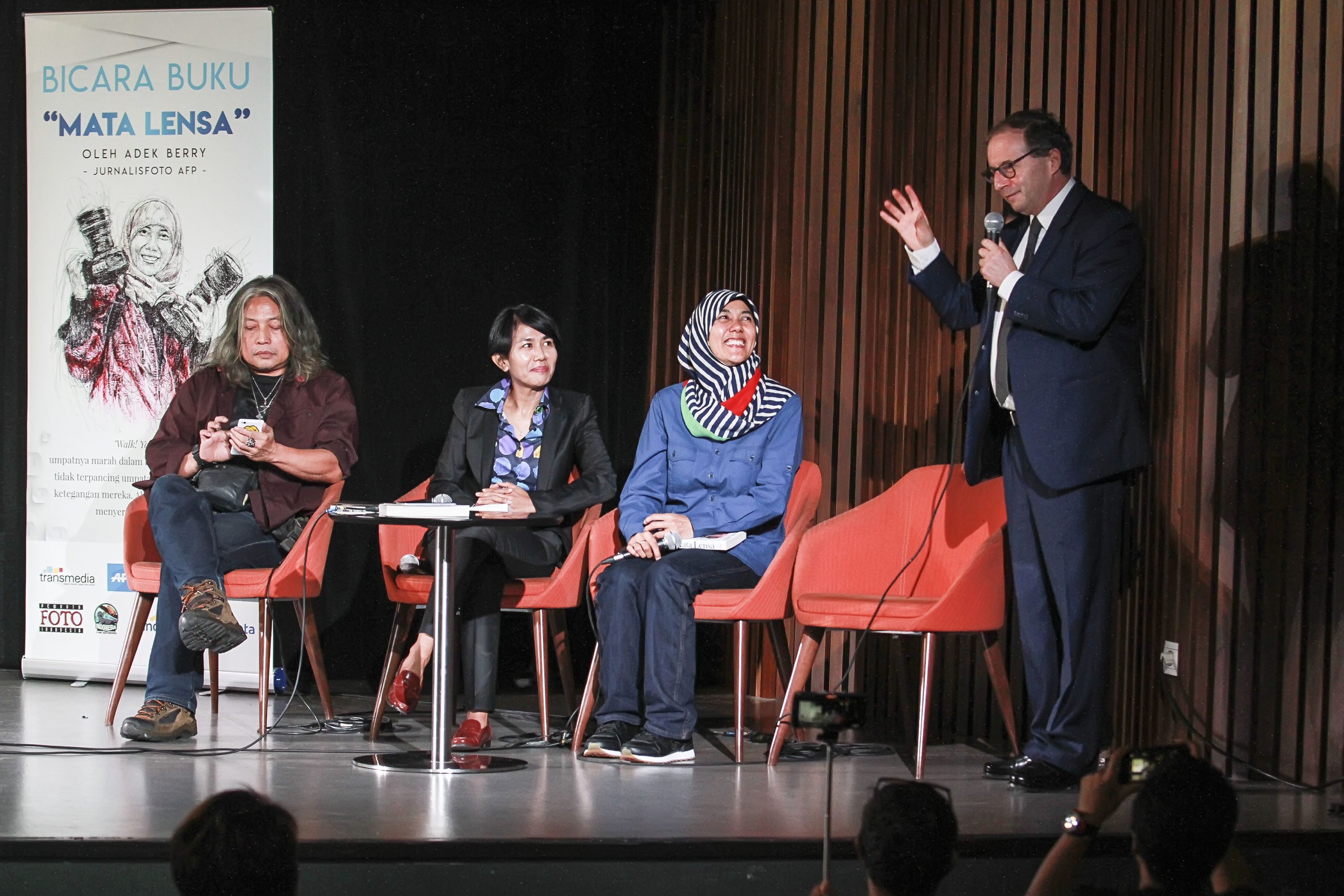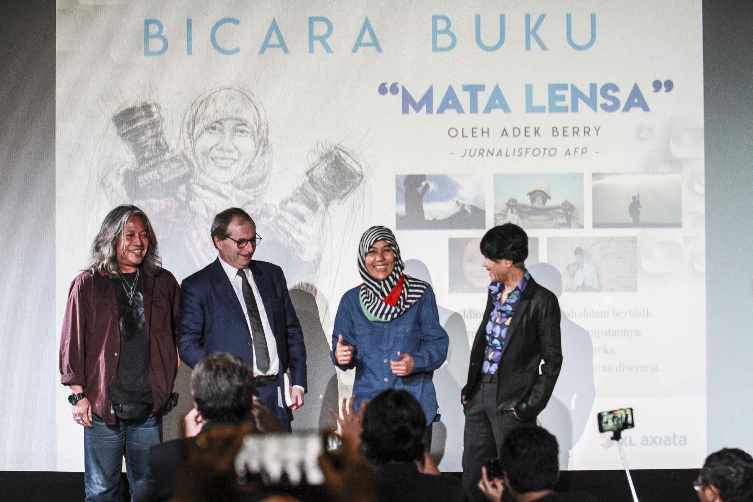 Duta Besar Prancis untuk Indonesia Jean-Charles Berthonnet (kedua kiri) berbincang dengan Jurnalis Foto Kantor Berita Prancis (AFP) Adek Berry (kedua kanan), Jurnalis Foto Senior dan Kurator Galeri Foto Jurnalistik Antara Oscar Motuloh (kiri) dan Jurnalis Televisi Senior Desi Anwar (kanan) pada acara Peluncuran dan Bicara Buku "Mata Lensa" di Auditorium Pusat Kebudayaan Prancis, Jakarta, Rabu (29/11). Buku "Mata Lensa" karya Adek Berry tersebut bercerita tentang kisah-kisah unik & menarik di balik liputan dirinya sebagai seorang jurnalis foto perempuan selama 25 tahun ini berkecimpung dalam dunia foto jurnalistik baik nasional maupun internasional. AKTUAL/POOL-Kurniawan Masud