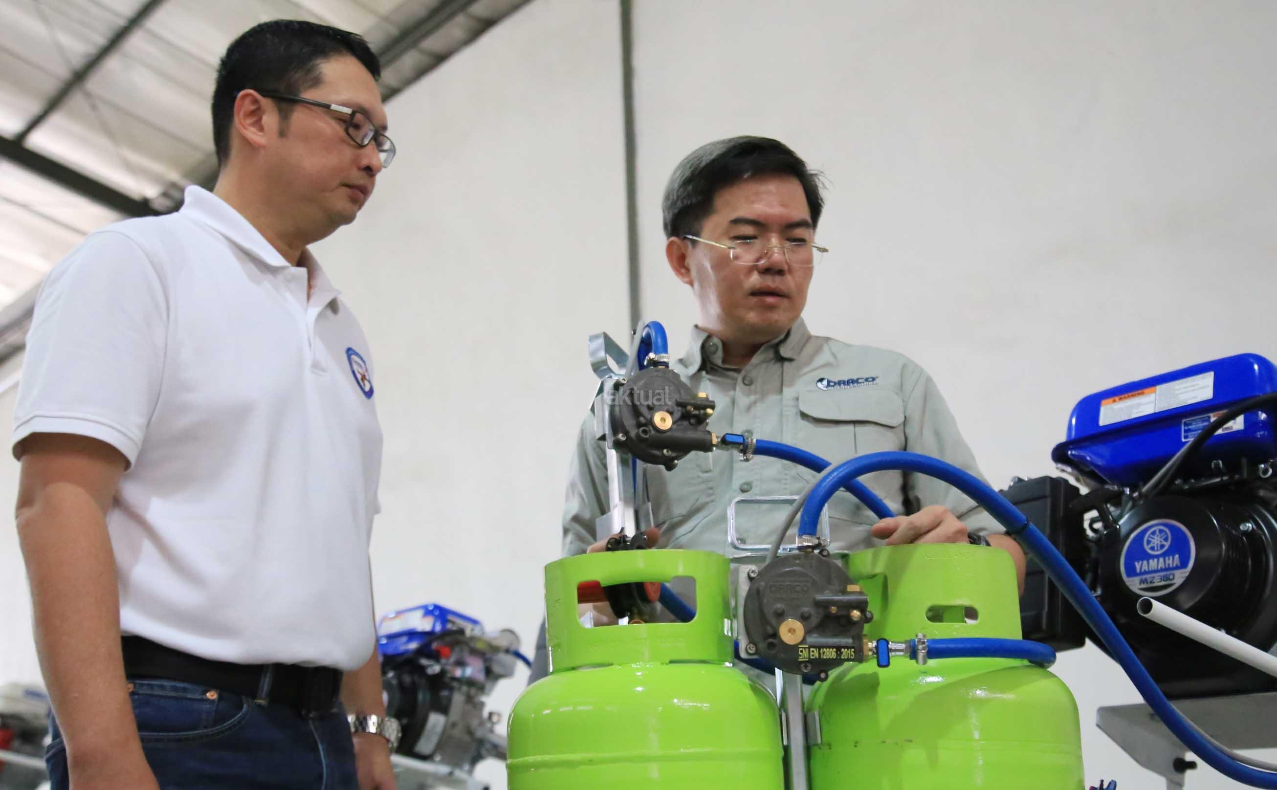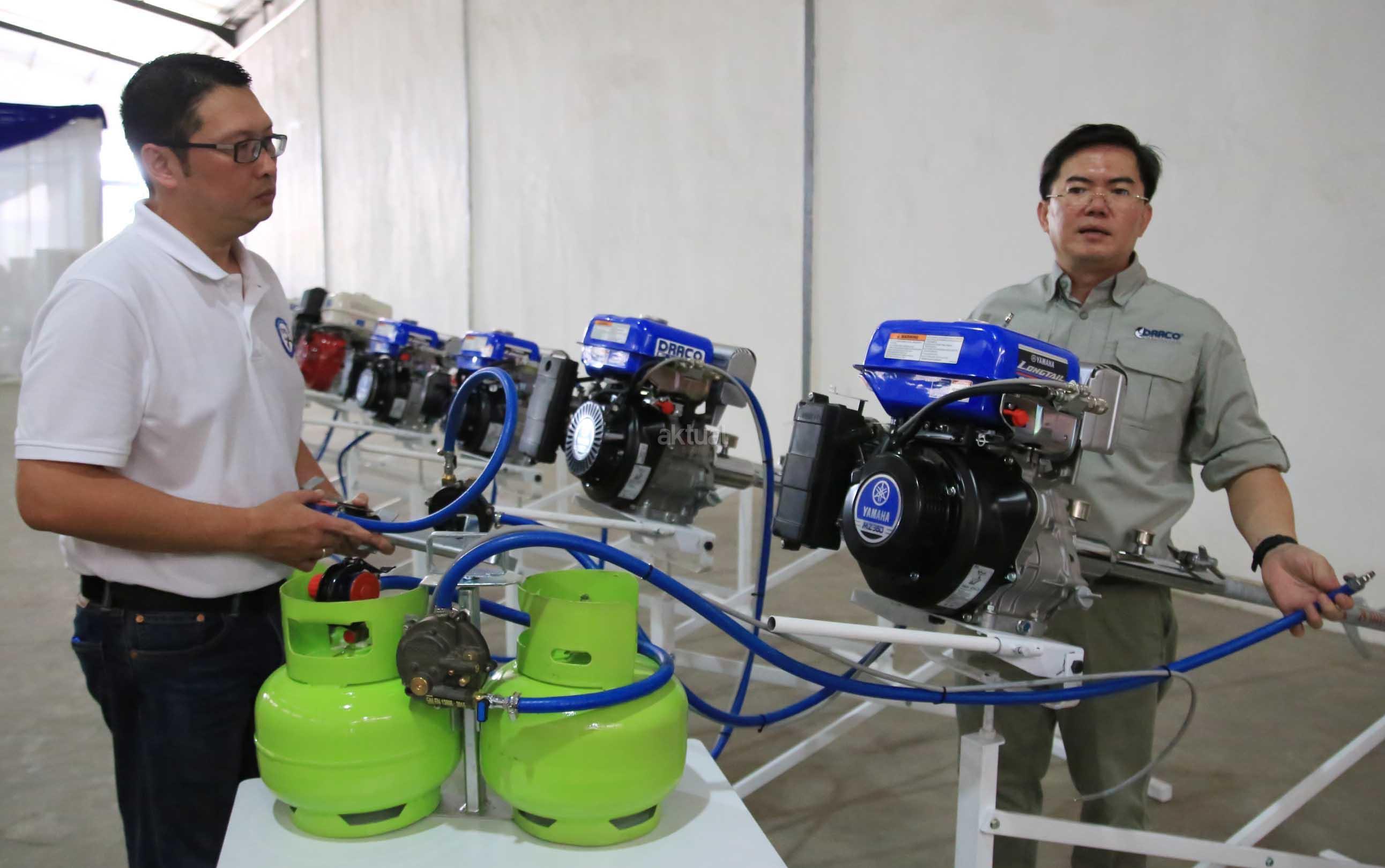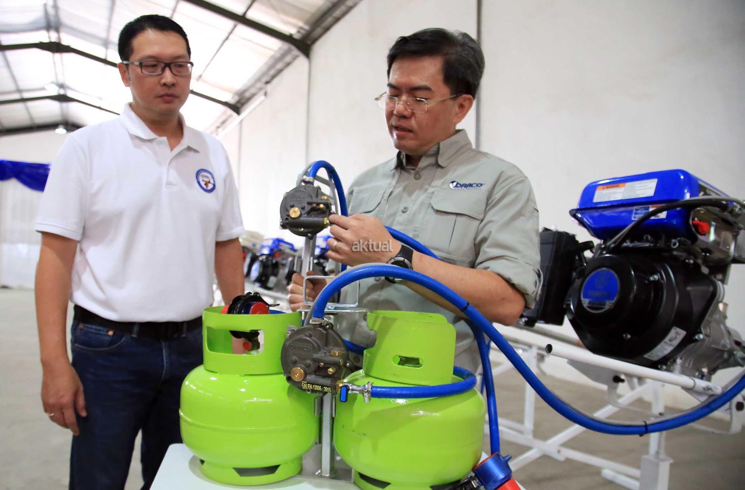 Direktur Utama PT Draco International Thomas Nurhakim (kiri) berbincang dengan Direktur Dipo Tju sambil memperagakan pemasangan konverter KIT Draco Engine saat peluncuran produk tersebut di Komplek Pergudangan Taman Tekno BSD, Tangerang, Rabu (7/12/2016). Draco Engine memberikan solusi kepada pengguna mesin-mesin serba guna sehingga bisa menggunakan bahan bakar bensin atau LPG (berbahan bakar ganda/Bi-Fuel). Dengan adanya konverter KIT Draco Engine, nelayan dapat kemampuan, ketahanan serta keamanan mesin, selain itu juga sangat membantu para nelayan dalam menghemat biaya bahan bakar dan pemeliharaan mesin yang rendah jika menggunakan gas LPG. AKTUAL/Eko Hilman