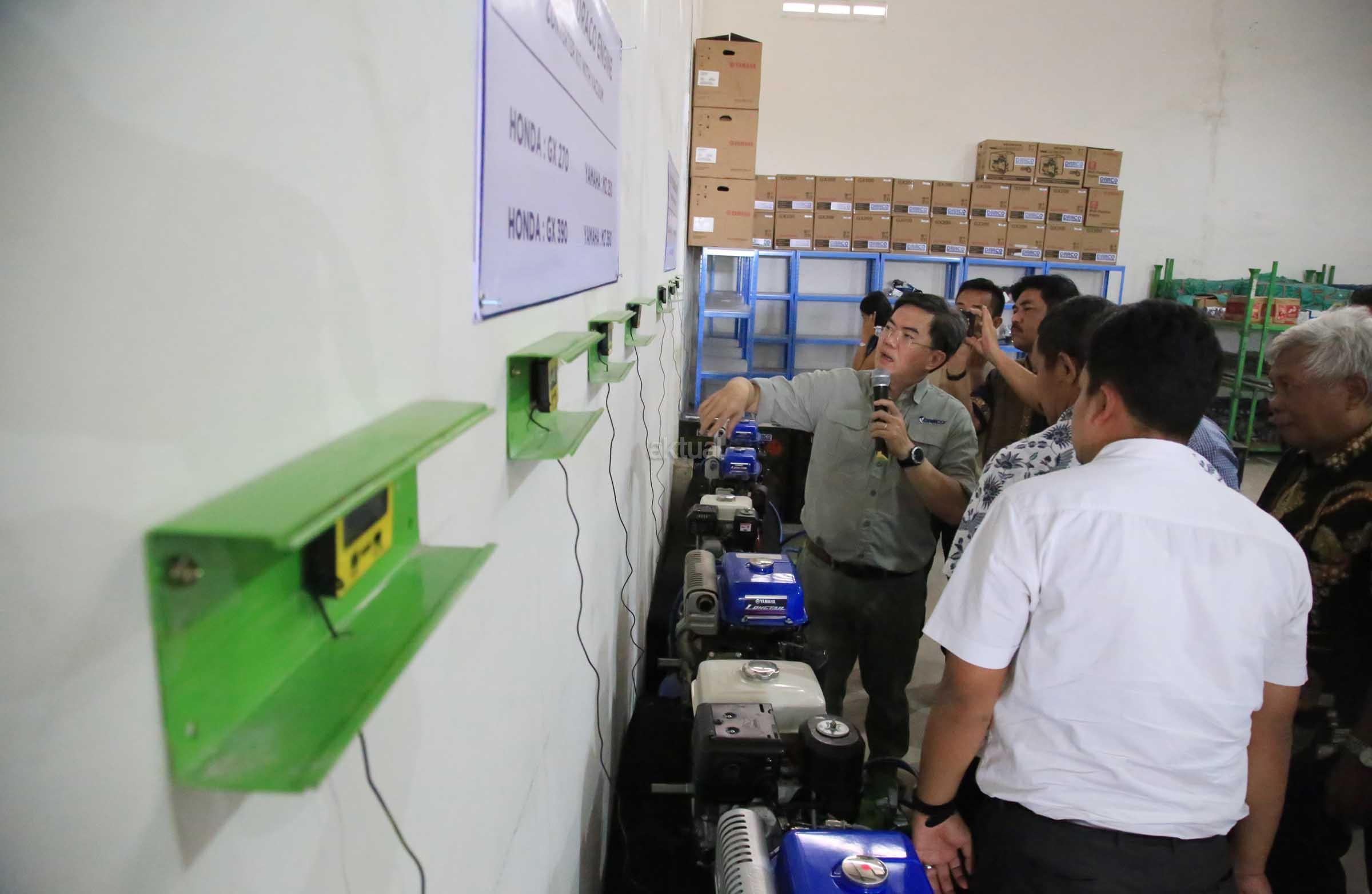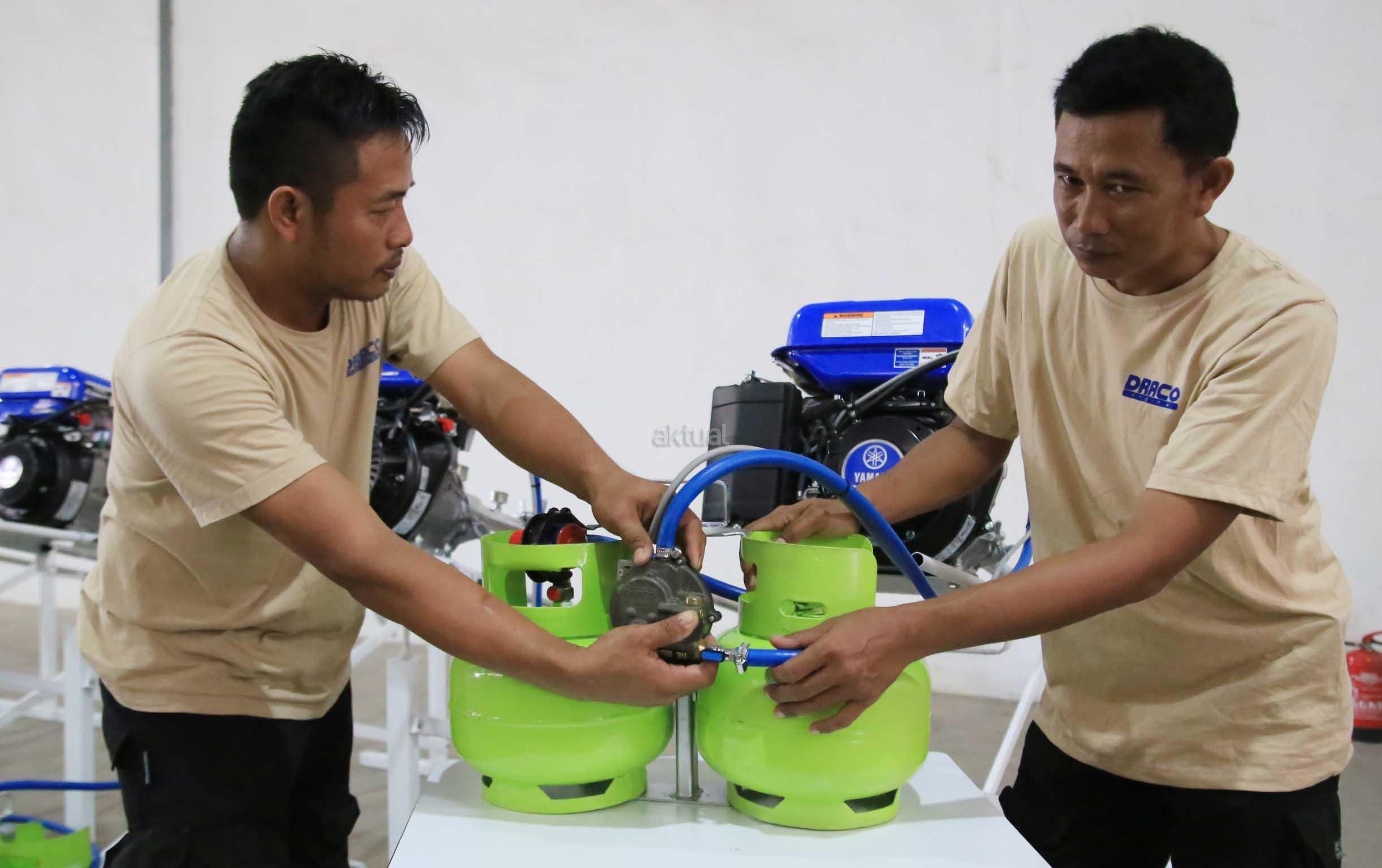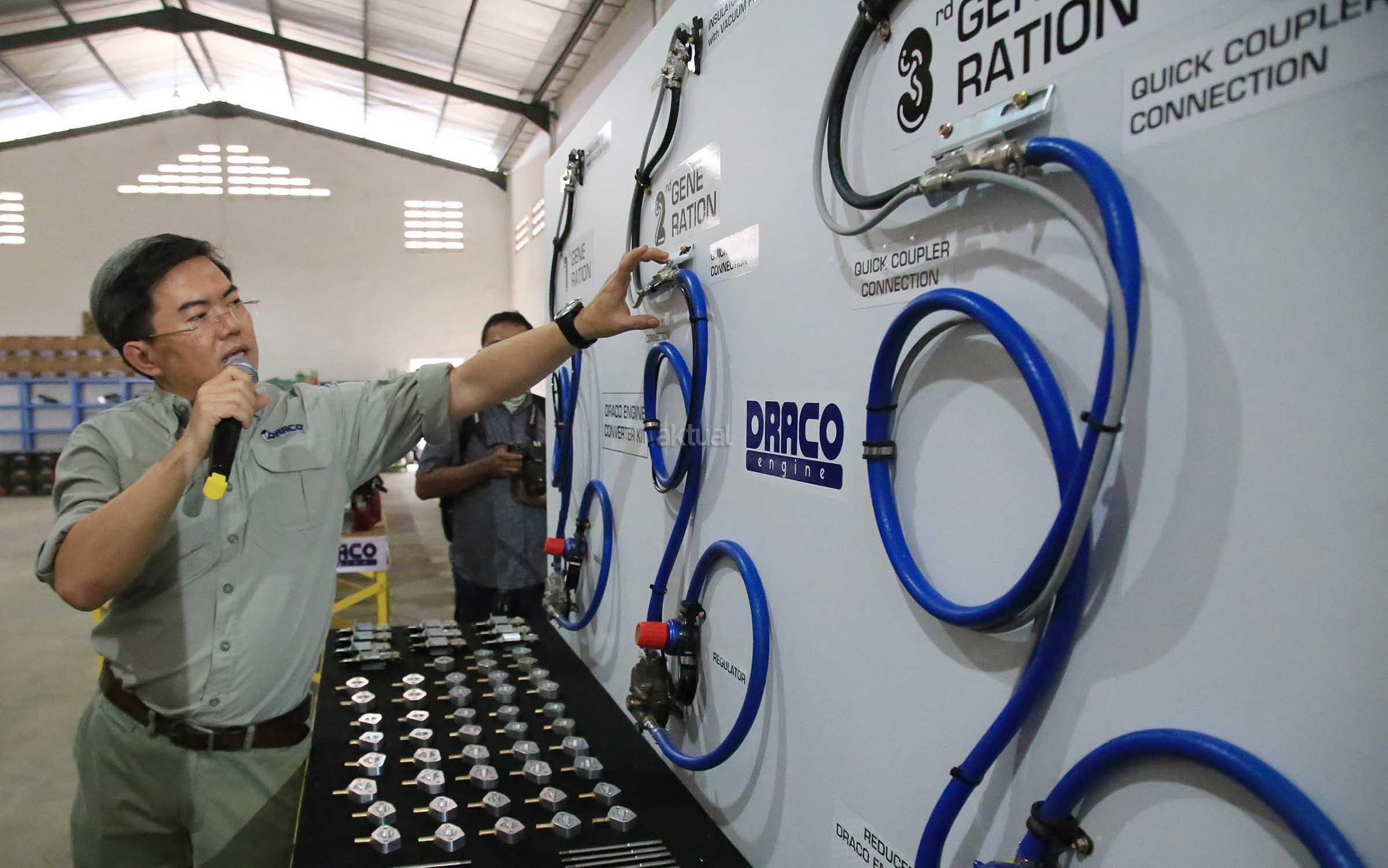 Direktur Utama PT Draco International Thomas Nurhakim (kiri) berbincang dengan Direktur Dipo Tju sambil memperagakan pemasangan konverter KIT Draco Engine saat peluncuran produk tersebut di Komplek Pergudangan Taman Tekno BSD, Tangerang, Rabu (7/12/2016). Draco Engine memberikan solusi kepada pengguna mesin-mesin serba guna sehingga bisa menggunakan bahan bakar bensin atau LPG (berbahan bakar ganda/Bi-Fuel). Dengan adanya konverter KIT Draco Engine, nelayan dapat kemampuan, ketahanan serta keamanan mesin, selain itu juga sangat membantu para nelayan dalam menghemat biaya bahan bakar dan pemeliharaan mesin yang rendah jika menggunakan gas LPG. AKTUAL/Eko Hilman