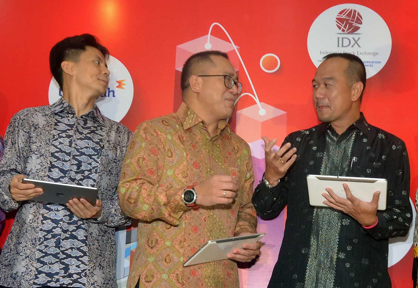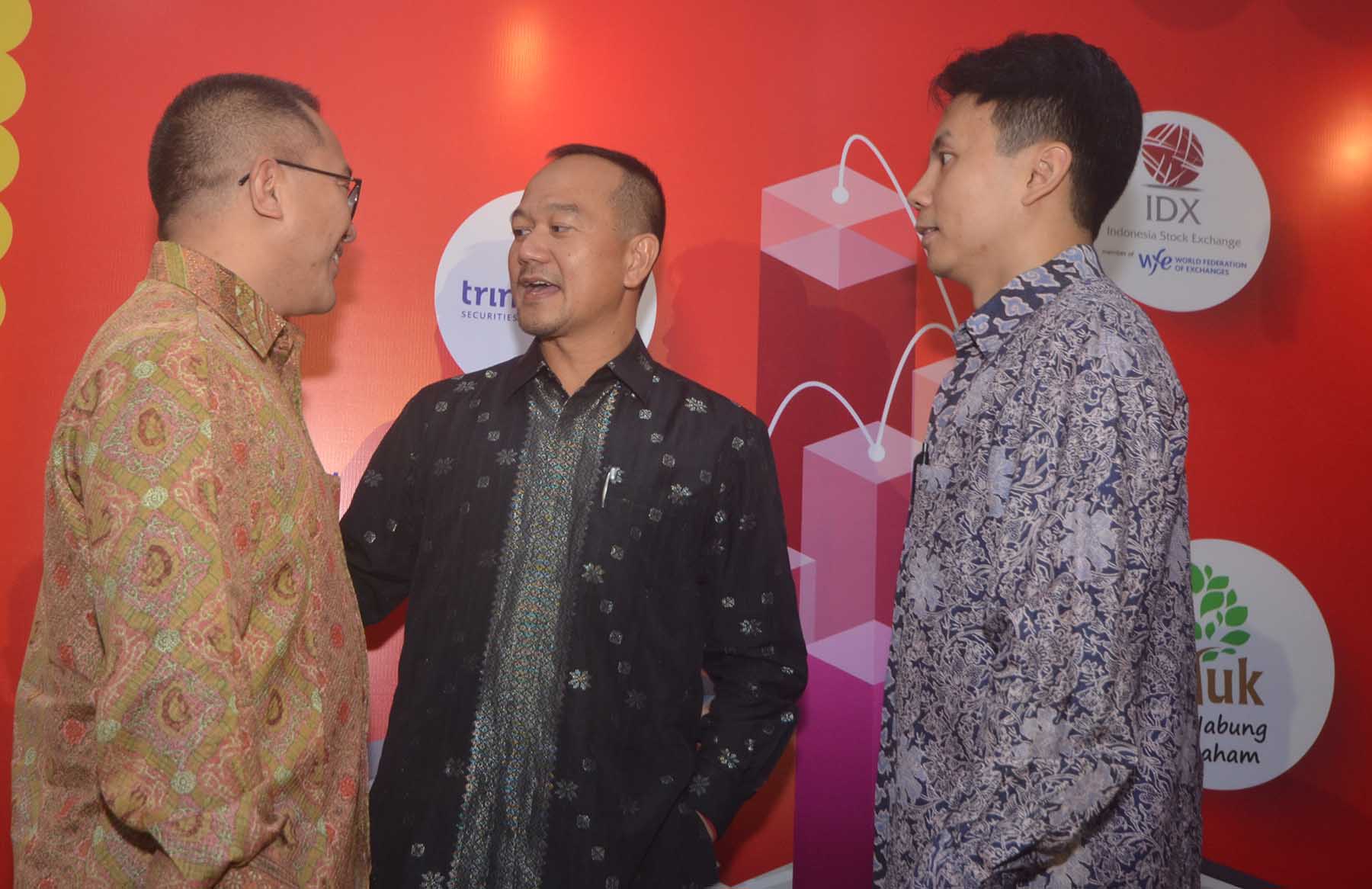 President Director & CEO Indosat Ooredoo, Alexander Rusli (tengah) bersama dengan Direktur Pengembangan BEI, Hosea Nicky Hogan (kanan), dan Chief Operating Officer Trimegah, Paul Rafiuly (kiri) berbincang disela Peluncuran Indosat Ooredoo Stock Trading Contest 2016 (ISTC) di Jakarta, Kamis (11/8). Dalam rangka mendorong animo masyarakat untuk terjun ke dunia pasar modal ,ISTC yang telah menjadi program CSR pilar edukasi Indosat Ooredoo, kembali diselenggarakan dengan tujuan meningkatkan literasi keuangan terutama investasi saham di pasar modal khususnya bagi generasi muda Indonesia.Acara ini merupakan penyelenggaraan kedua ,setelah sebelumnya sukses menjaring 8.819 calon investor baru pada tahun lalu.Penyelenggaraan ISTC ini juga mengandeng BEI dan Trimegah sebagai bentuk keseriusan Indosat Ooredoo dalam meningkatkan jumlah investor saham di Indonesia serta melengkapi program ” Yuk Nabung Saham ” yang telah digalakkan BEI.