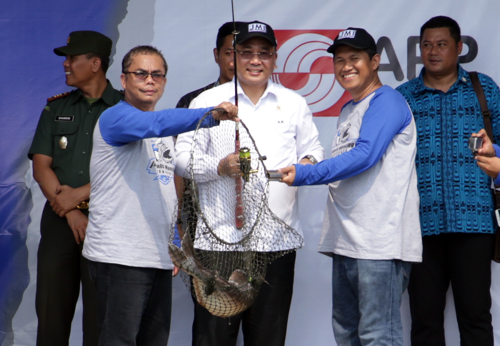 Menteri Desa, PDTT Eko Putro Sandjojo (tengah) mengangkat ikan patin hasil pancingan seberat 7 kg disela-sela acara tanda dibukanya kegiatan Fun Fishing antar forum Wartawan saat peluncuran Jurnalis Mancing Indonesia (JMI) di Kolam Pemancingan Adhiraja Deluna, Depok, Jawa Barat, Sabtu (21/10). JMI merupakan komuninas penghobi mancing yang anggotanya merupakan awak media di Indonesia. AKTUAL/Dok JMI