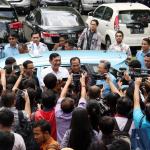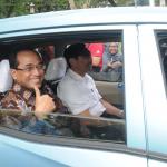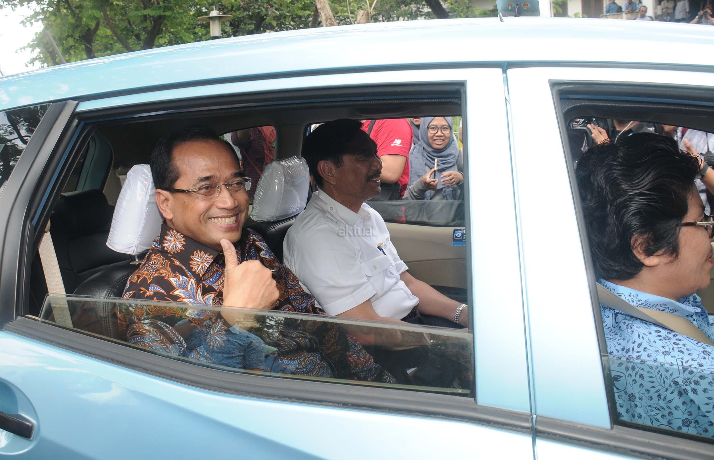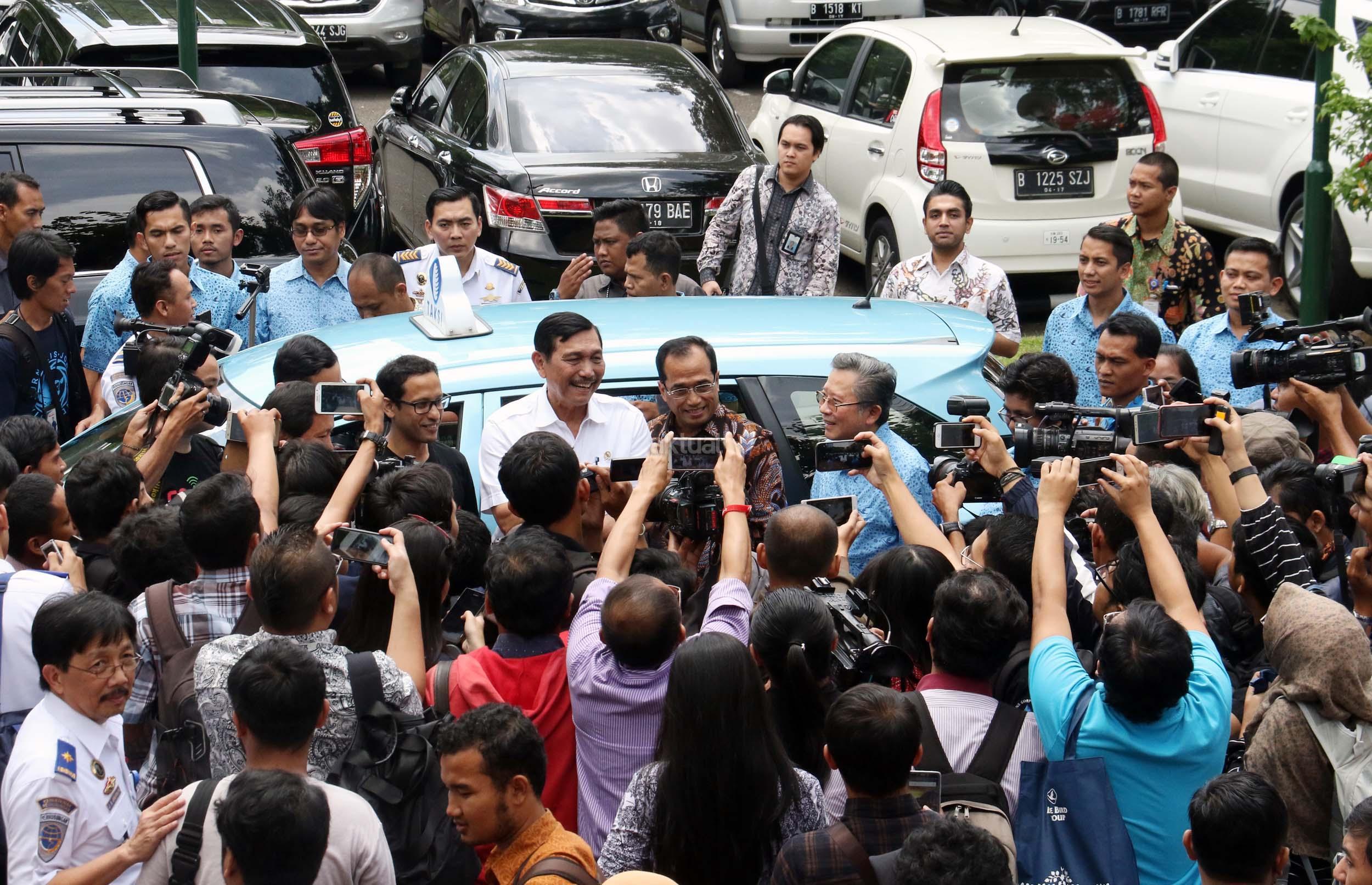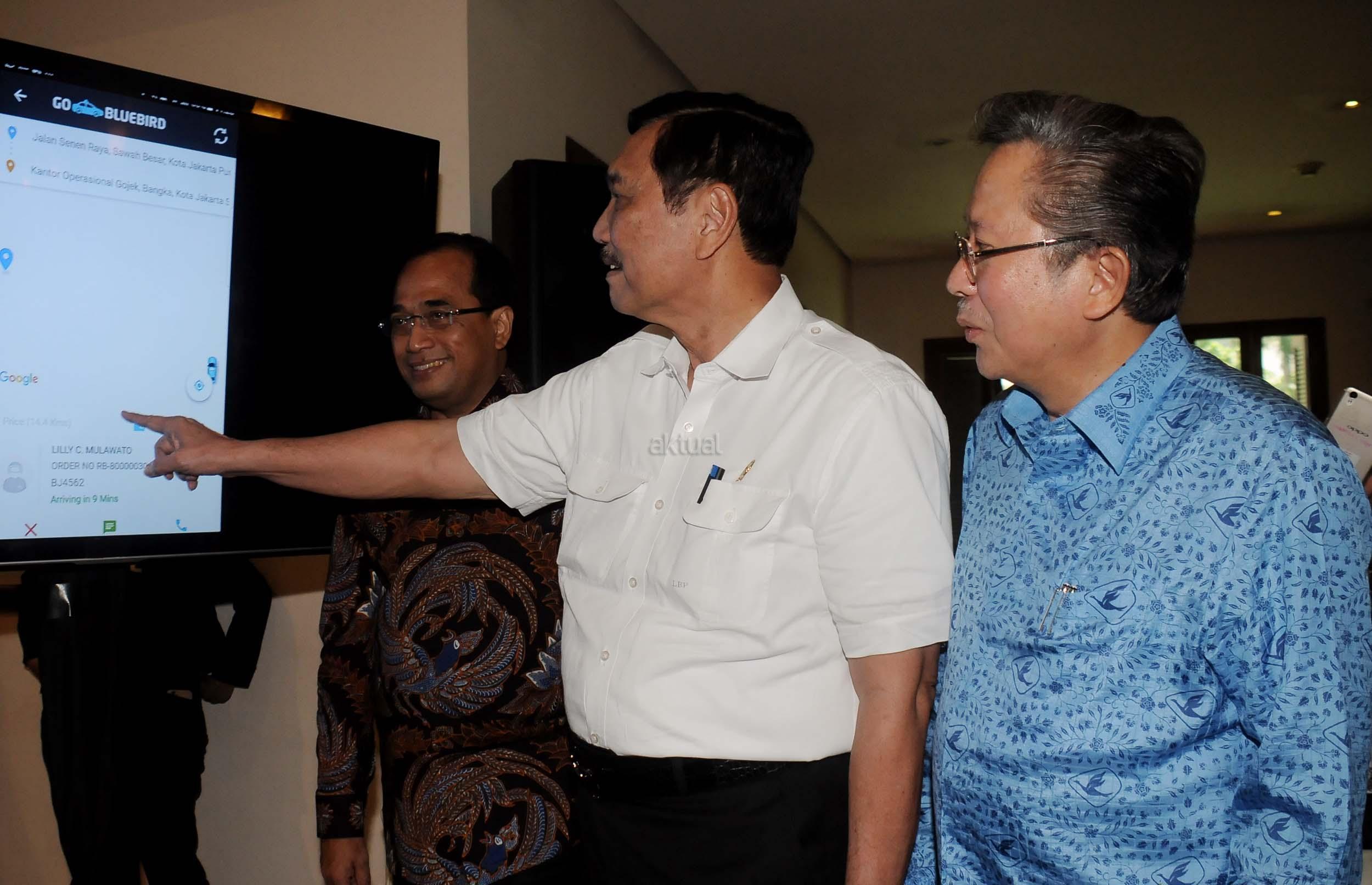 Menko Bidang Kemaritiman Luhut Binsar Panjaitan (kanan) bersama Menhub Budi Karya Sumadi menaiki taksi Blue Bird menggunakan aplikasi Go-Bluebird ketika peluncuran di Jakarta, Kamis (30/3/2017). Kerjasama kedua perusahaan itu untuk memungkinkan masyarakat dapat memesan taksi Blue Bird secara khusus dalam aplikasi GO-JEK sekaligus meningkatkan produktivitas pengemudi. AKTUAL/Munzir