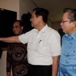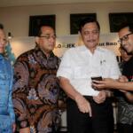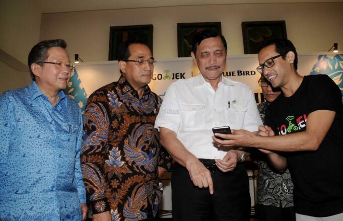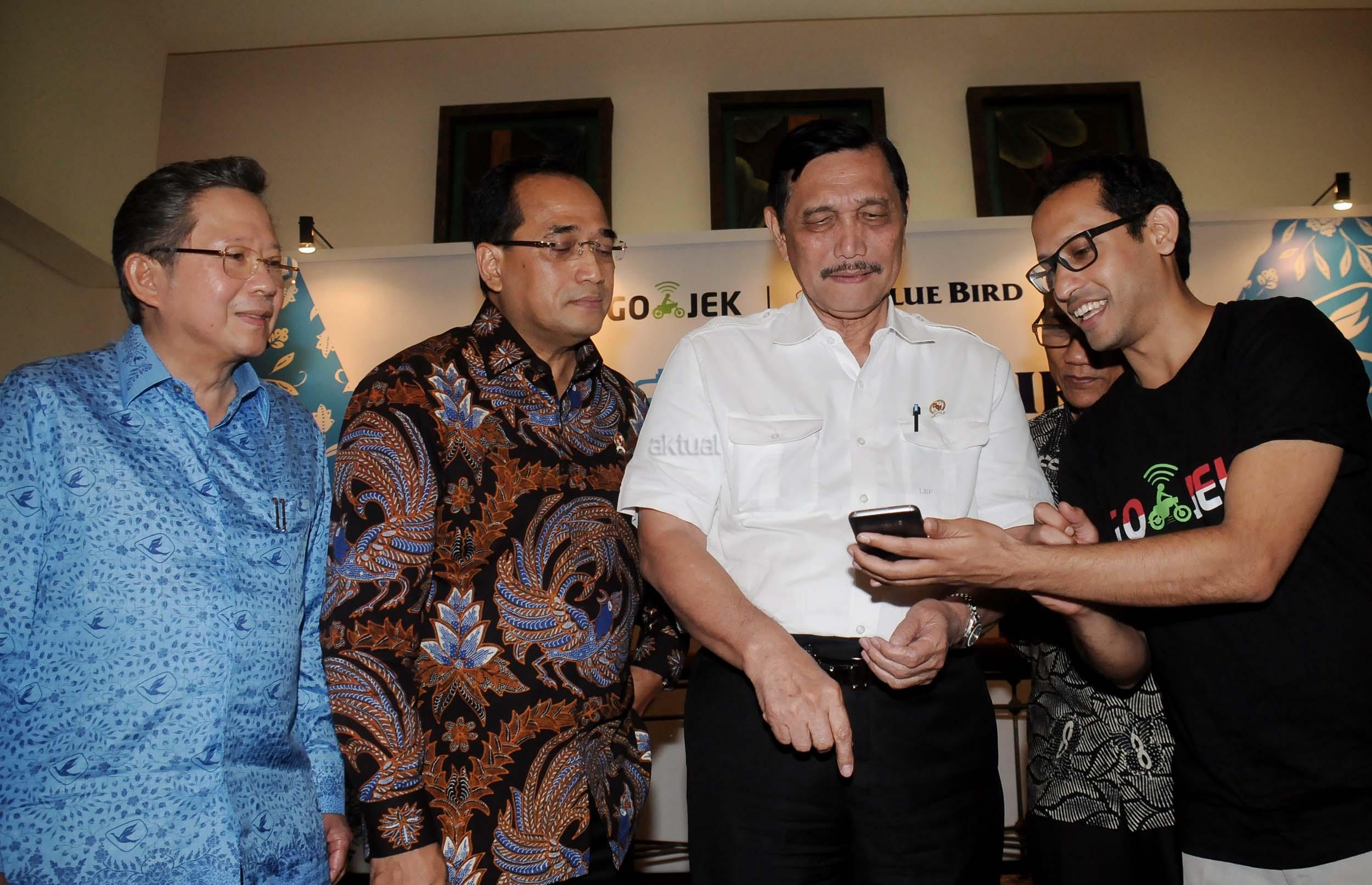 Menko Bidang Kemaritiman Luhut Binsar Panjaitan (Kedua kanan) bersama Menhub Budi Karya Sumadi (kedua kiri), mendengarkan penjelasan tentang aplikasi Go-Bluebird oleh CEO Go-Jek Nadiem Makarim (kanan) disaksikan Dirut PT Blue Bird Purnomo Prawiro ketika peluncuran aplikasi Go-Bluebird di Jakarta, Kamis (30/3/2017). Kerjasama kedua perusahaan itu untuk memungkinkan masyarakat dapat memesan taksi Blue Bird secara khusus dalam aplikasi GO-JEK sekaligus meningkatkan produktivitas pengemudi. AKTUAL/Munzir
