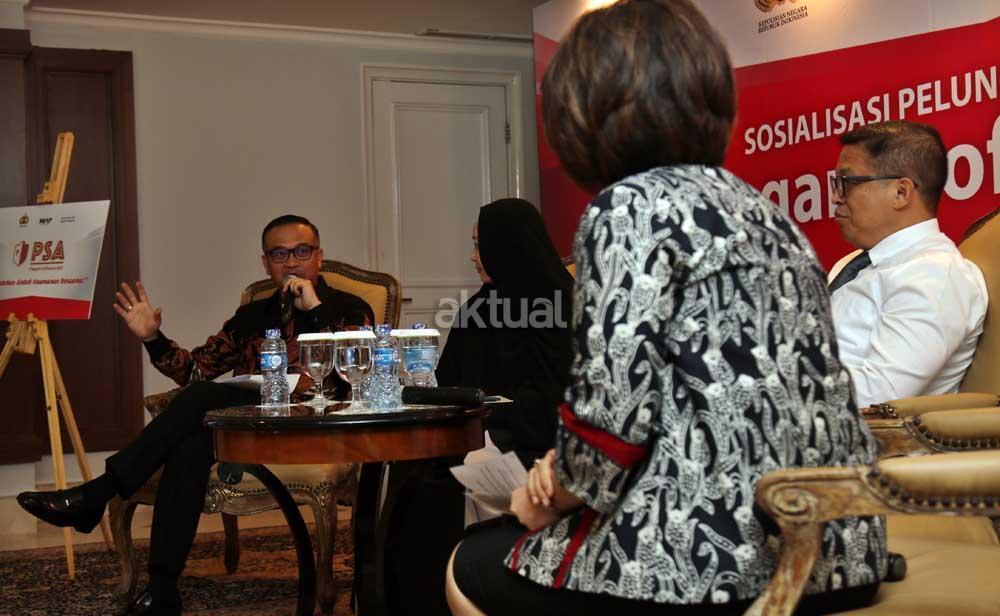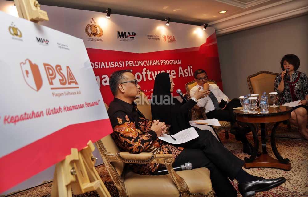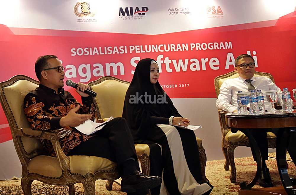 Ketua Masyarakat Indonesia Anti Pemalsuan Justisiari P Kusumah (kiri), Juru Bicara Asia Center for Digital Integrity Widyaretna Buenastuti (tengah) dan Direktur Tindak Pidana Ekonomi Khusus Badan Reserse Kriminal Polri Brigjen Pol Agung Setya (kanan) membedah kejahatan penggunaan saftware palsu saat peluncuran program Piagam Sofware Asli di Jakarta, Senin (23/10). Program ini untuk mengedukasi para pelaku bisnis mengenai pentingnya menggunakan perangkat lunak asli demi keamanan dari risiko kejahatan cyber. AKTUAL/Tino Oktaviano