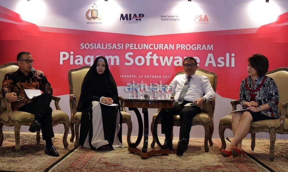 Ketua Masyarakat Indonesia Anti Pemalsuan Justisiari P Kusumah (kiri), Juru Bicara Asia Center for Digital Integrity Widyaretna Buenastuti (kedua kiri) dan Direktur Tindak Pidana Ekonomi Khusus Badan Reserse Kriminal Polri Brigjen Pol Agung Setya (kedua kanan) membedah kejahatan penggunaan saftware palsu saat peluncuran program Piagam Sofware Asli di Jakarta, Senin (23/10). Program ini untuk mengedukasi para pelaku bisnis mengenai pentingnya menggunakan perangkat lunak asli demi keamanan dari risiko kejahatan cyber. AKTUAL/Tino Oktaviano
