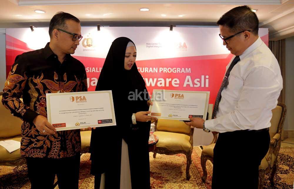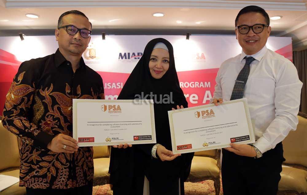 Ketua Masyarakat Indonesia Anti Pemalsuan Justisiari P Kusumah (kiri), Juru Bicara Asia Center for Digital Integrity Widyaretna Buenastuti (tengah) dan Direktur Tindak Pidana Ekonomi Khusus Badan Reserse Kriminal Polri Brigjen Pol Agung Setya (kanan) memperlihatkan piagam sofware asli saat peluncuran program Piagam Sofware Asli di Jakarta, Senin (23/10). Program ini untuk mengedukasi para pelaku bisnis mengenai pentingnya menggunakan perangkat lunak asli demi keamanan dari risiko kejahatan cyber. AKTUAL/Tino Oktaviano
