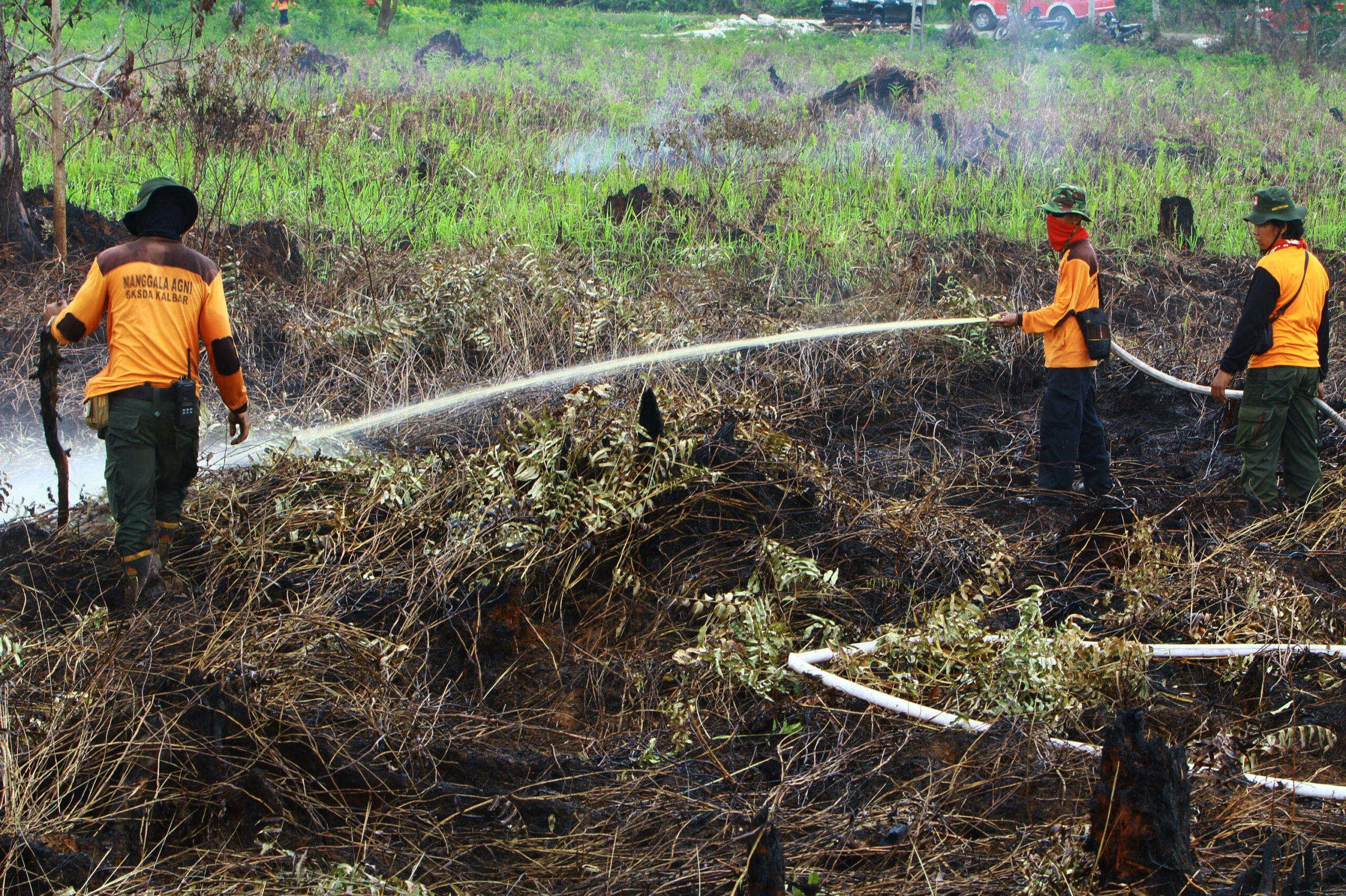 Petugas Manggala Agni memadamkan api yang membakar lahan gambut milik warga di Dusun Limbung, Desa Sido Mulyo, Kecamatan Sungai Raya, Kabupaten Kubu Raya, Kalbar, Selasa (12/7). Petugas Manggala Agni berhasil memadamkan lahan gambut seluas lima hektar yang sengaja dibakar untuk pembukaan lahan garapan tani oleh pemiliknya, Bujang Ali. ANTARA FOTO/Sheravim/jhw/aww/16.