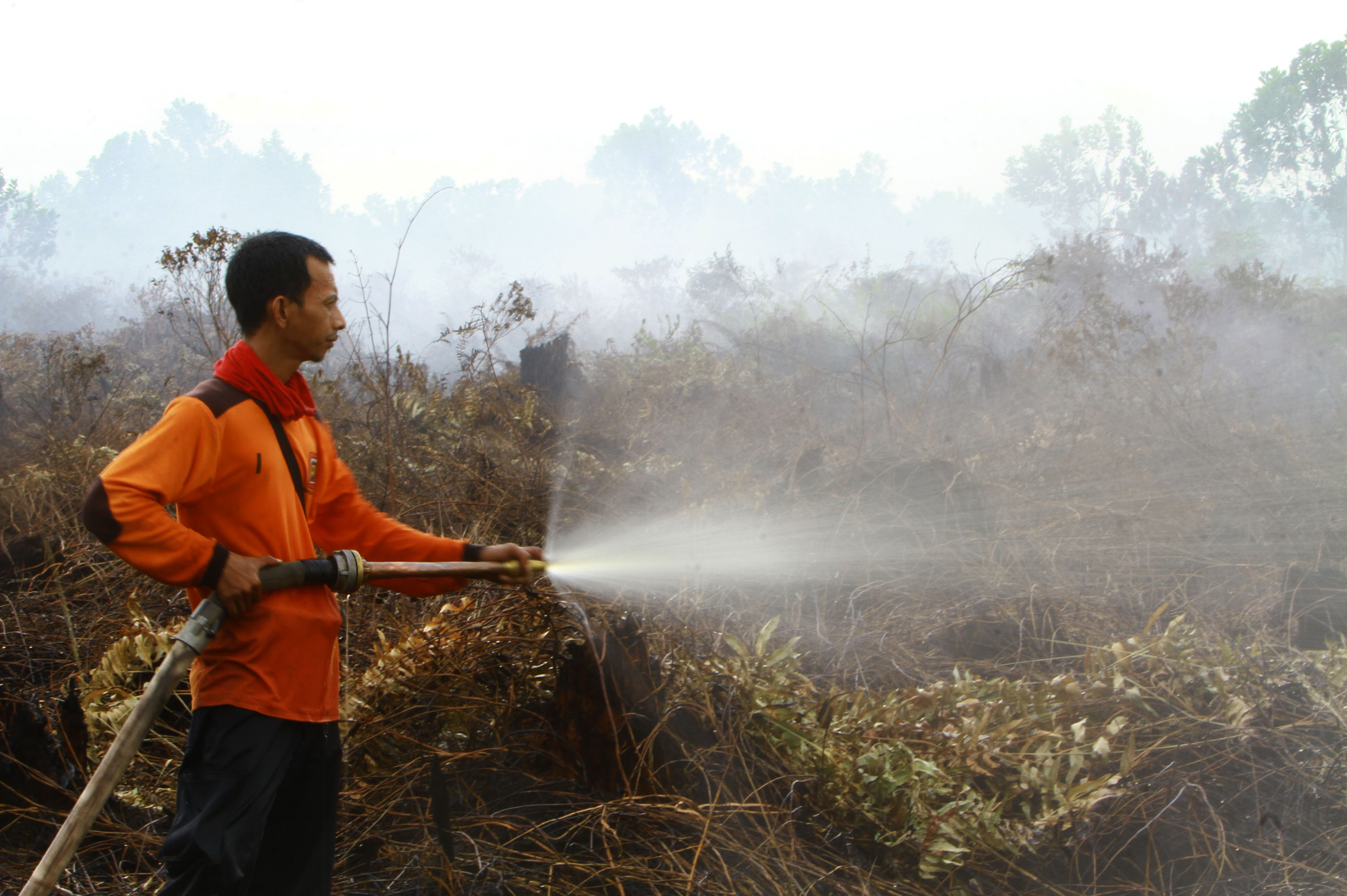 Seorang petugas Manggala Agni memadamkan api yang membakar lahan gambut milik warga di Dusun Limbung, Desa Sido Mulyo, Kecamatan Sungai Raya, Kabupaten Kubu Raya, Kalbar, Selasa (12/7). Petugas Manggala Agni berhasil memadamkan lahan gambut seluas lima hektar yang sengaja dibakar untuk pembukaan lahan garapan tani oleh pemiliknya, Bujang Ali. ANTARA FOTO/Sheravim/jhw/aww/16.
