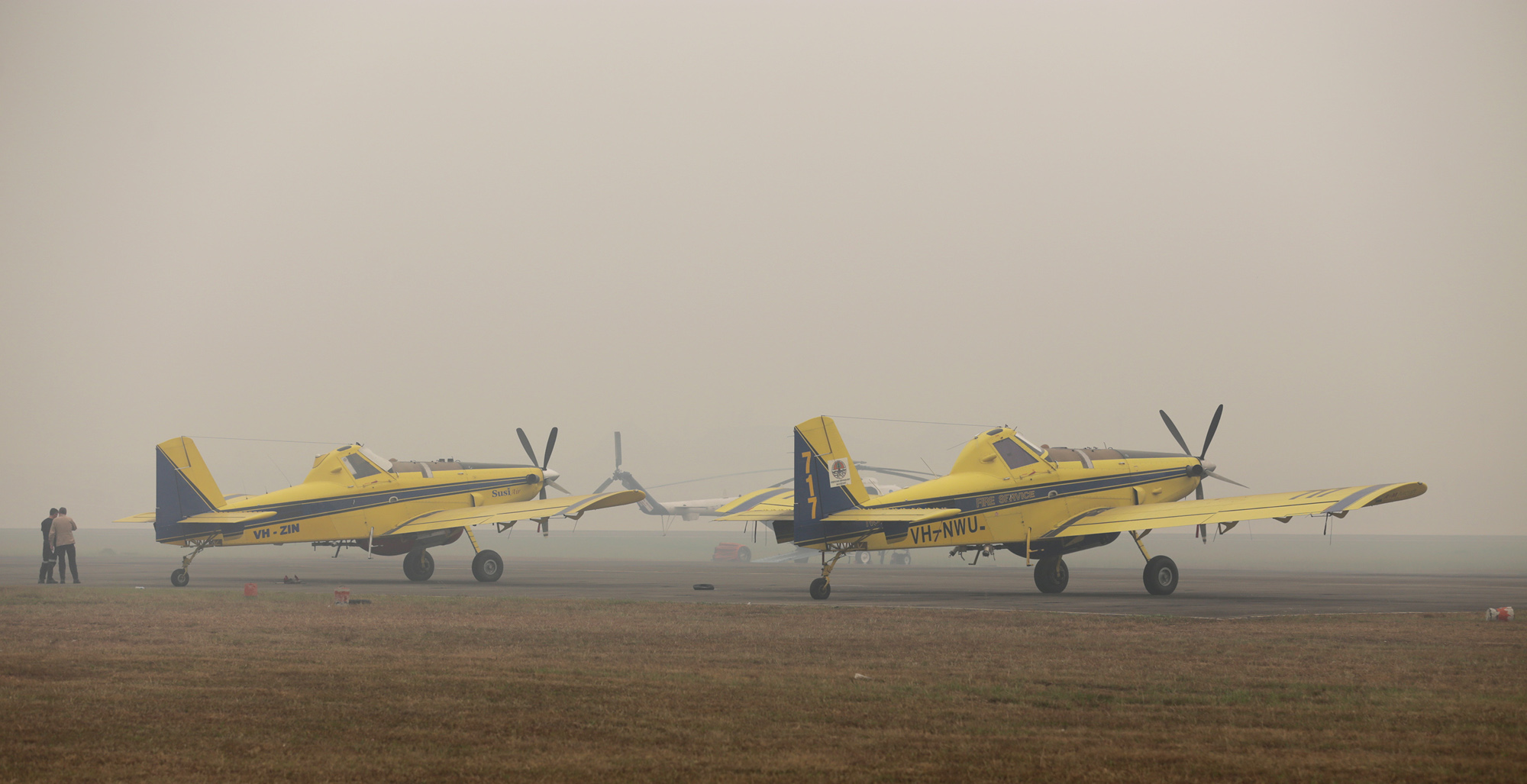 Dua Pesawat Air Tractor AT802F milik Kementerian Lingkungan Hidup dan Kehutanan (KLHK) asal Australia parkir di base ops Landasan Udara (Lanud) Palembang menunggu jarak pandang membaik, Palembang, Sumsel. Senin (28/9). Berdasarkan data dari BMKG jarak pandang di Palembang mengalami penurunan hingga 300m. Operasi pemadaman kebakaran lahan dari udara (water boombing) tidak dapat dilakukan jika jarak pandang dibawah 1500m. ANTARA FOTO/Nova Wahyudi/nz/15