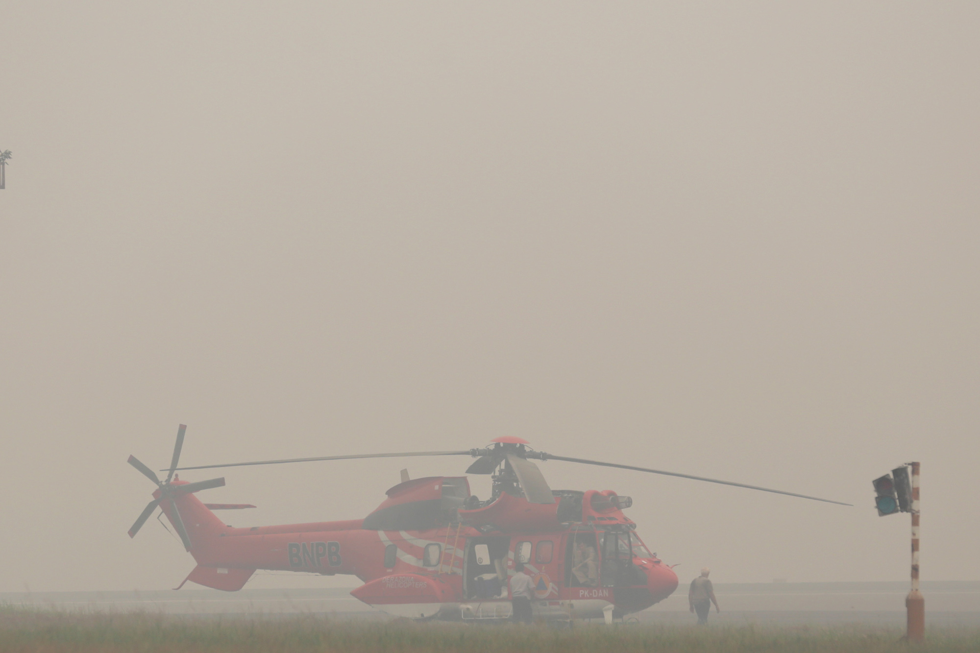 Helikopter Sikorski AS 332 (super puma) milik Badan Nasional Penanggulangan Bencana (BNPB) parkir di base ops Landasan Udara (Lanud) Palembang menunggu jarak pandang membaik, Palembang, Sumsel. Senin (28/9). Berdasarkan data dari BMKG jarak pandang di Palembang mengalami penurunan hingga 300m. Operasi pemadaman kebakaran lahan dari udara (water boombing) tidak dapat dilakukan jika jarak pandang dibawah 1500m. ANTARA FOTO/Nova Wahyudi/nz/15