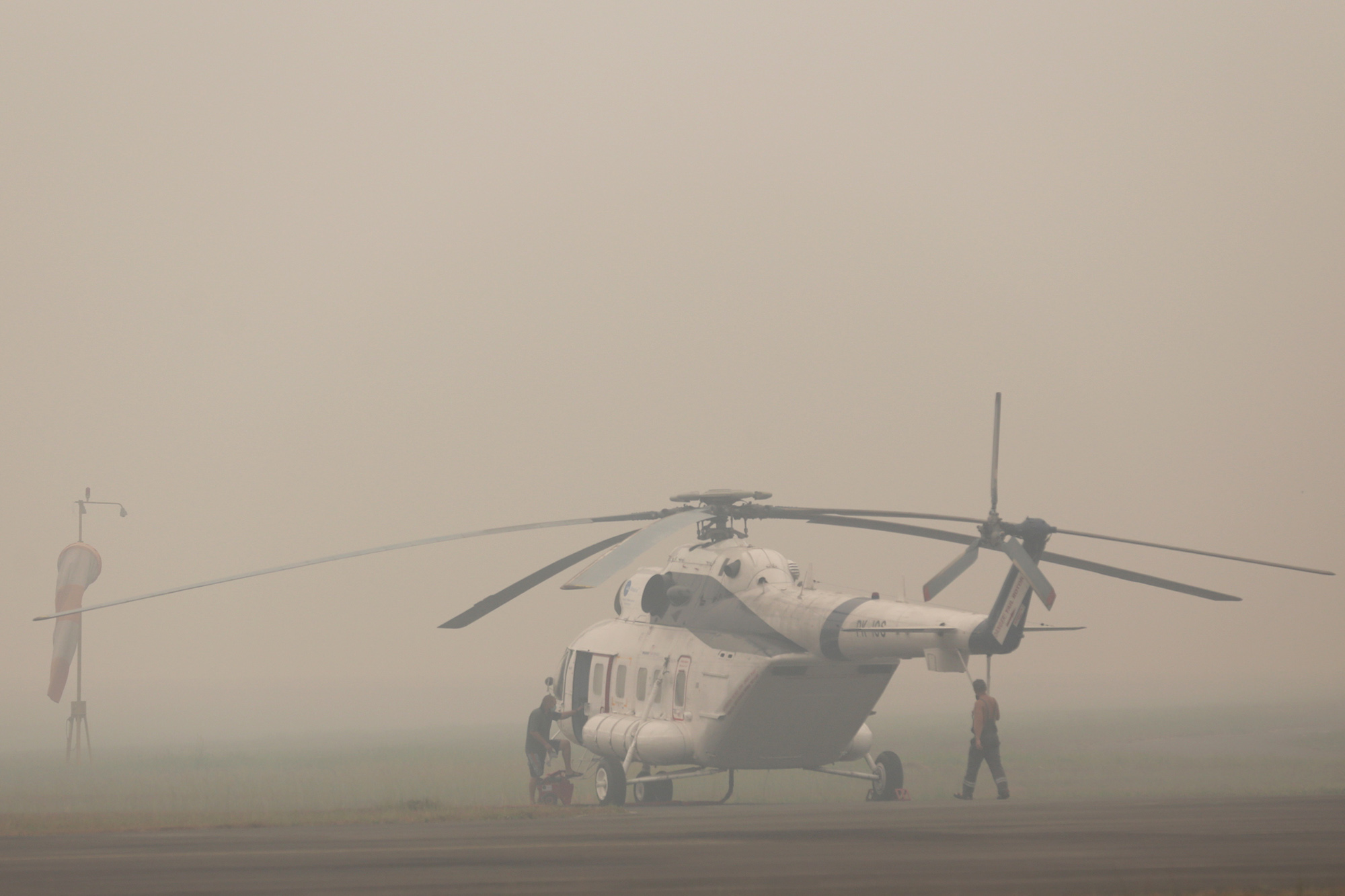 Helikopter MI-171 milik Badan Nasional Penanggulangan Bencana (BNPB) parkir di base ops Landasan Udara (Lanud) Palembang menunggu jarak pandang membaik, Palembang, Sumsel. Senin (28/9). Berdasarkan data dari BMKG jarak pandang di Palembang mengalami penurunan hingga 300m. Operasi pemadaman kebakaran lahan dari udara (water boombing) tidak dapat dilakukan jika jarak pandang dibawah 1500m. ANTARA FOTO/Nova Wahyudi/nz/15