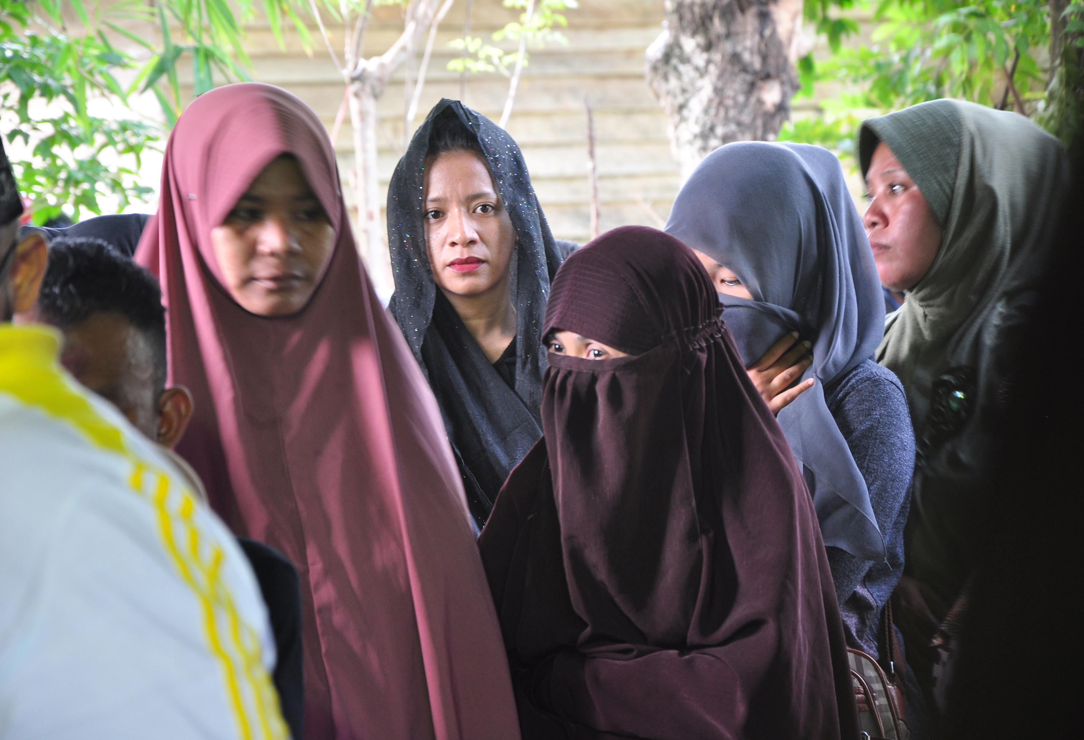 Istri Muhtar (tengah) salah satu anggota kelompok sipil bersenjata Poso yang mati tertembak, menyaksikan proses pemakaman jenasah kakaknya di pemakaman umum Keluarahan Lambara, Kecamatan Tawaeli, Palu, Sulawesi Tengah, Sabtu (23/7). Muhtar dan Santoso merupakan pemimpin Mujahidin Indonesia Timur (MIT) di Poso yang mati tertembak saat baku tembak di Tambarana, Poso Pesisir Utara, Poso Senin (18/7) lalu. ANTARAFOTO/ZAINUDDIN MN/EDDY MAHYUDIN/ama/16