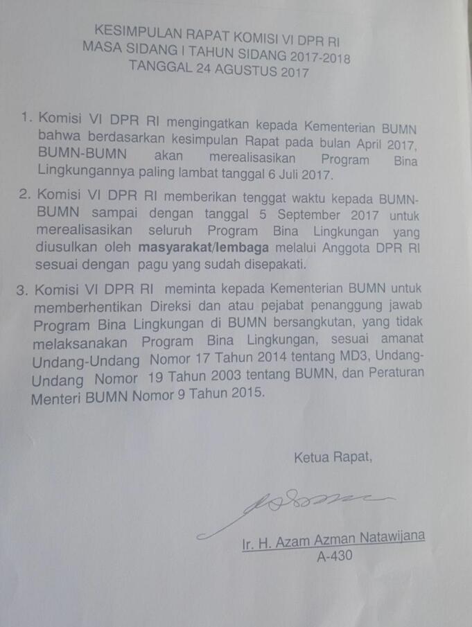 2.Komisi VI DPR RI memberikan tenggat waktu kepada BUMN sampai dengan tanggal 5 September 2017 untuk merealisasikan seluruh program Bina Lingkungan yang diusulkan oleh masyarakat/lembaga melalui anggota DPR RI sesui dengan pagu yang telah disepakati.