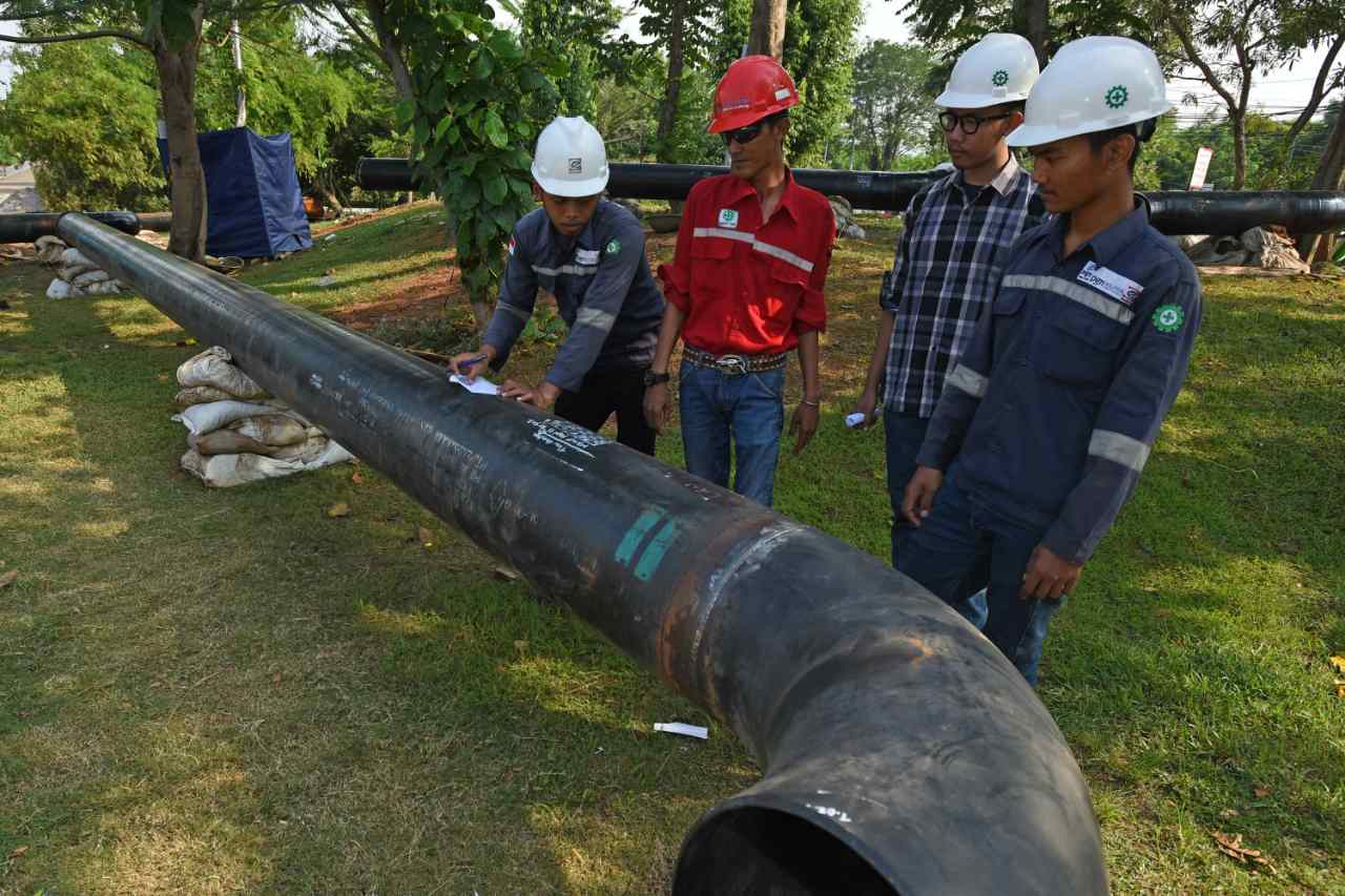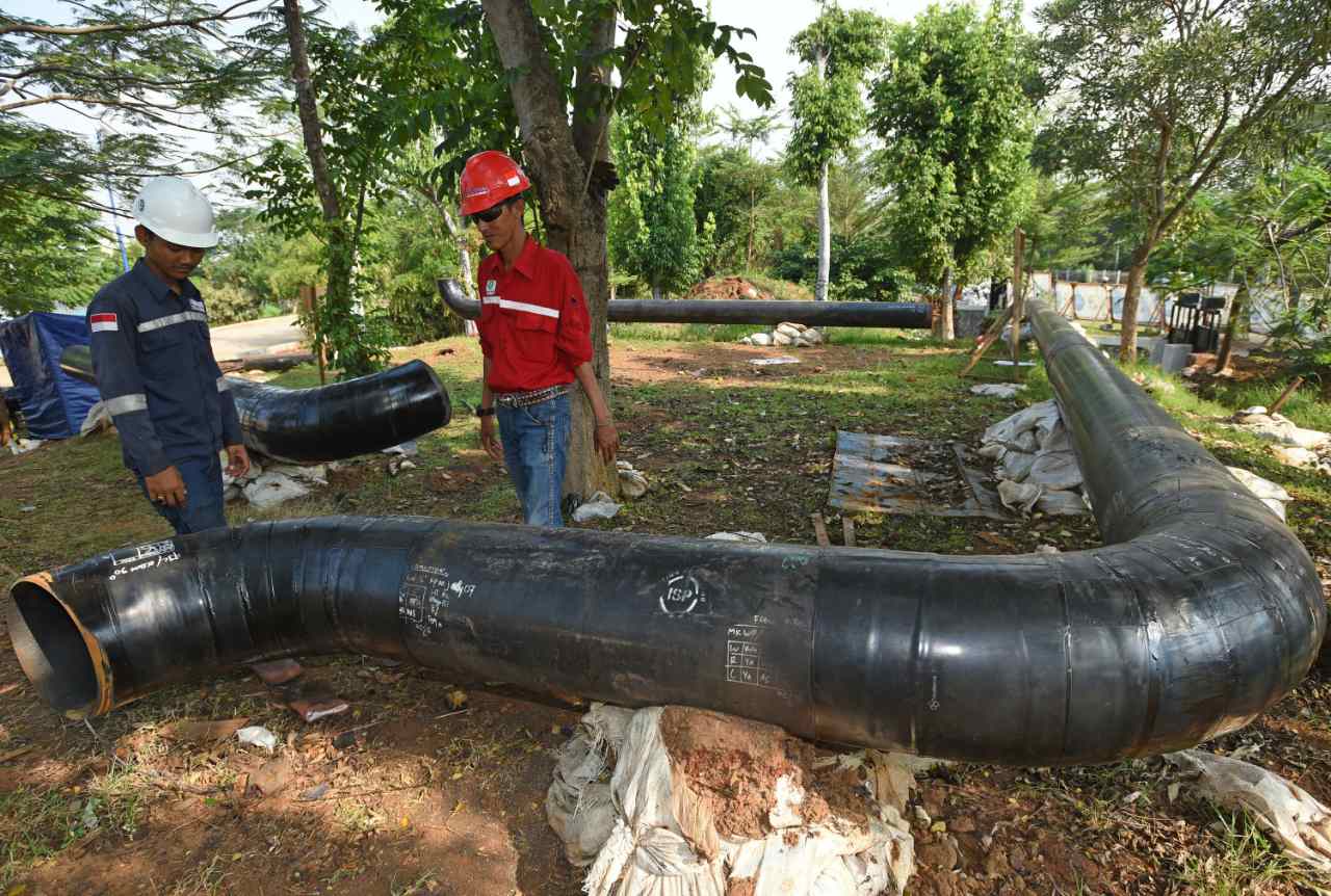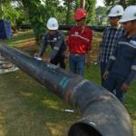 Dua pekerja mengecek pipa gas bumi yang akan dipasang untuk menyambungkan jalur Muara Karang-Muara Bekasi di Penjaringan, Jakarta, Jumat (29/7). Sampai dengan 2019 Perusahaan Gas Negara (PGN) menargetkan penambahan panjang pipa gas bumi sepanjang 1680 km sebagai komitmen dalam memperluas jaringan gas bumi di berbagai daerah. ANTARA FOTO/Wahyu Putro A/kye/16