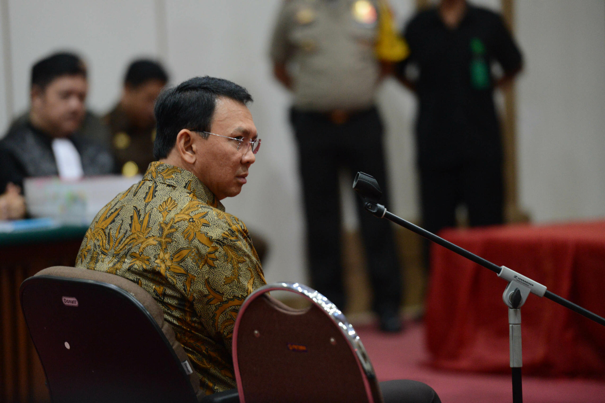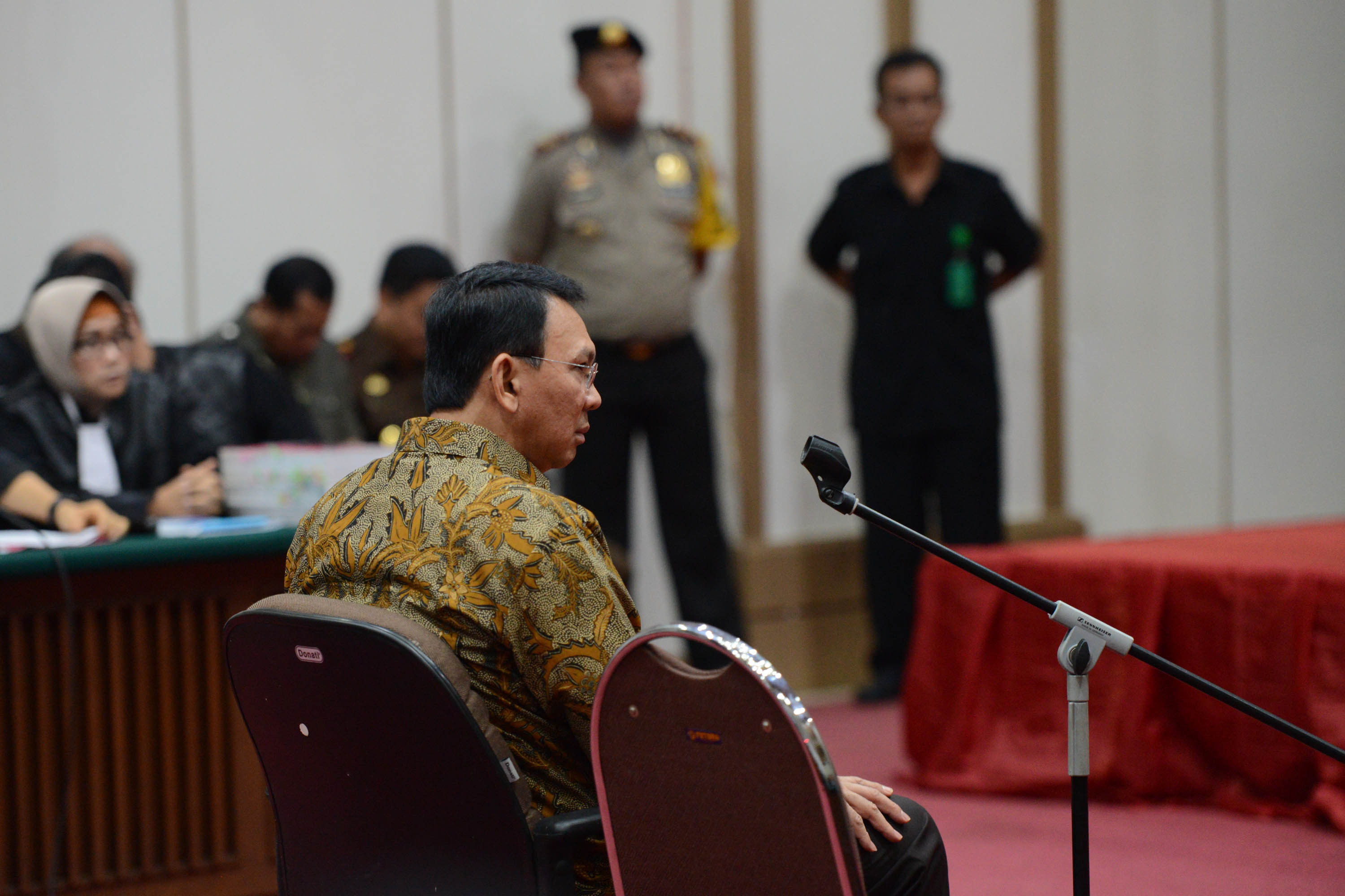 Terdakwa kasus dugaan penistaan agama Basuki Tjahaja Purnama atau Ahok menjalani sidang lanjutan dengan agenda pembacaan tuntutan di Pengadilan Jakarta Utara, Auditorium Kementan, Jakarta, Selasa (11/4). Dengan alasan belum selesai pengetikan tuntutan, Jaksa Penuntut Umum memohon Majelis Hakim untuk menunda persidangan pada Kamis (20/4) mendatang. Foto: Media Indonesia-POOL/Rommy Pujianto