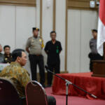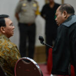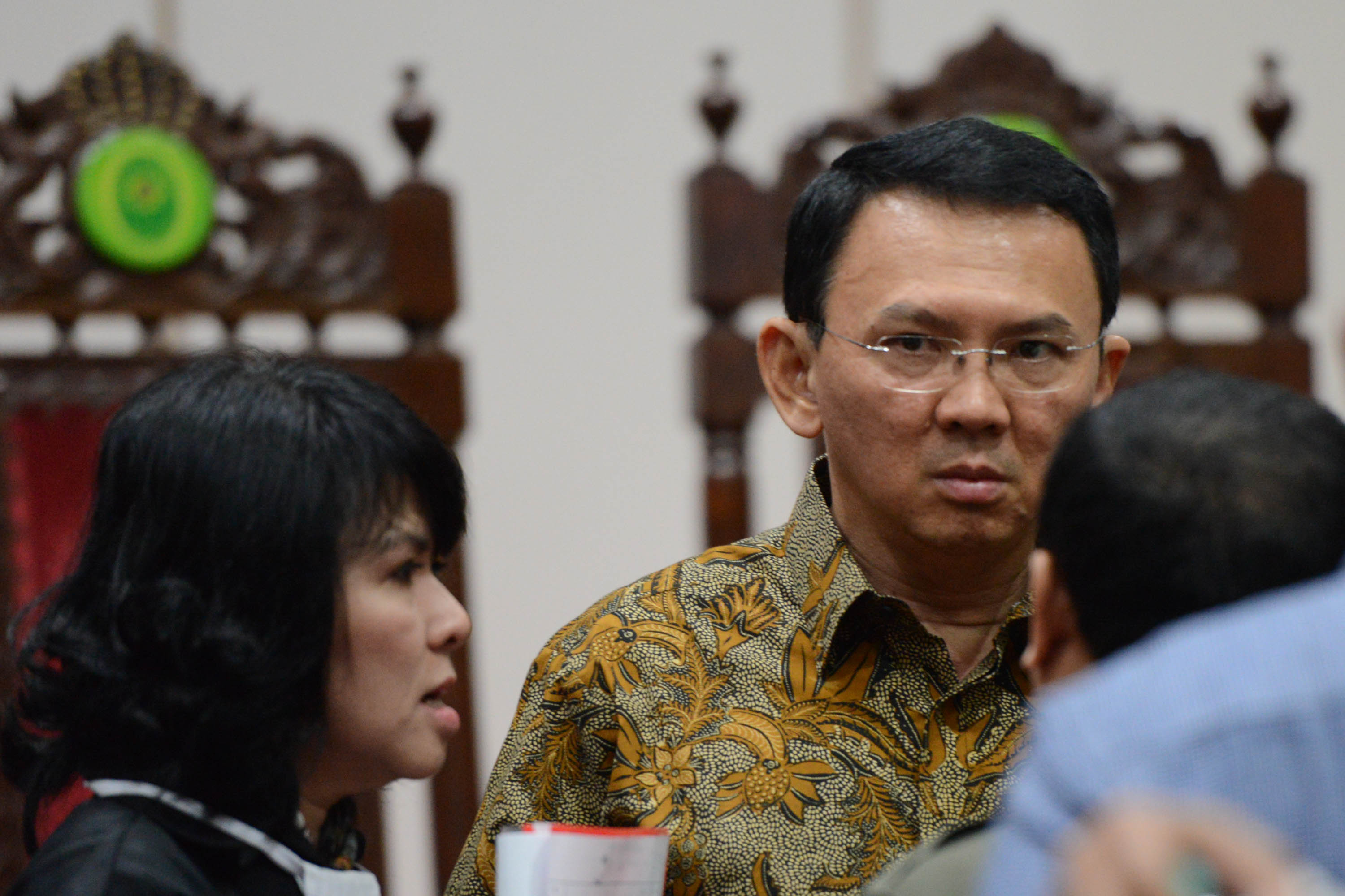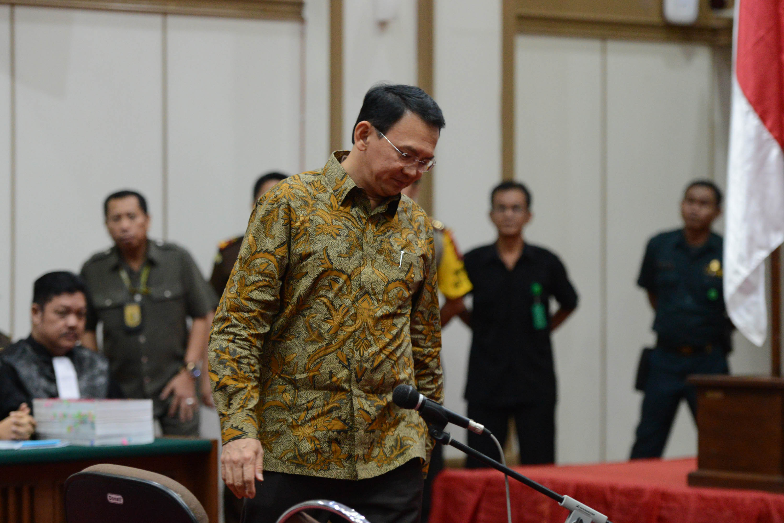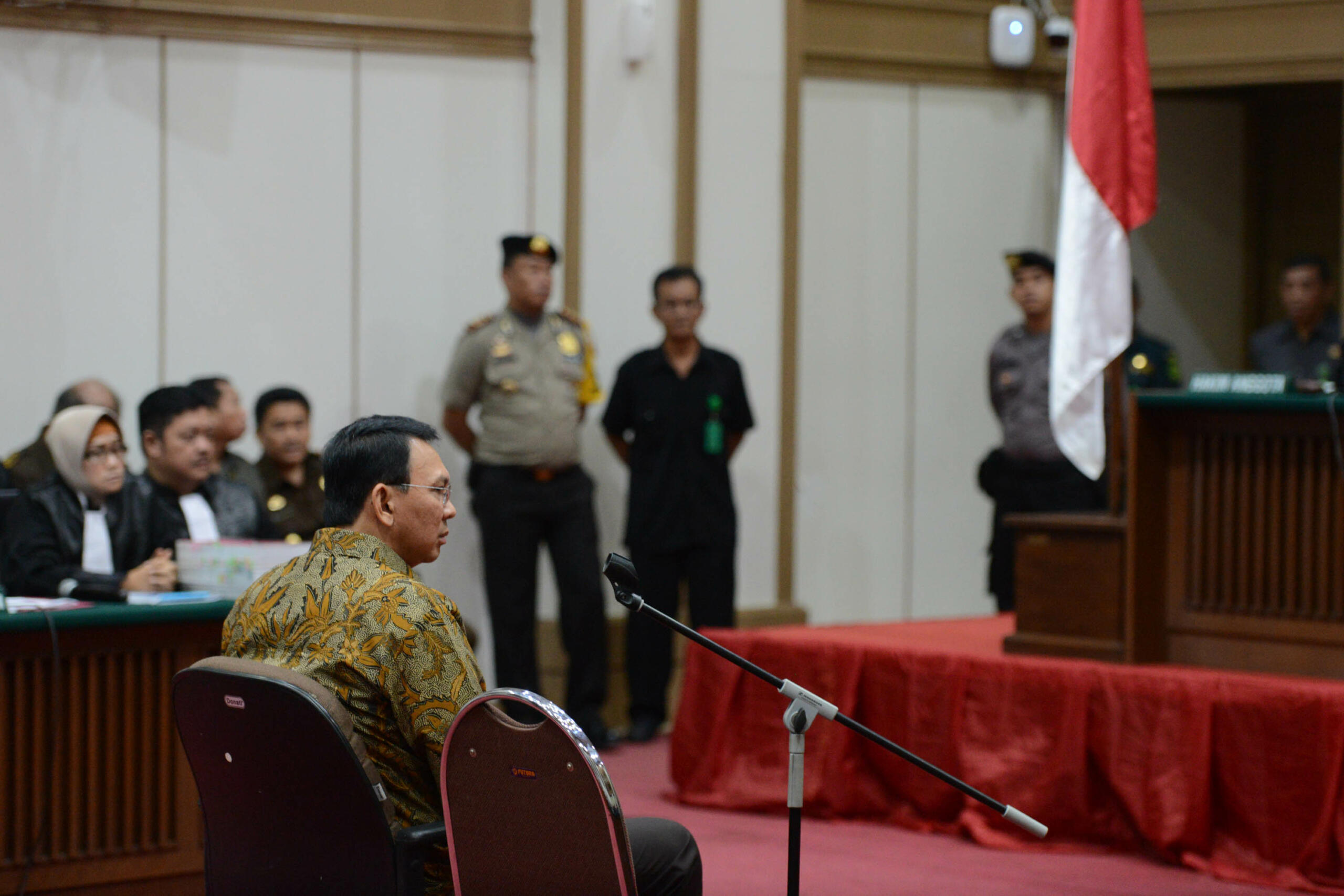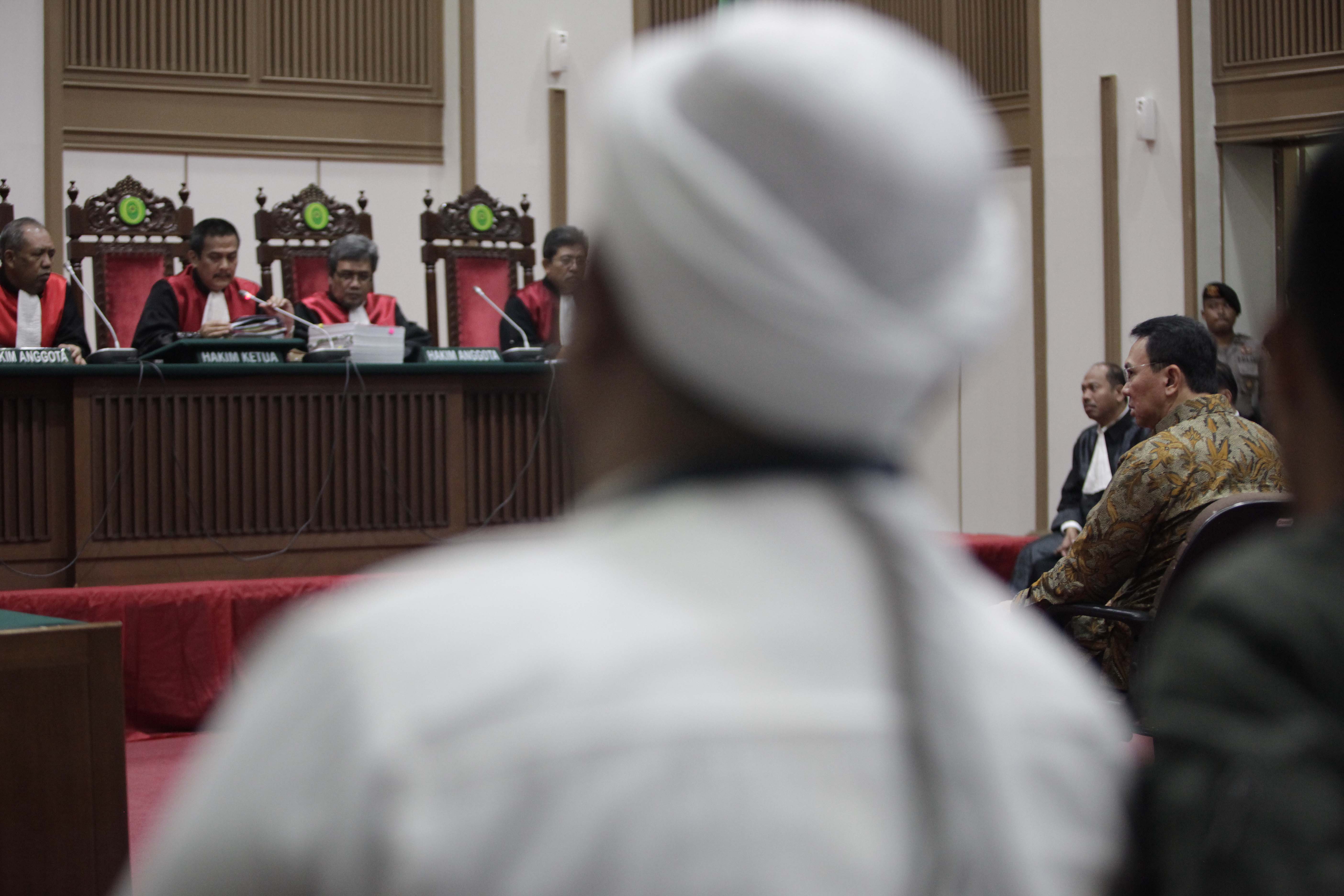 Hakim ketua Dwiarso Budi Santiarto (kedua kiri) memimpin sidang lanjutan kasus dugaan penistaan agama dengan terdakwa Basuki Tjahaja Purnama atau Ahok menjalani sidang lanjutan dengan agenda pembacaan tuntutan di Pengadilan Jakarta Utara, Auditorium Kementan, Jakarta, Selasa (11/4). Dengan alasan belum selesai pengetikan tuntutan, Jaksa Penuntut Umum memohon Majelis Hakim untuk menunda persidangan pada Kamis (20/4) mendatang. Foto: Media Indonesia-POOL/Rommy Pujianto