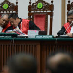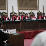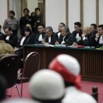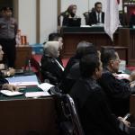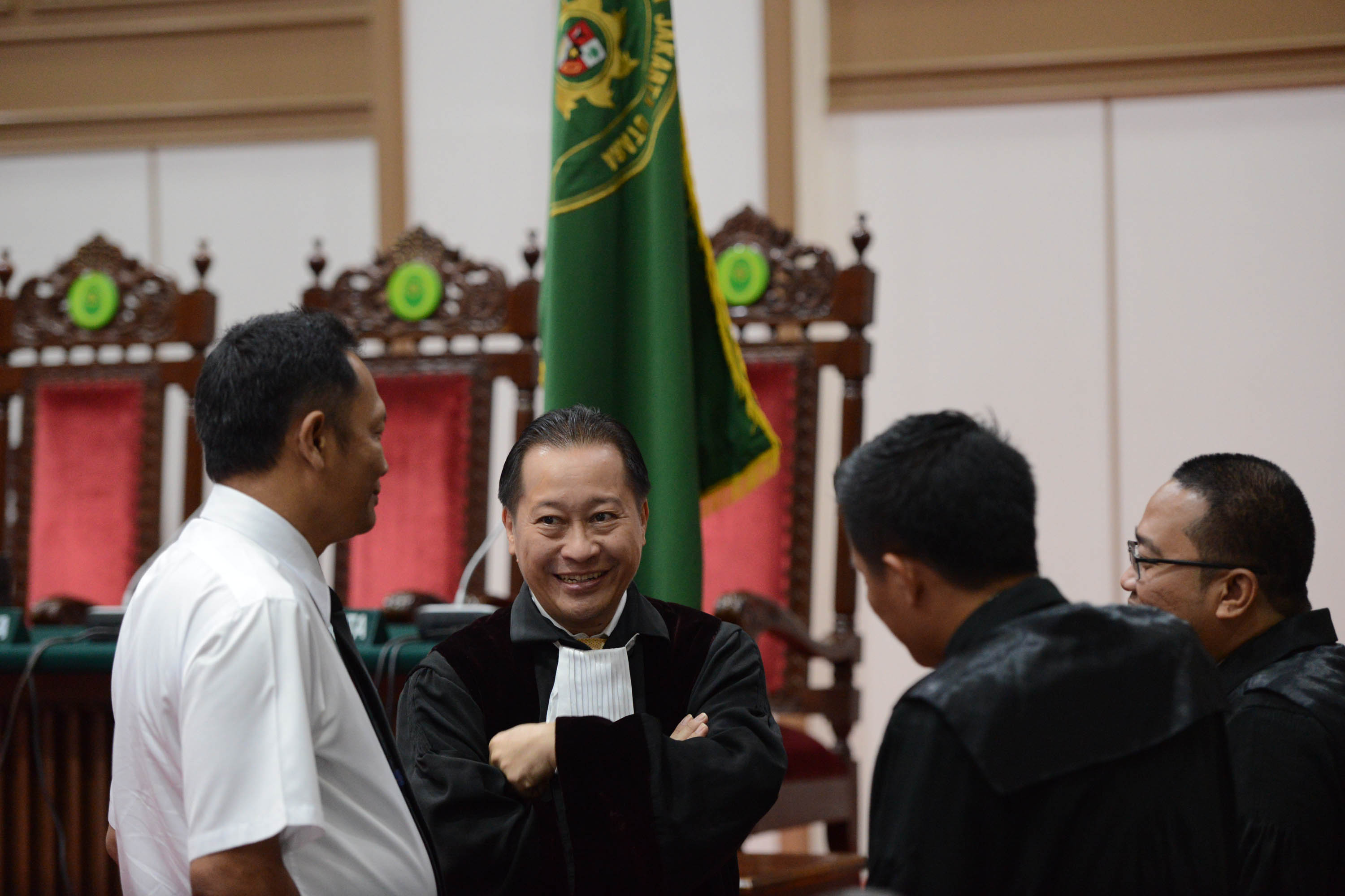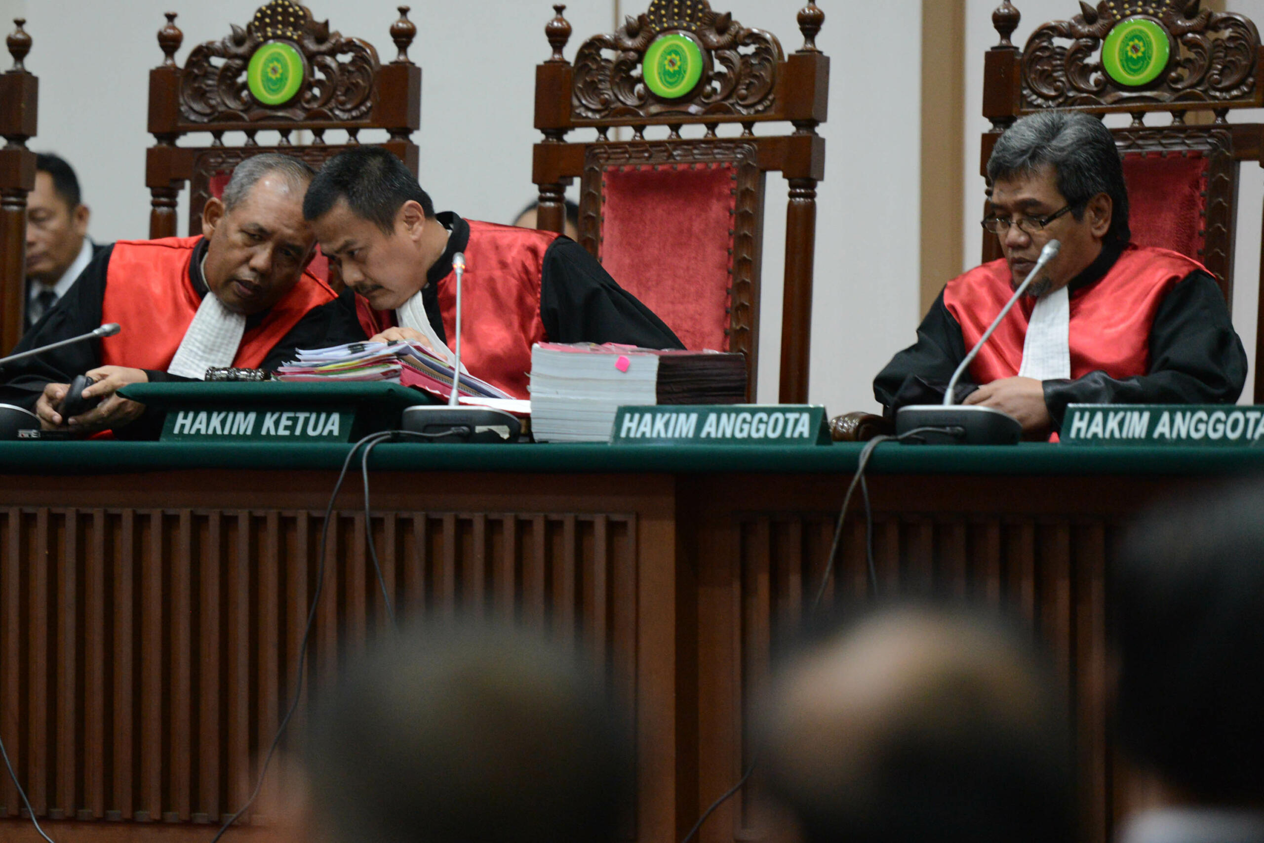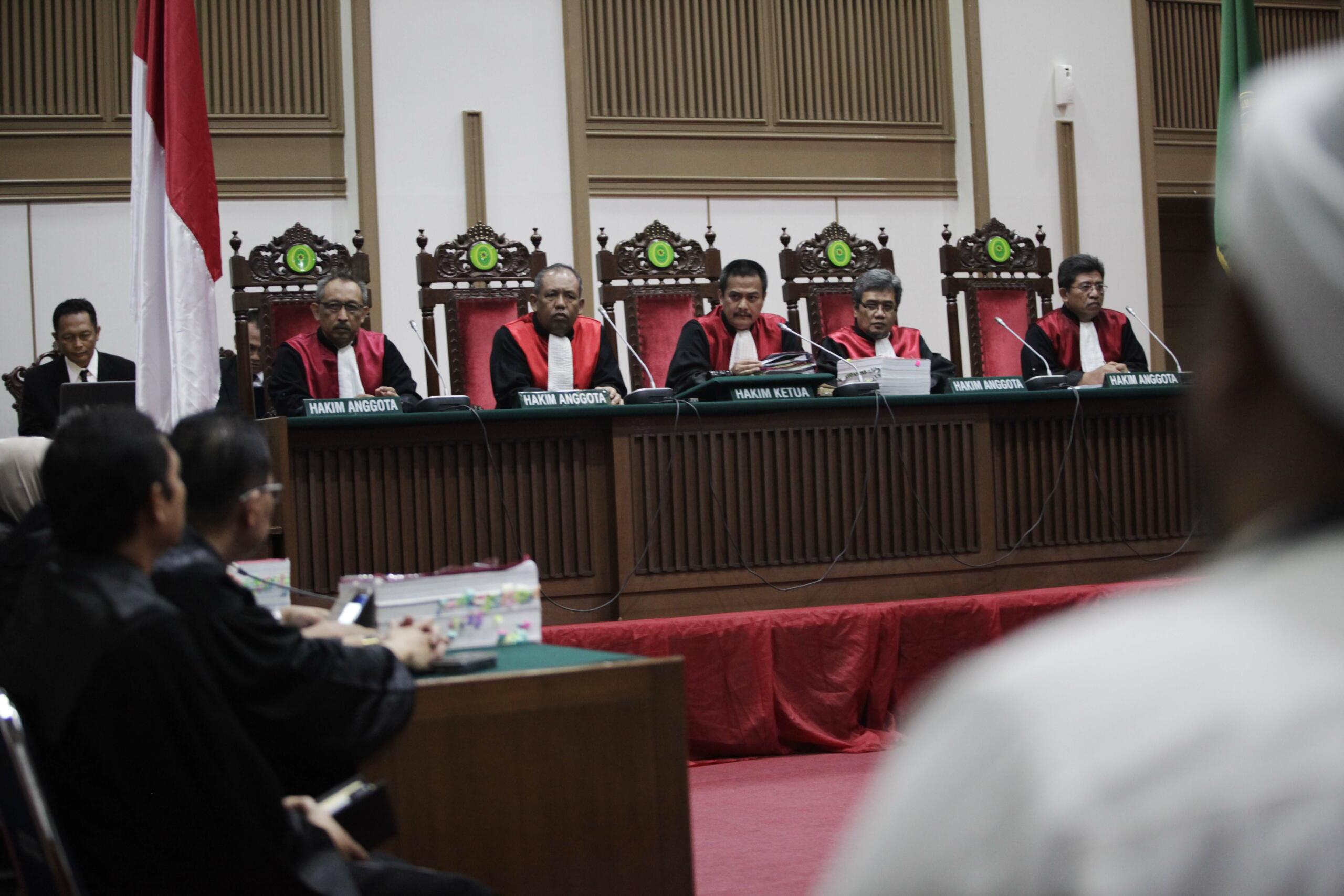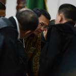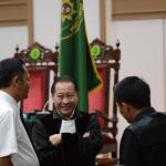 Hakim Ketua Dwiarso Budi Santiarto (kedua kiri) berbincang bersama hakim anggota saat memimpin sidang denganTerdakwa sidang dengan Terdakwa kasus dugaan penistaan agama Gubernur DKI Jakarta, Basuki Tjahaja Purnama dengan agenda pembacaan tuntutan yang digelar oleh Pengadilan Negeri Jakarta Utara di Auditorium Kementerian Pertanian, Jakarta, Selasa (11/4). Sidang tersebut ditunda hingga 20 April mendatang karena Jaksa belum selesai mengetik tuntutan. Foto: Republika/Raisan Al Farisi/POOL Foto: Raisan Al Farisi/Republika