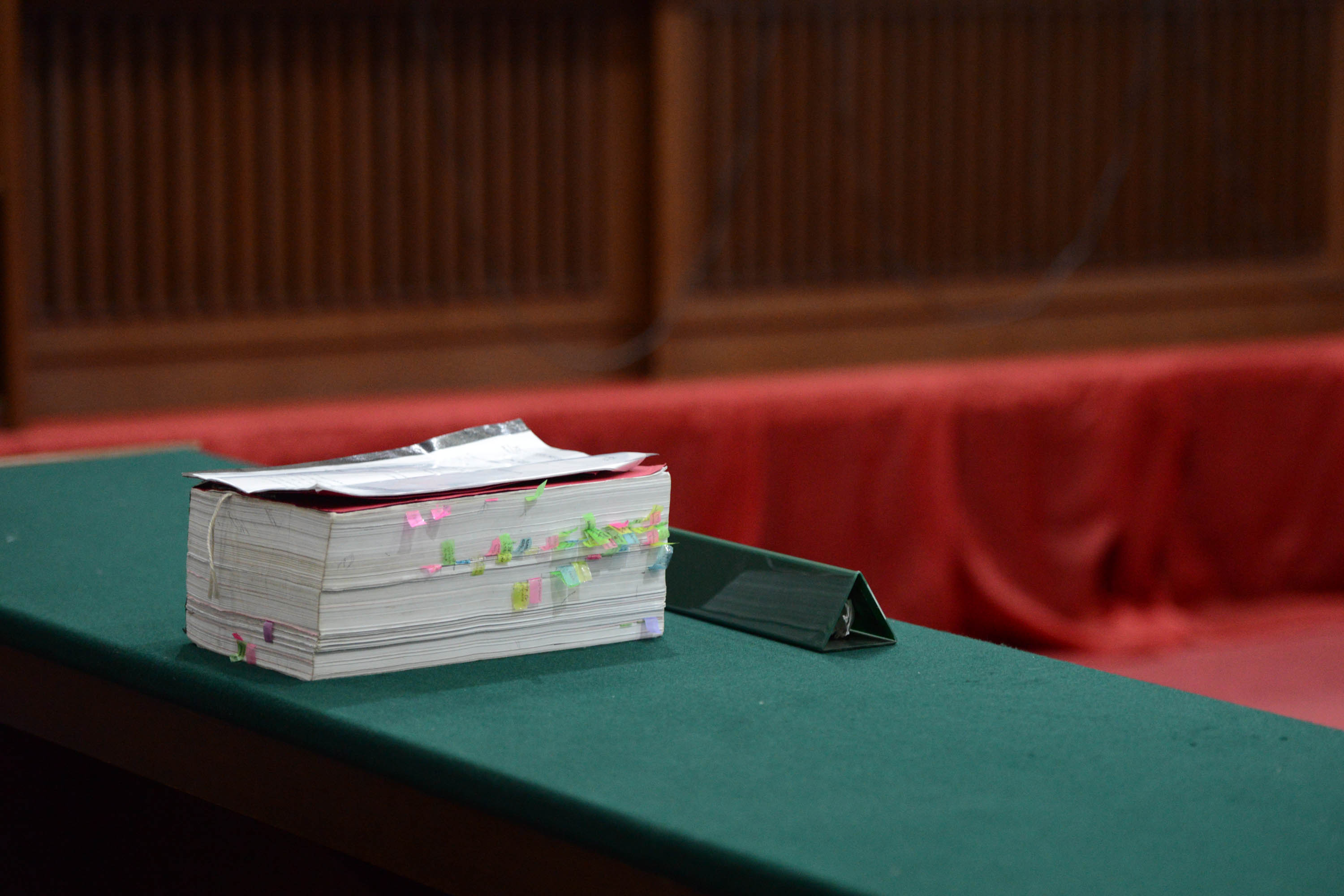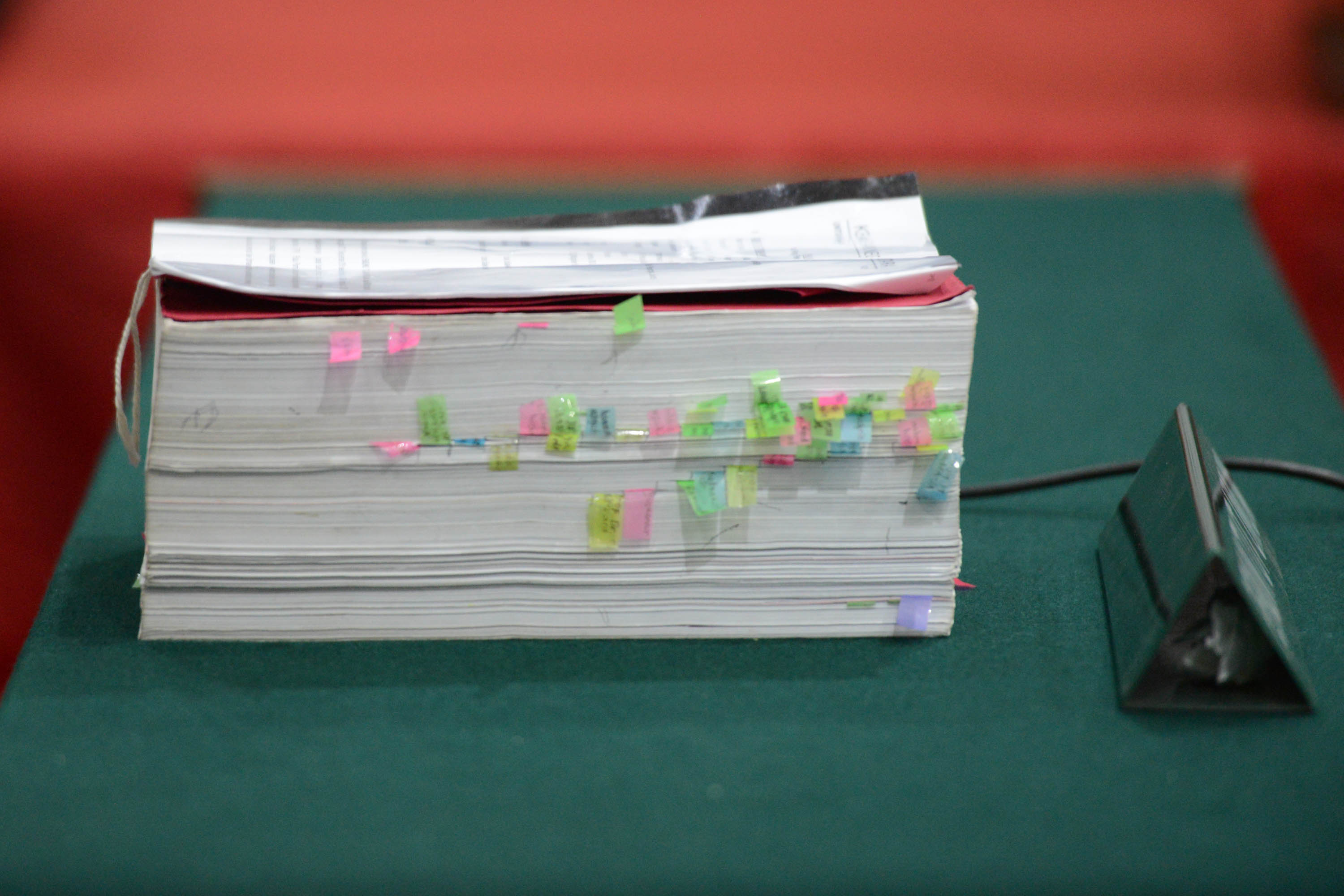 Berkas tuntutan dari terdakwa kasus dugaan penistaan agama Gubernur DKI Jakarta, Basuki Tjahaja Purnama saat sidang dengan agenda pembacaan tuntutan yang digelar oleh Pengadilan Negeri Jakarta Utara di Auditorium Kementerian Pertanian, Jakarta, Selasa (11/4). Sidang tersebut ditunda hingga 20 April mendatang karena Jaksa belum selesai mengetik tuntutan. Foto: Republika/Raisan Al Farisi/POOL Foto: Raisan Al Farisi/Republika