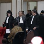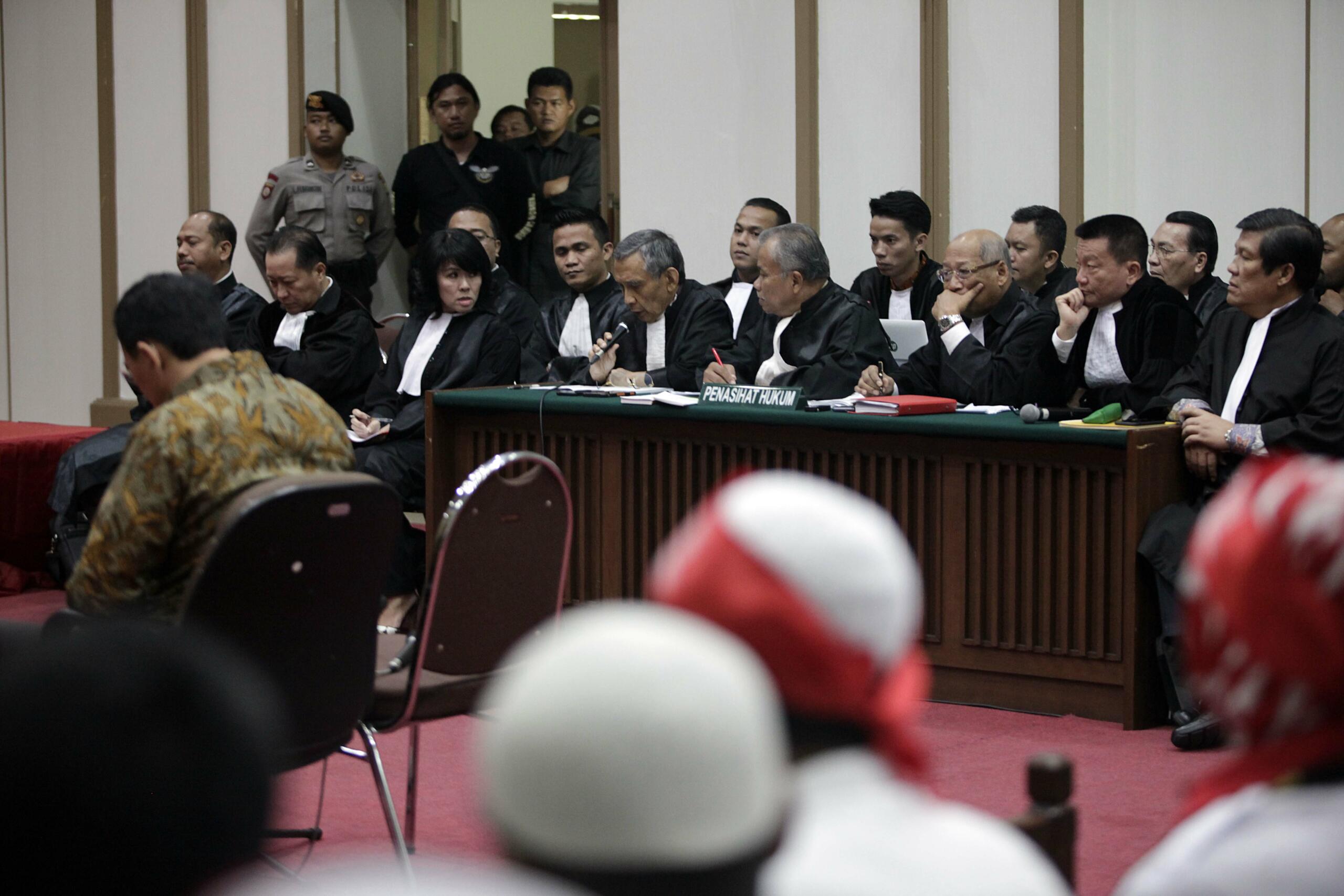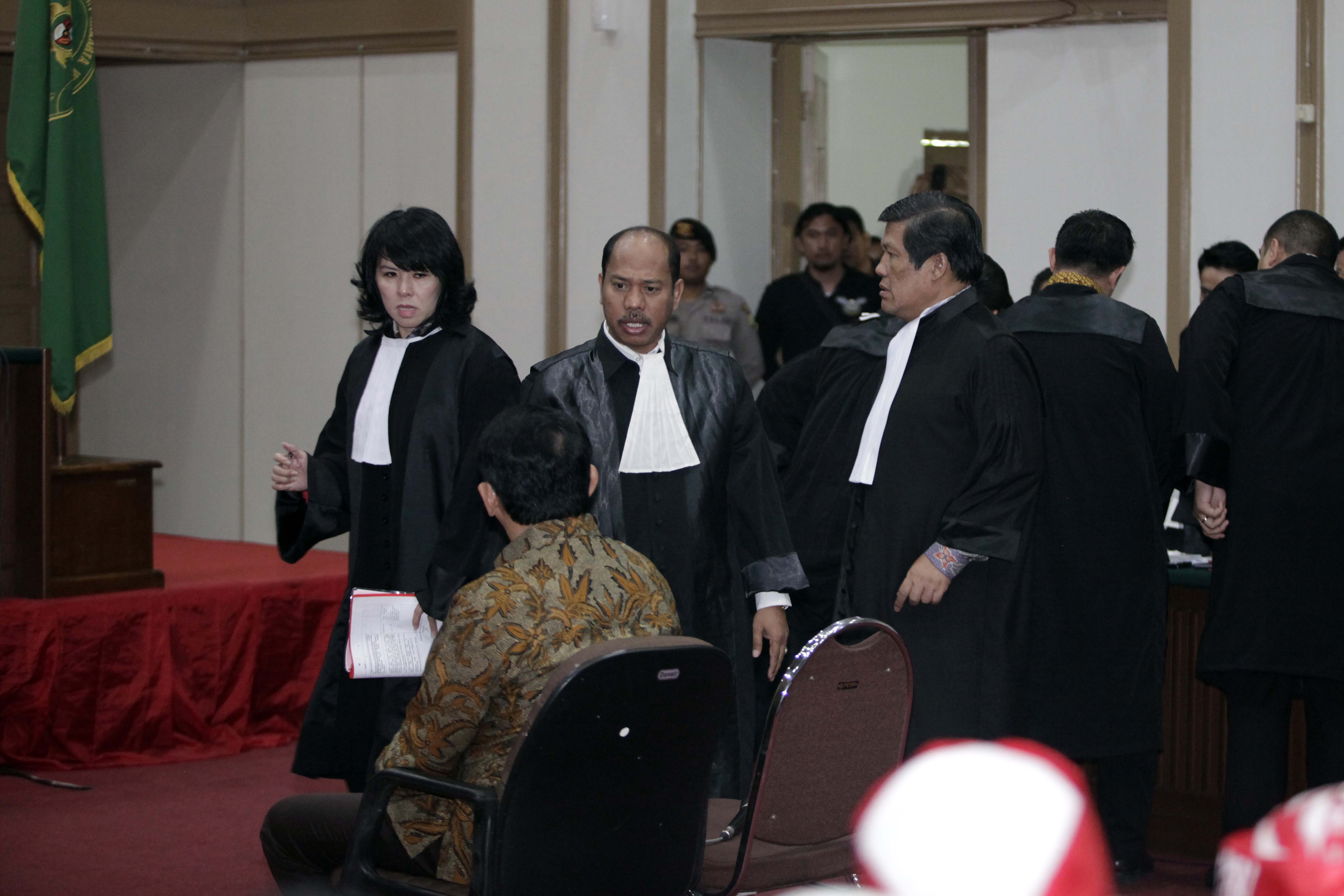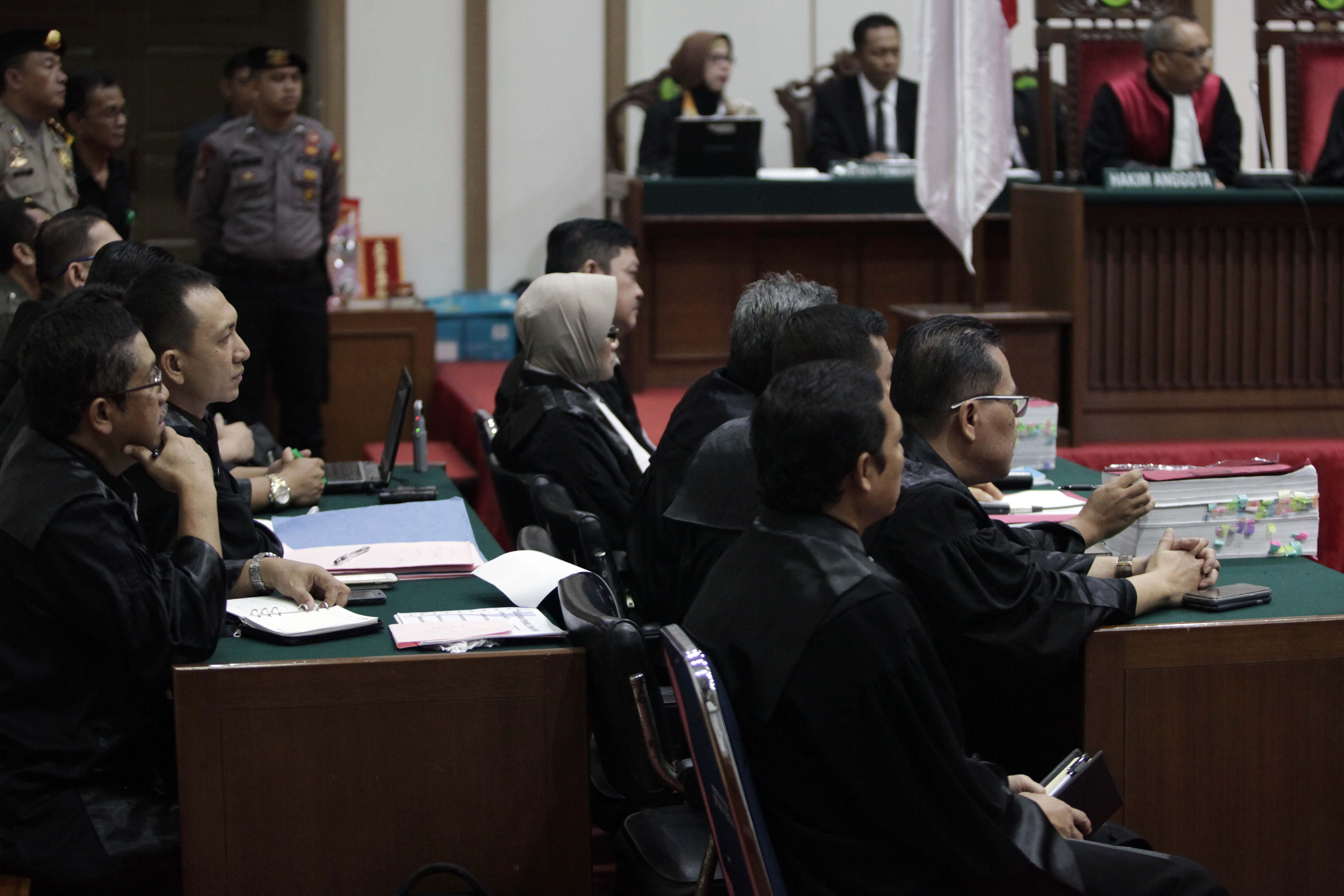 Pengacara Humprey Djemat (kedua kiri) bersiap untuk menjalani sidang dengan Terdakwa kasus dugaan penistaan agama Gubernur DKI Jakarta, Basuki Tjahaja Purnama dengan agenda pembacaan tuntutan yang digelar oleh Pengadilan Negeri Jakarta Utara di Auditorium Kementerian Pertanian, Jakarta, Selasa (11/4). Sidang tersebut ditunda hingga 20 April mendatang karena Jaksa belum selesai mengetik tuntutan. Foto: Republika/Raisan Al Farisi/POOL Foto: Raisan Al Farisi/Republika
