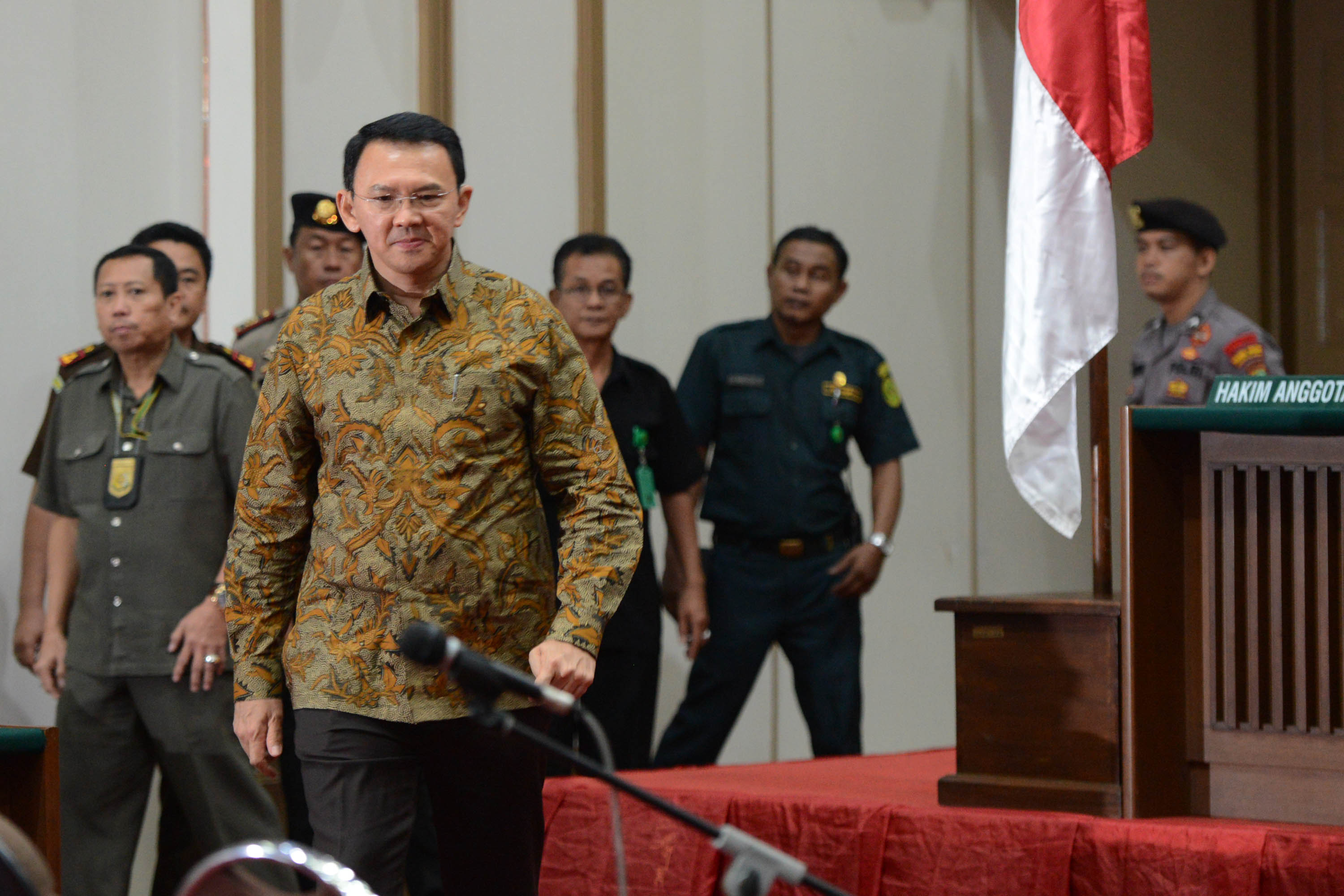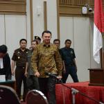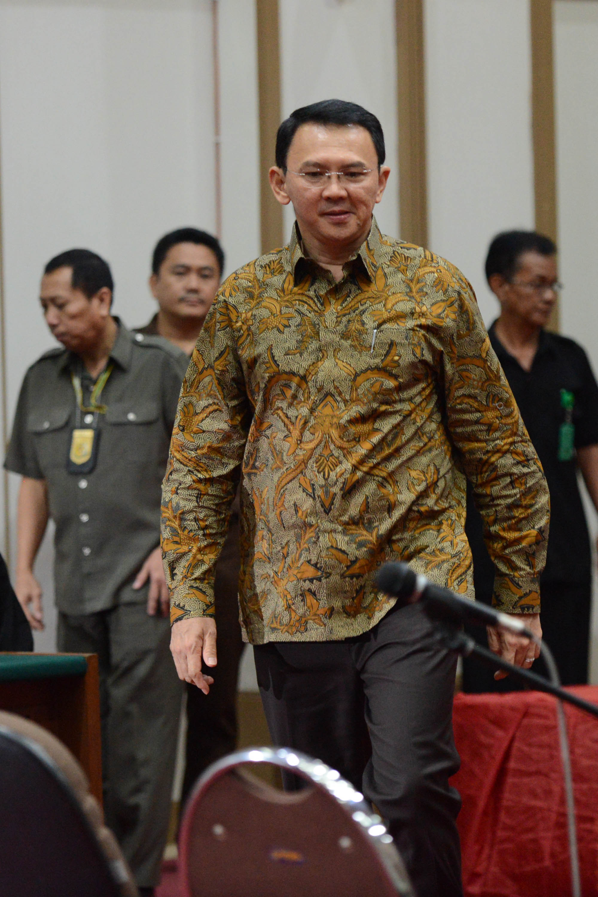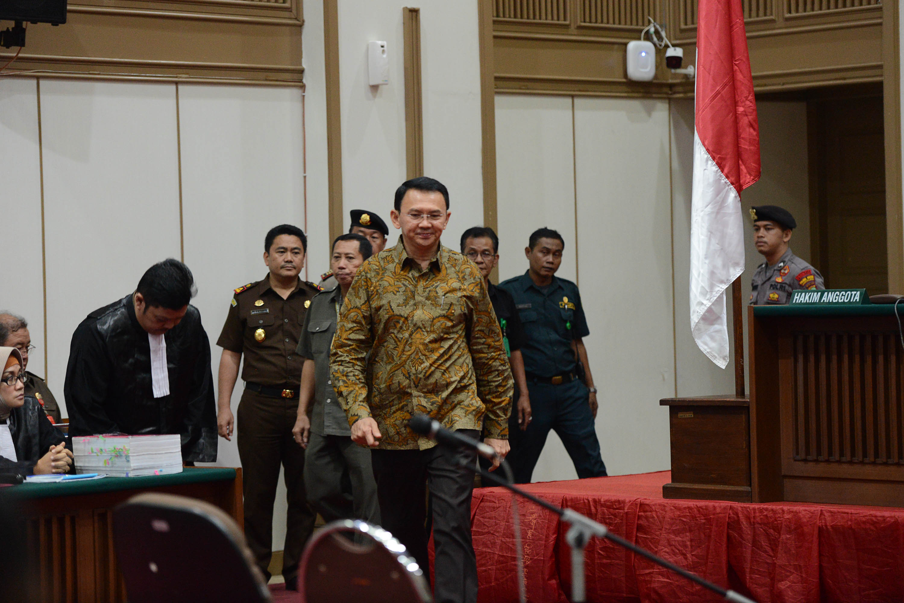 Terdakwa kasus dugaan penistaan agama Basuki Tjahaja Purnama berjalan memasuki ruangan untuk menjalani sidang lanjutan dengan agenda pembacaan tuntutan di ruang auditorium Kementerian Pertanian, Jakarta, Selasa (11/4). Sidang tersebut ditunda hingga 20 April mendatang karena Jaksa belum selesai mengetik tuntutan. Foto: Republika/Raisan Al Farisi/POOL