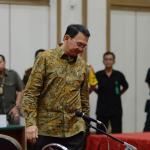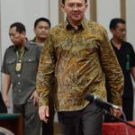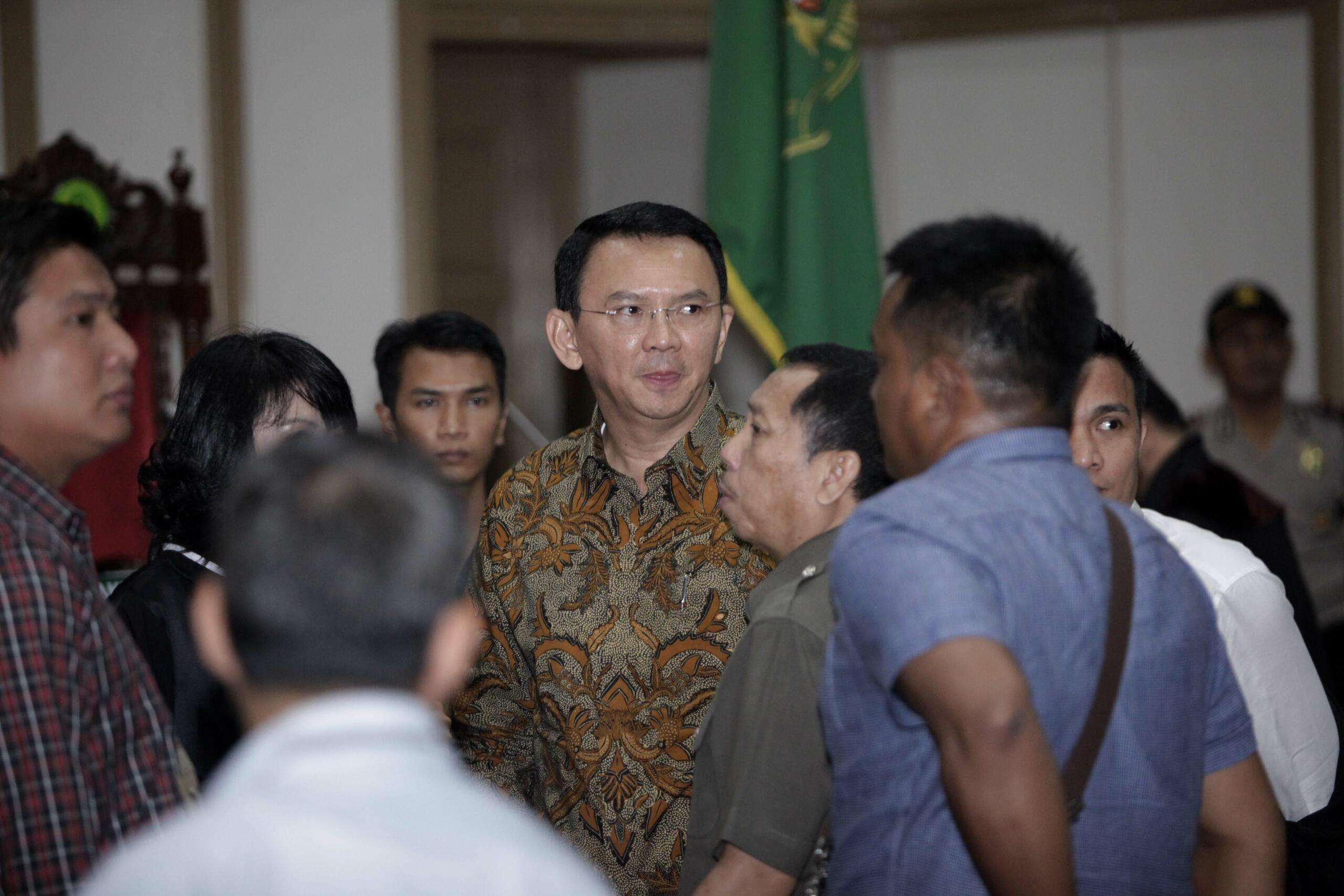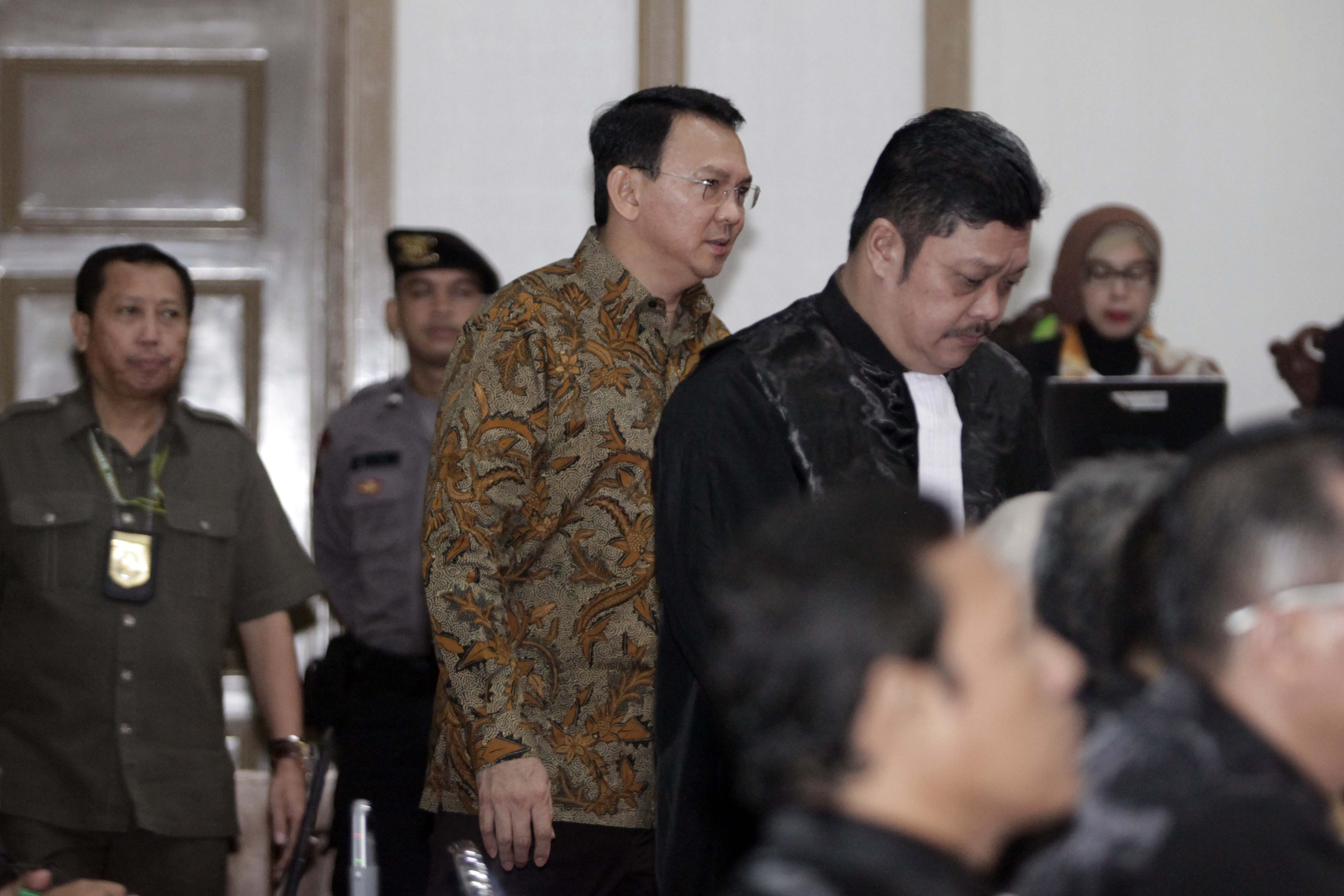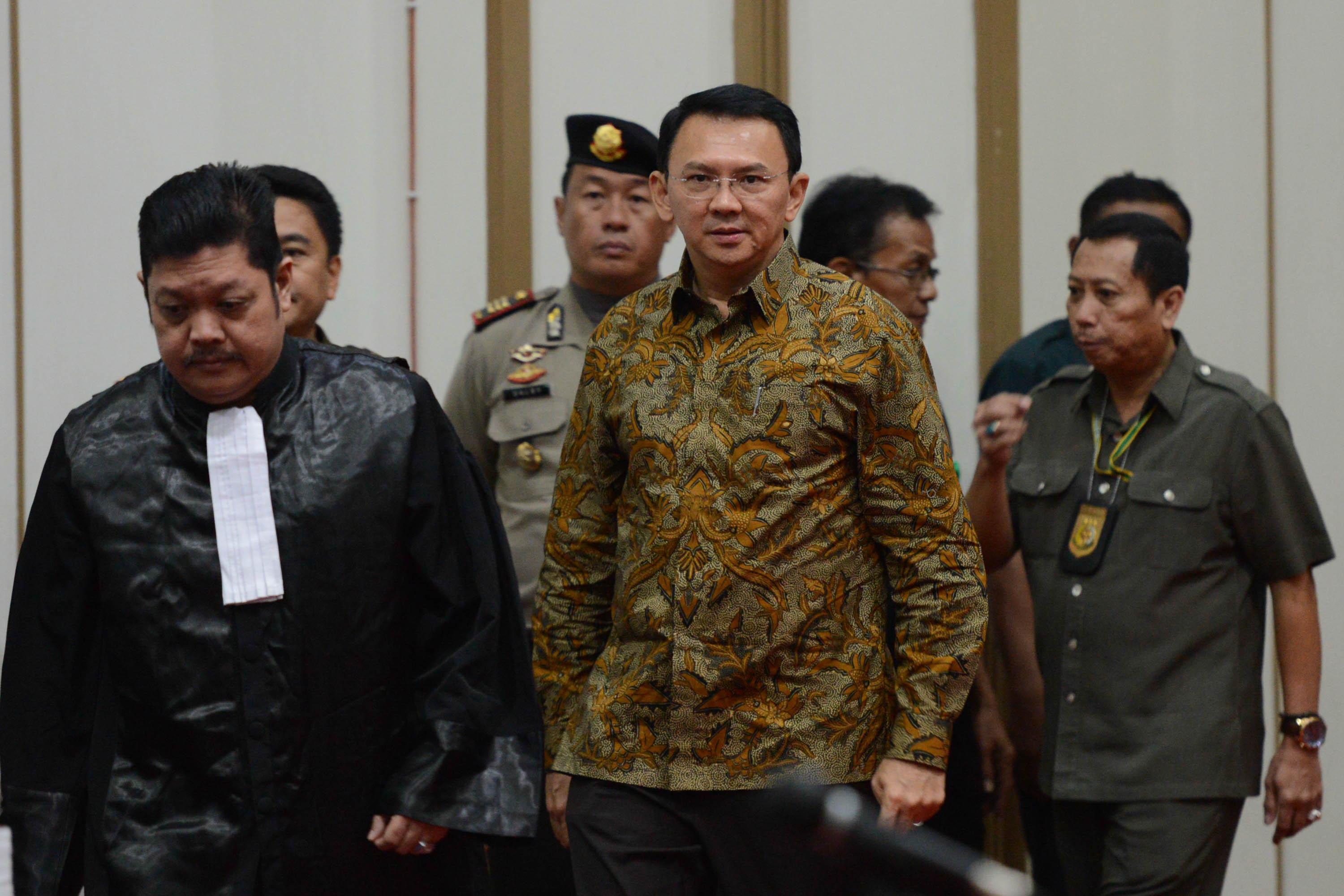 Terdakwa kasus dugaan penistaan agama Basuki Tjahaja Purnama berjalan memasuki ruangan untuk menjalani sidang lanjutan dengan agenda pembacaan tuntutan di ruang auditorium Kementerian Pertanian, Jakarta, Selasa (11/4). Sidang tersebut ditunda hingga 20 April mendatang karena Jaksa belum selesai mengetik tuntutan. Foto: Republika/Raisan Al Farisi/POOL