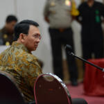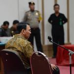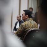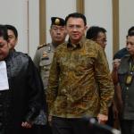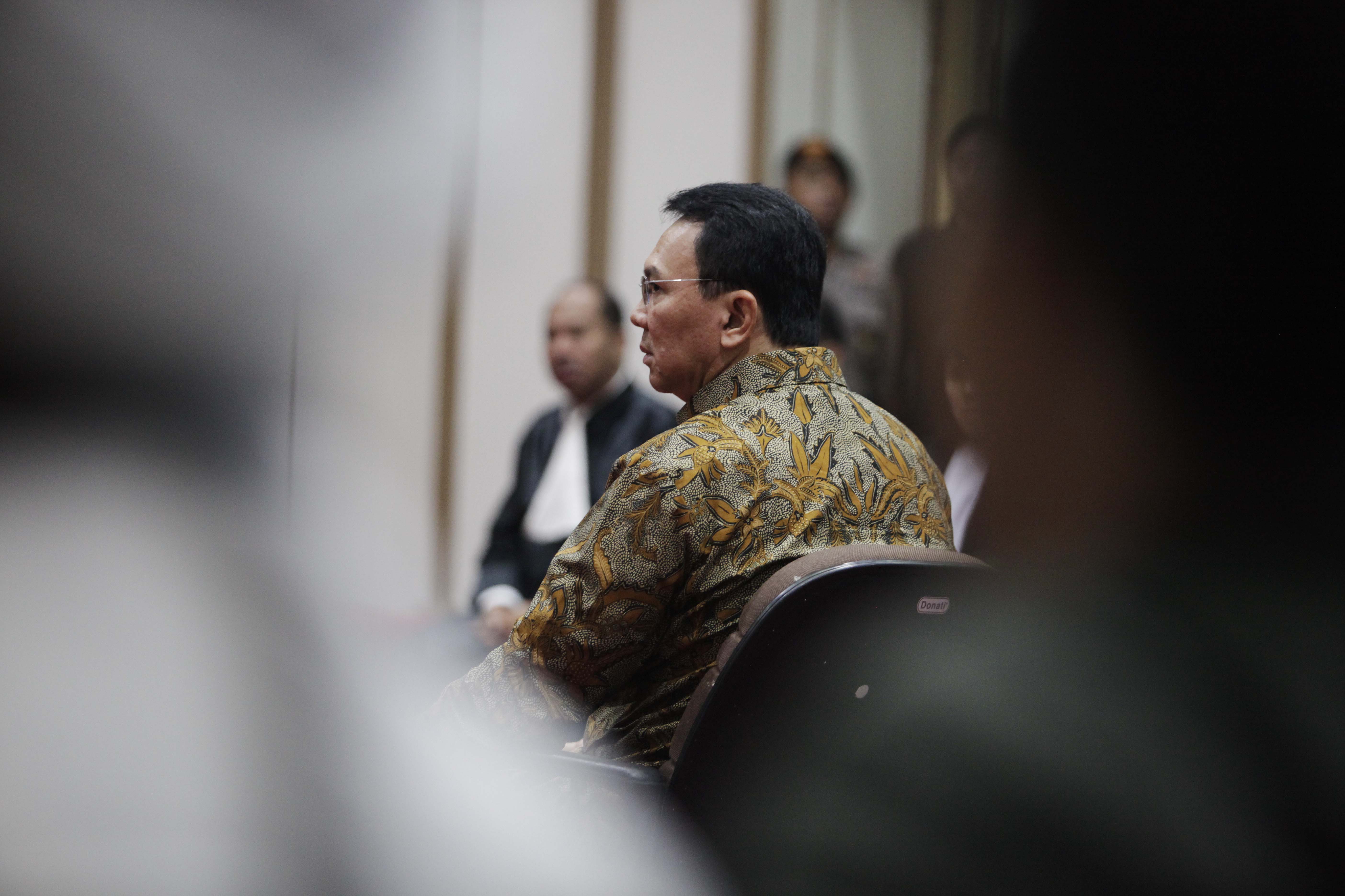 Terdakwa kasus dugaan penistaan agama Basuki Tjahaja Purnama menjalani sidang lanjutan dengan agenda pembacaan tuntutan di ruang auditorium Kementerian Pertanian, Jakarta, Selasa (11/4). Sidang tersebut ditunda hingga 20 April mendatang karena Jaksa belum selesai mengetik tuntutan. Foto: Republika/Raisan Al Farisi/POOL
