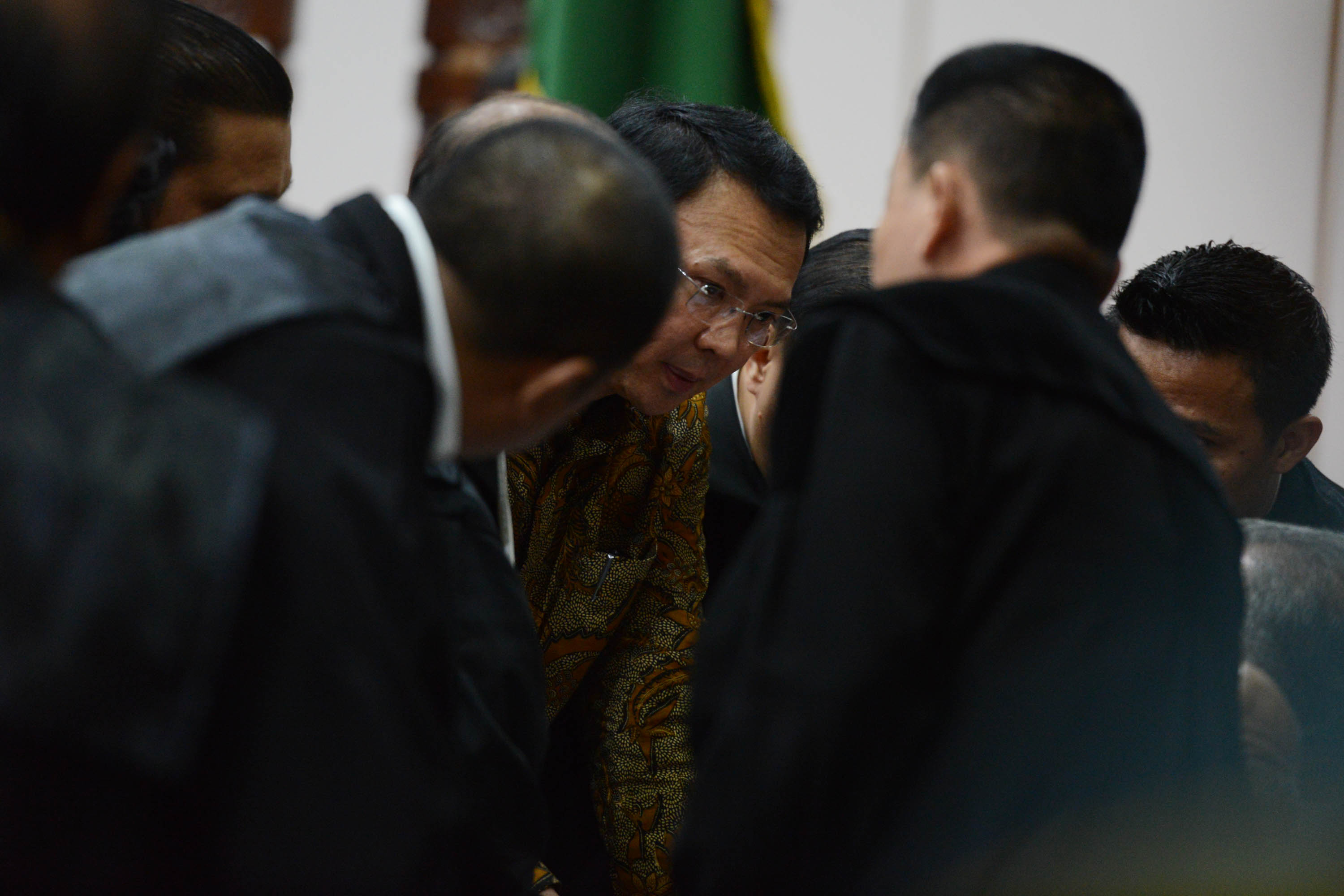Terdakwa kasus dugaan penistaan agama Basuki Tjahaja Purnama berbincang bersama kuasa hukumnya saat menjalani sidang lanjutan dengan agenda pembacaan tuntutan di ruang auditorium Kementerian Pertanian, Jakarta, Selasa (11/4). Sidang tersebut ditunda hingga 20 April mendatang karena Jaksa belum selesai mengetik tuntutan. Foto: Republika/Raisan Al Farisi/POOL