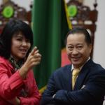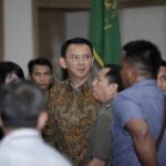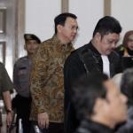 Terdakwa kasus dugaan penistaan agama Basuki Tjahaja Purnama atau Ahok bersama tim penasehat hukumnya seusai menjalani sidang lanjutan dengan agenda pembacaan tuntutan di Pengadilan Jakarta Utara, Auditorium Kementan, Jakarta, Selasa (11/4). Dengan alasan belum selesai pengetikan tuntutan, Jaksa Penuntut Umum memohon Majelis Hakim untuk menunda persidangan pada Kamis (20/4) mendatang. Foto: Media Indonesia-POOL/Rommy Pujianto