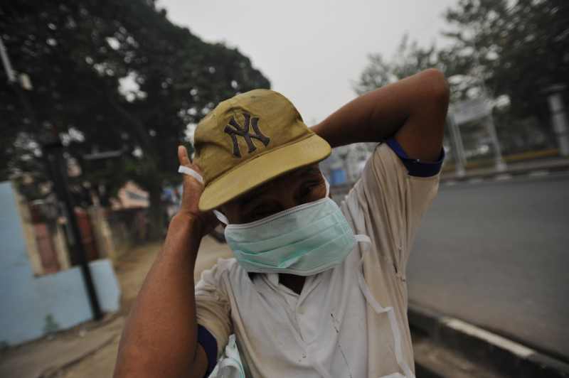 Seorang warga mengenakan masker yang diberikan secara gratis oleh DInas Kesehatan Pemprov Jambi di Jalan A. Rahman Saleh, Jambi, Rabu (9/9). Pembagian masker itu untuk mengantisipasi dampak kabut asap yang menyebabkan timbulnya penyakit infeksi saluran pernafasan atas (ISPA). ANTARA FOTO/Wahyu Putro A
